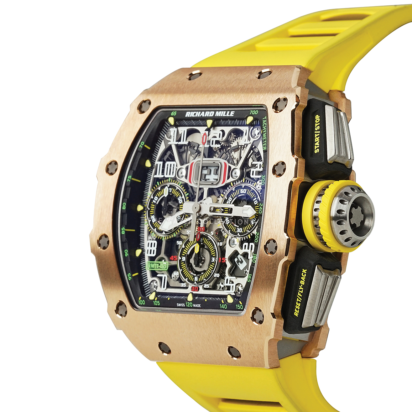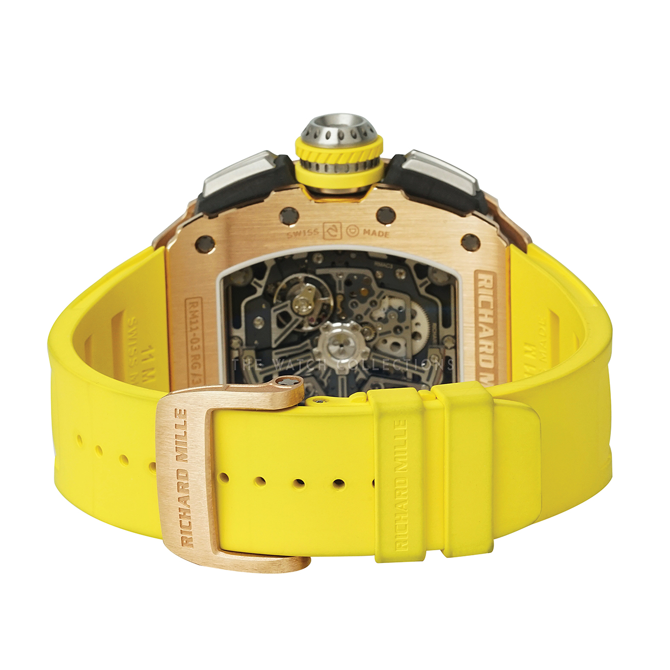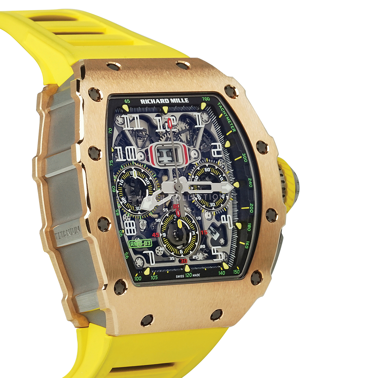 The Richard Mille RM11-03 Rose Gold Titanium features a rose gold and titanium case with skeleton dial and flyback chronograph function. Exclusive and sporty.