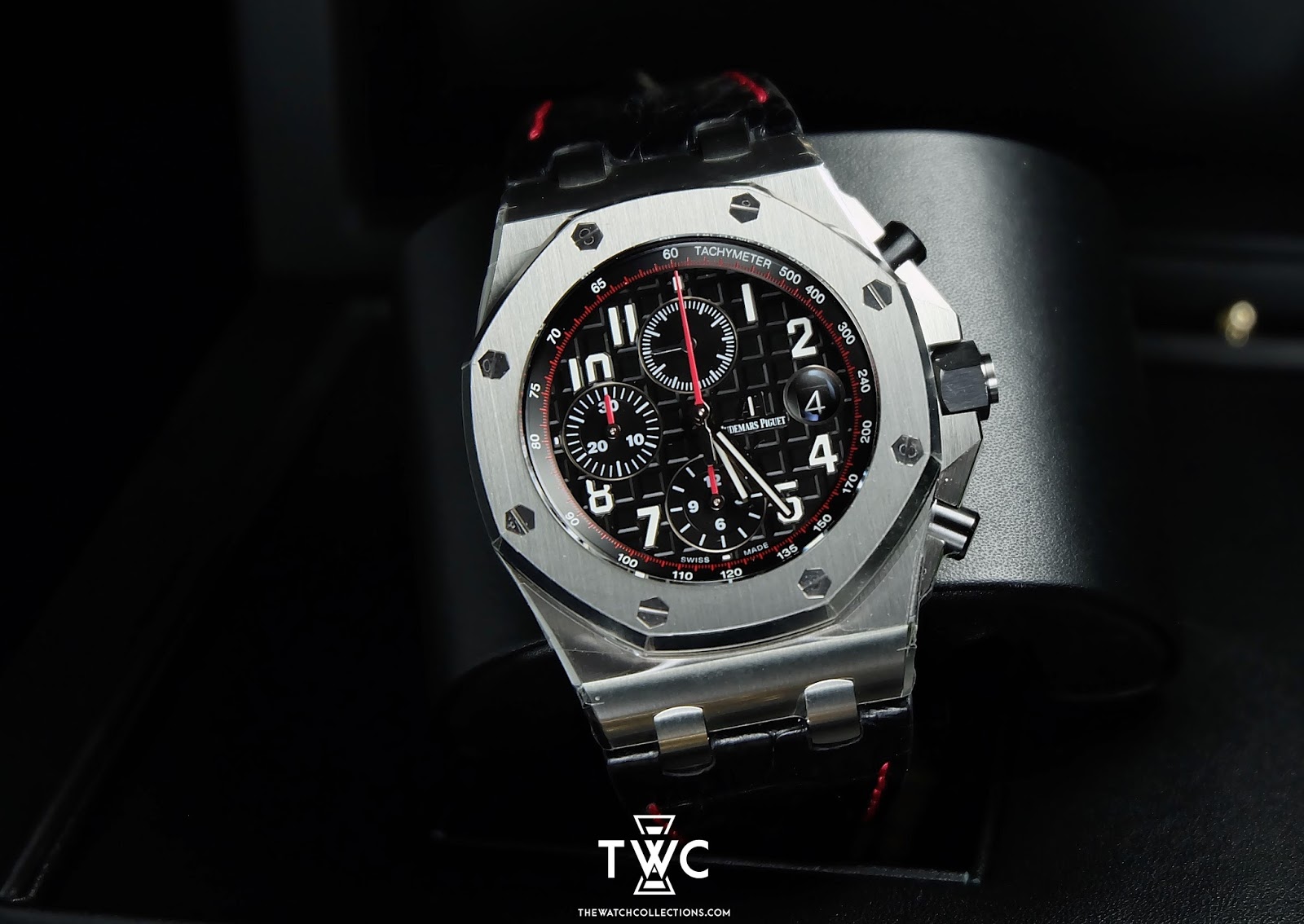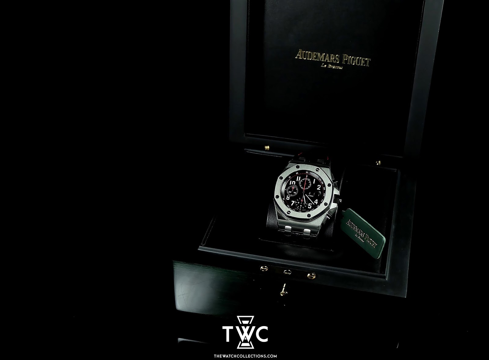 The Royal Oak Offshore Black Panda features a black and white dial with stainless steel case and rubber strap. Sporty, masculine, and highly popular among collectors.