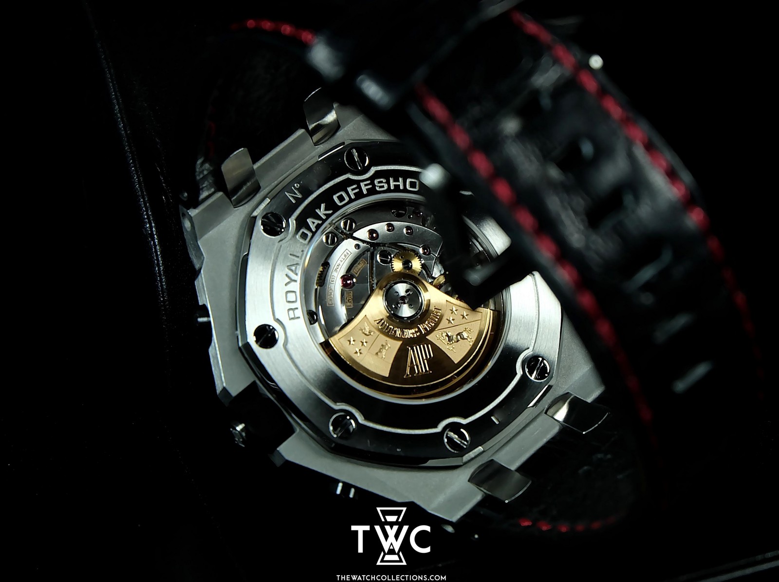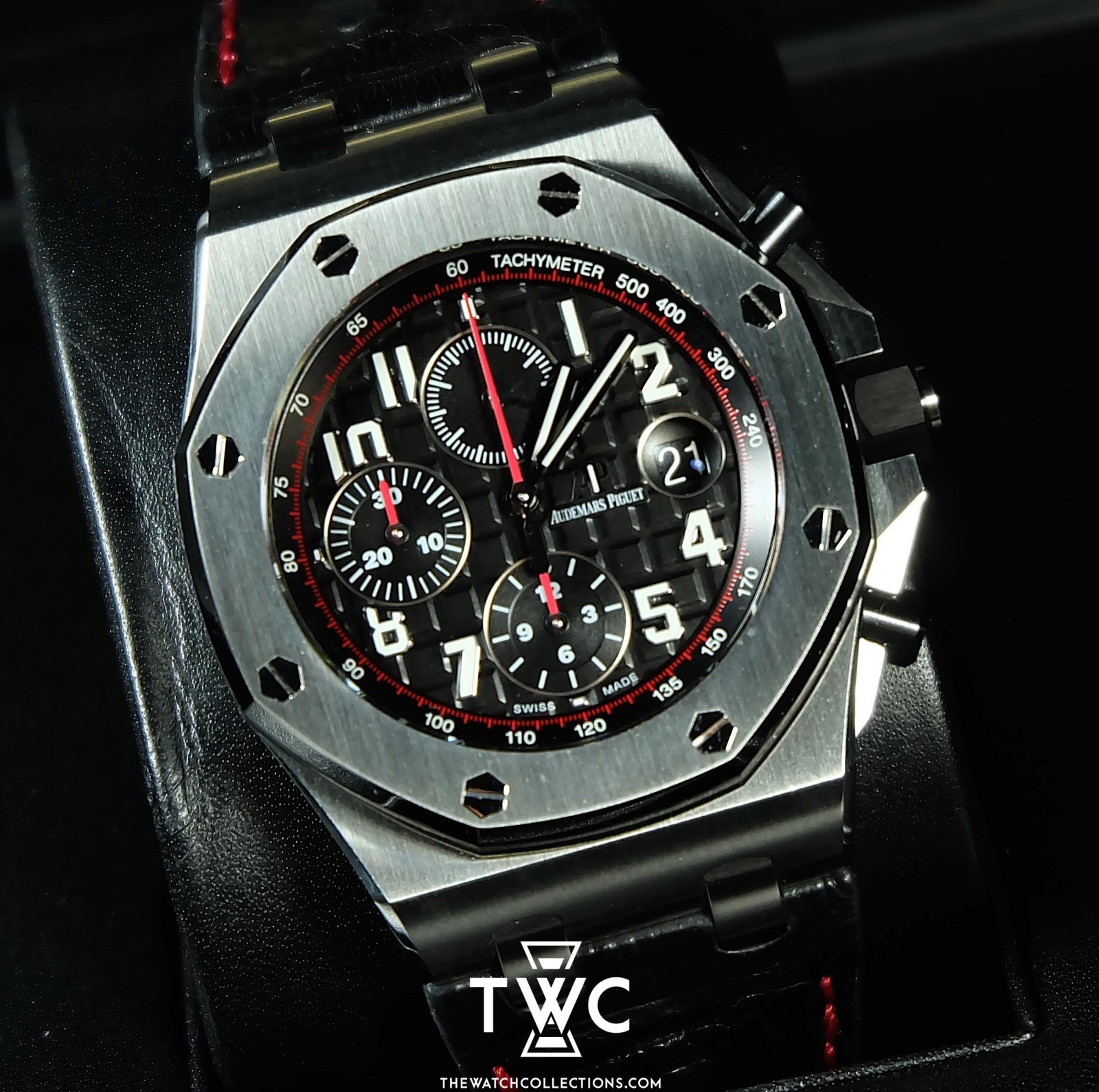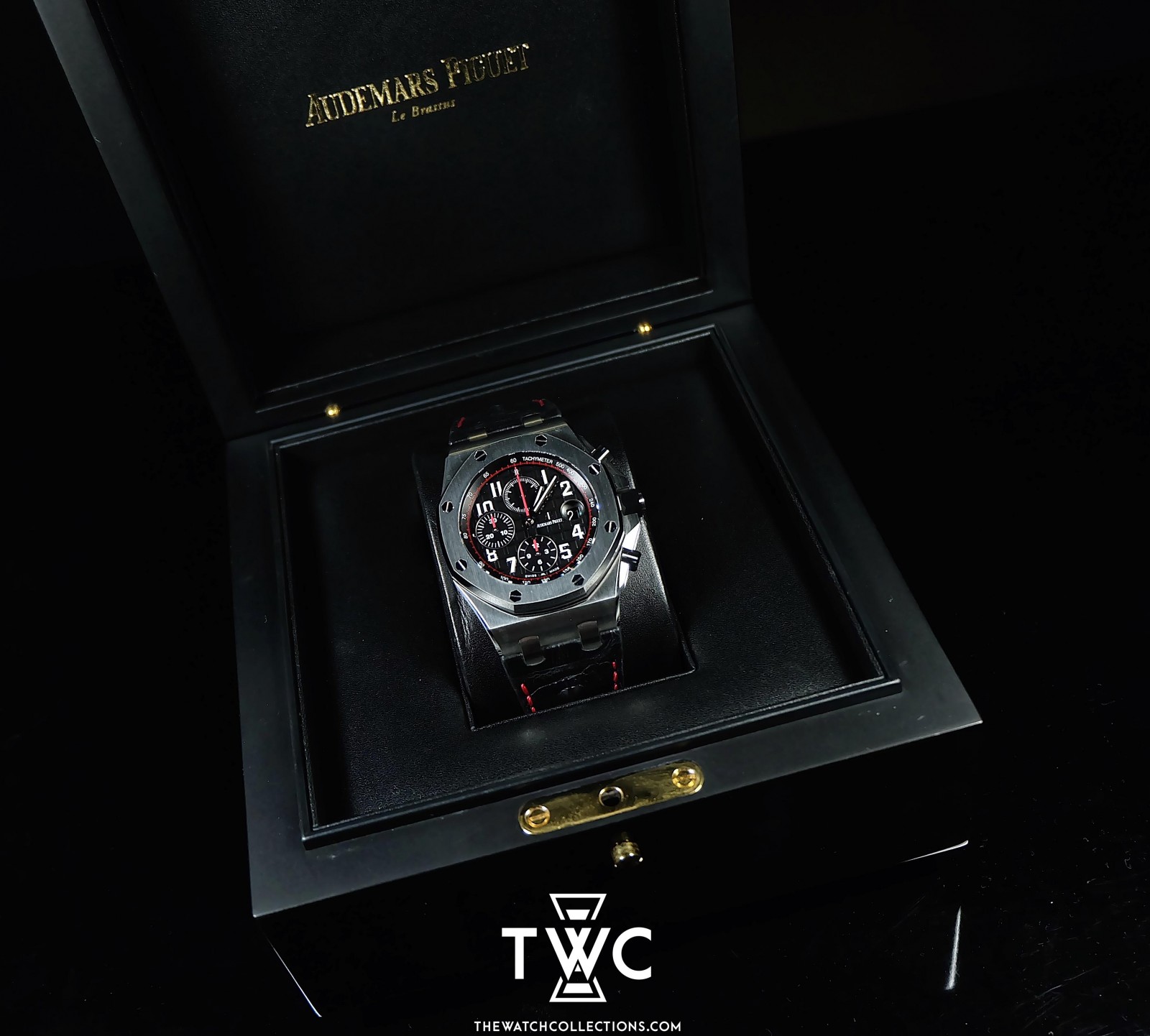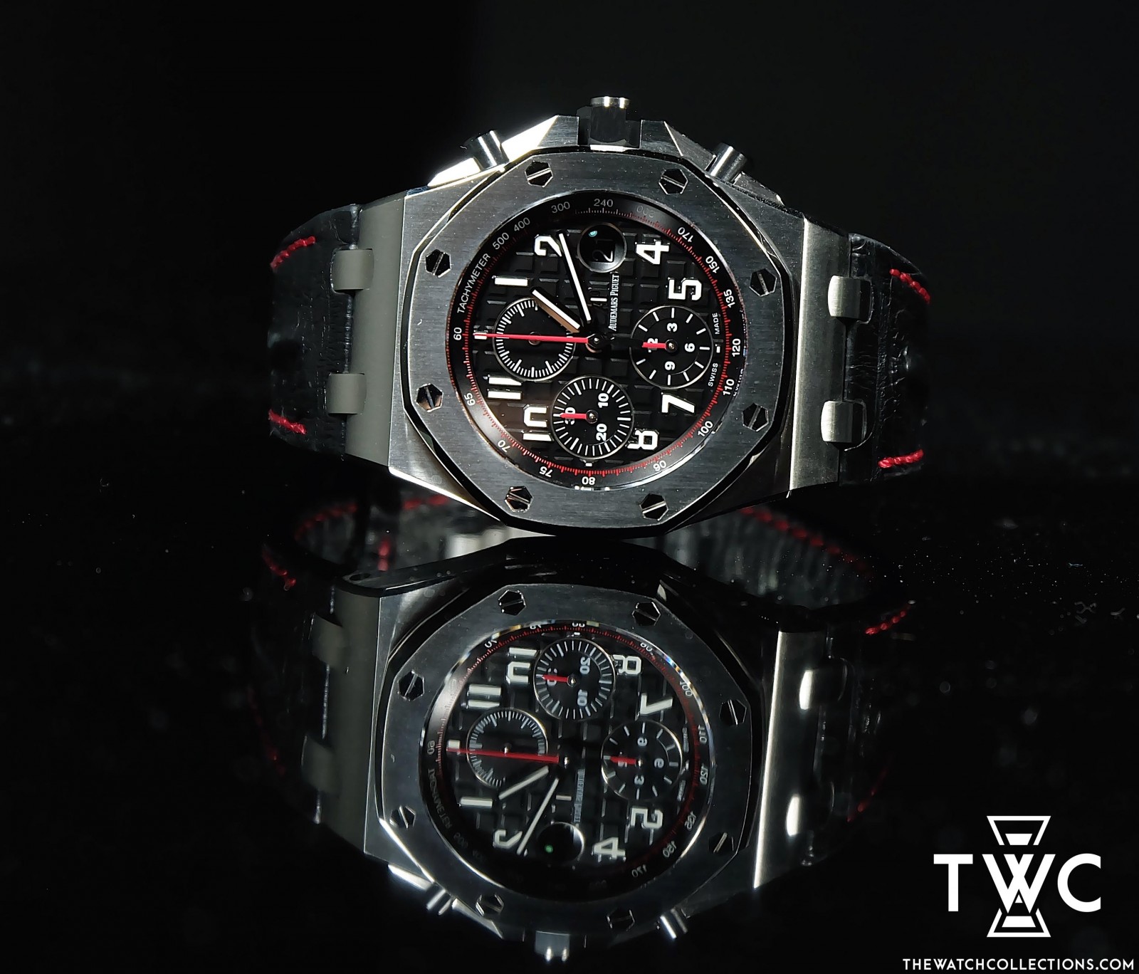 The Audemars Piguet Royal Oak Offshore Black Red features a black case with sporty red accents. Its dial includes clear chronograph functions, emphasizing the aggressive and modern character of the Royal Oak Offshore collection.