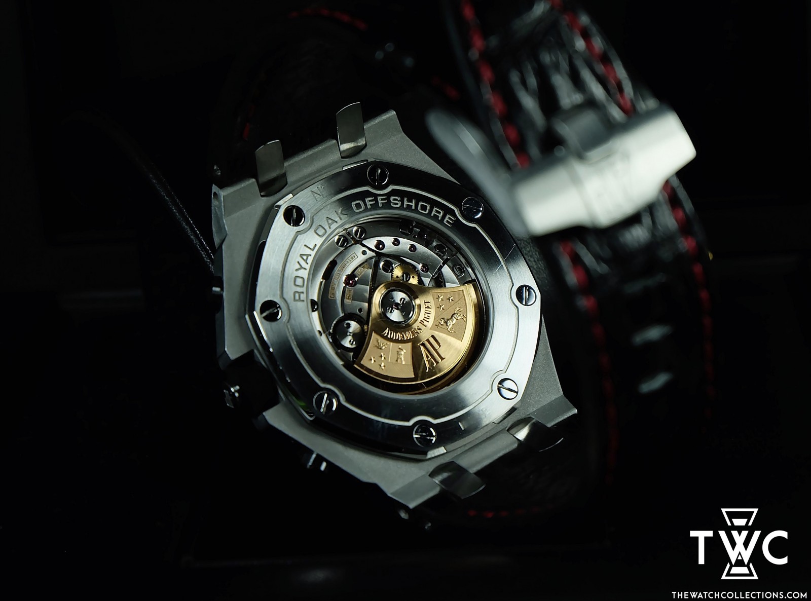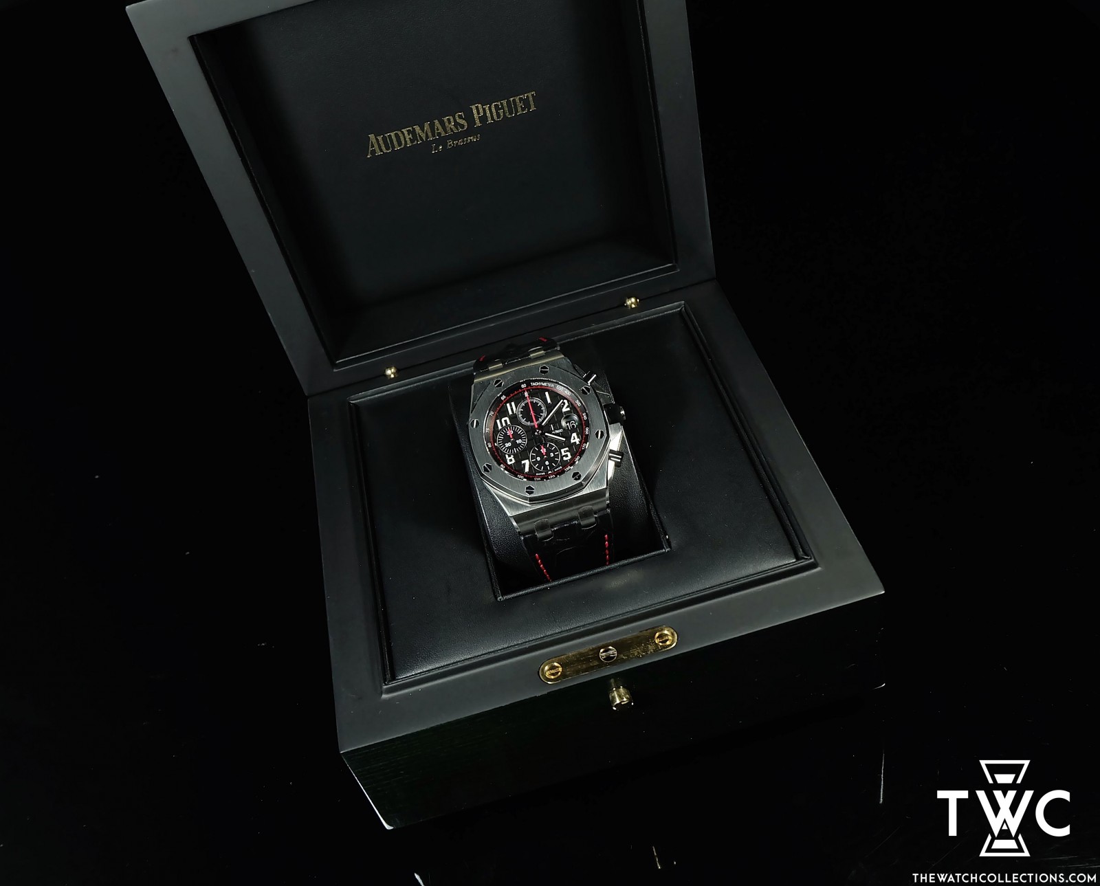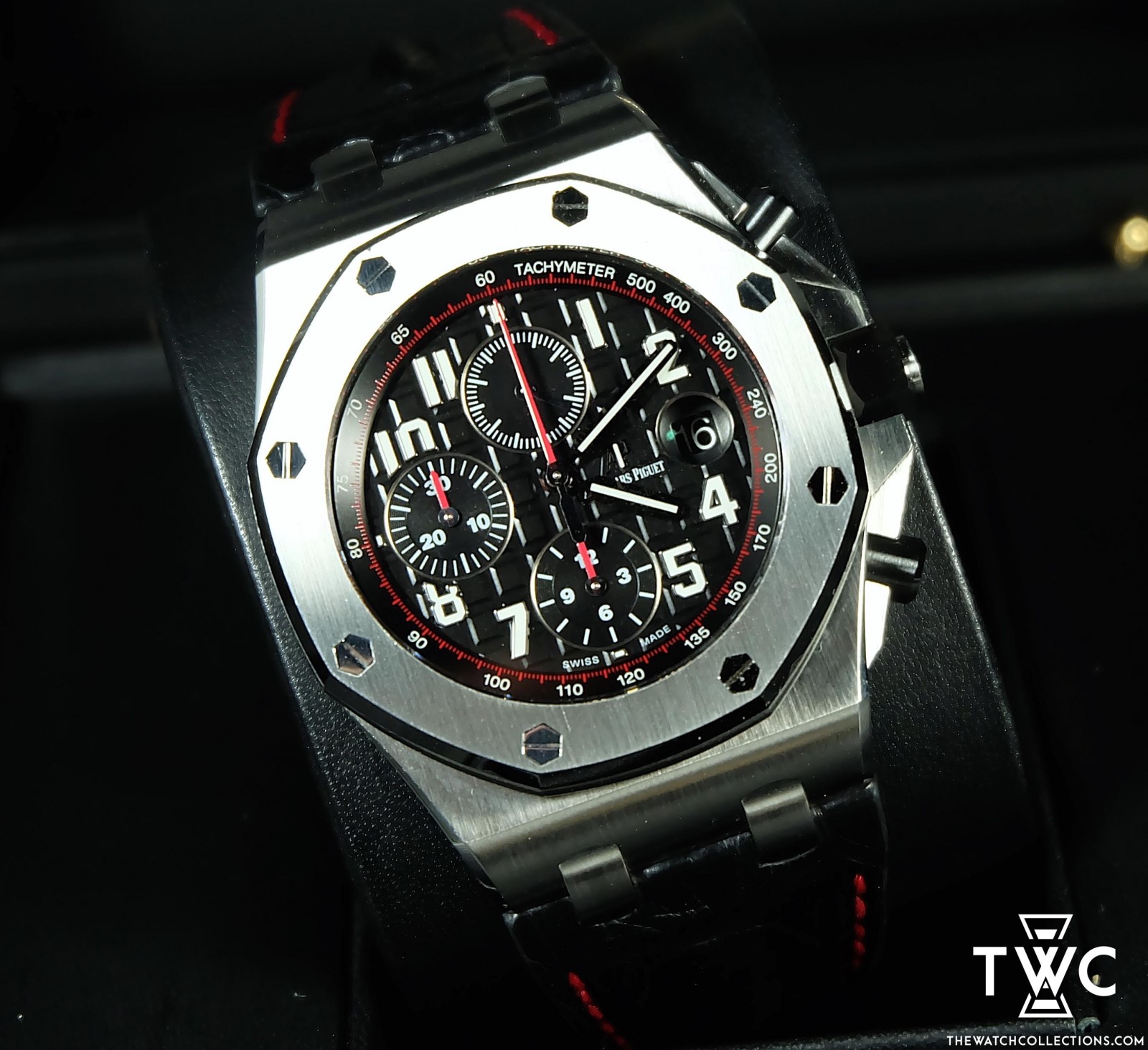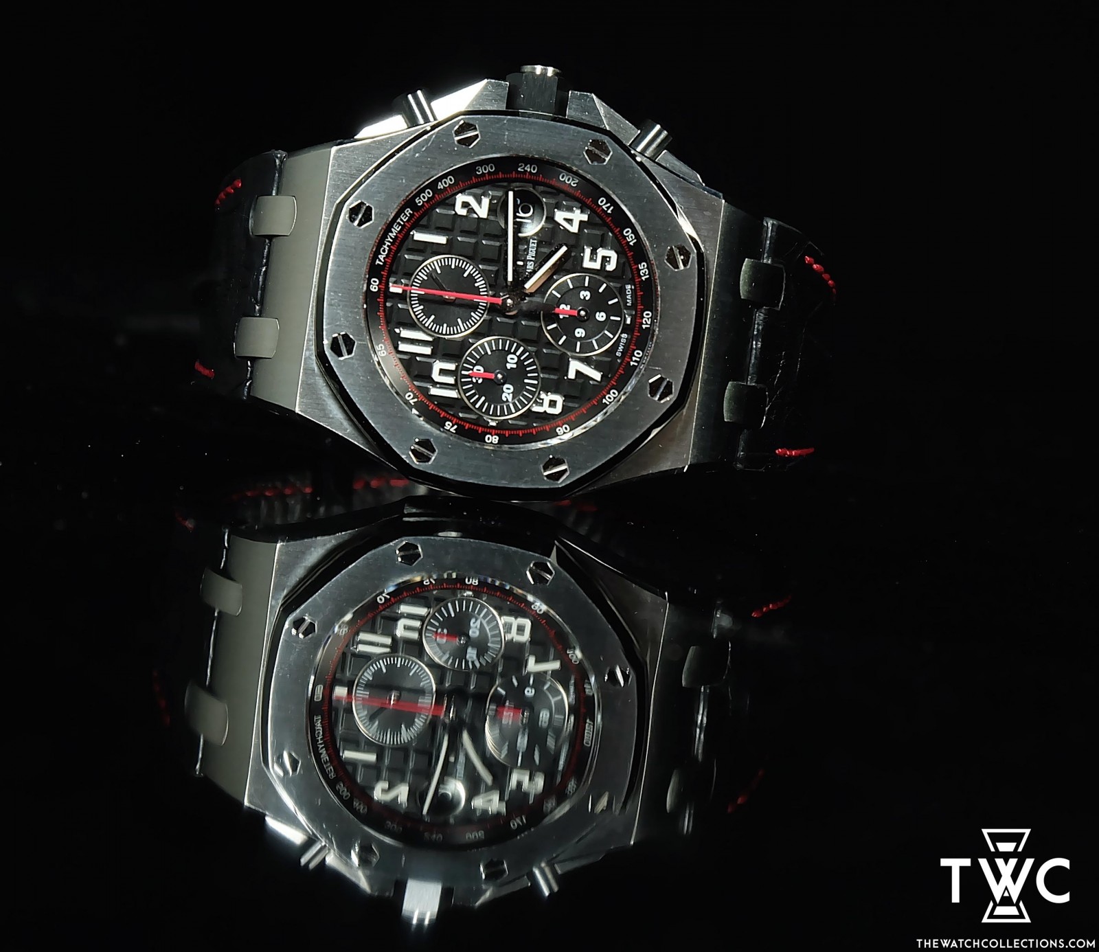The Royal Oak Offshore Black Red features a stainless steel case with black dial and red accents. Sporty, modern, and characteristic of Royal Oak Offshore.