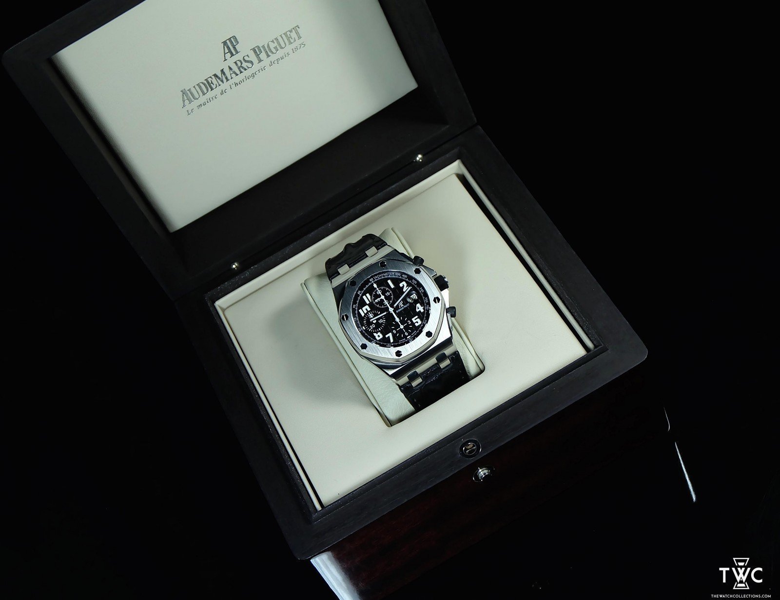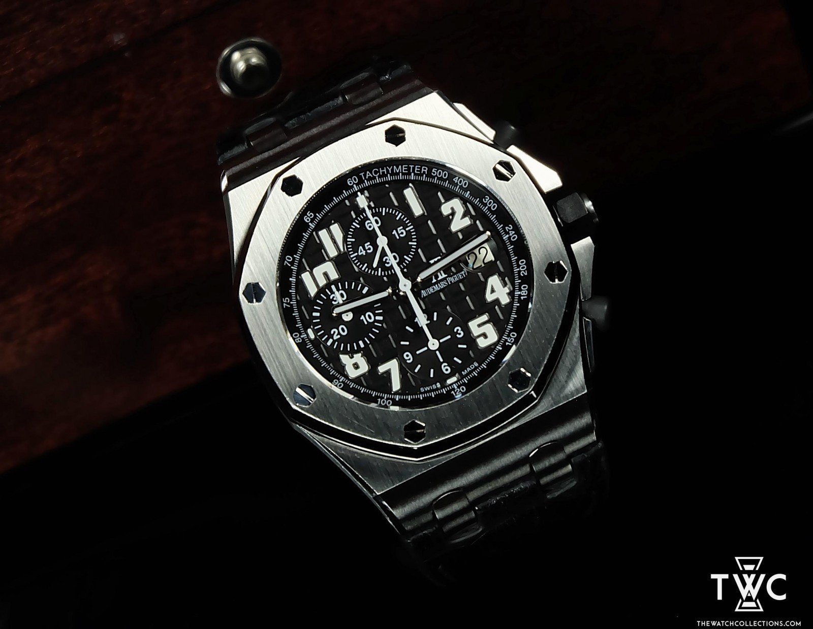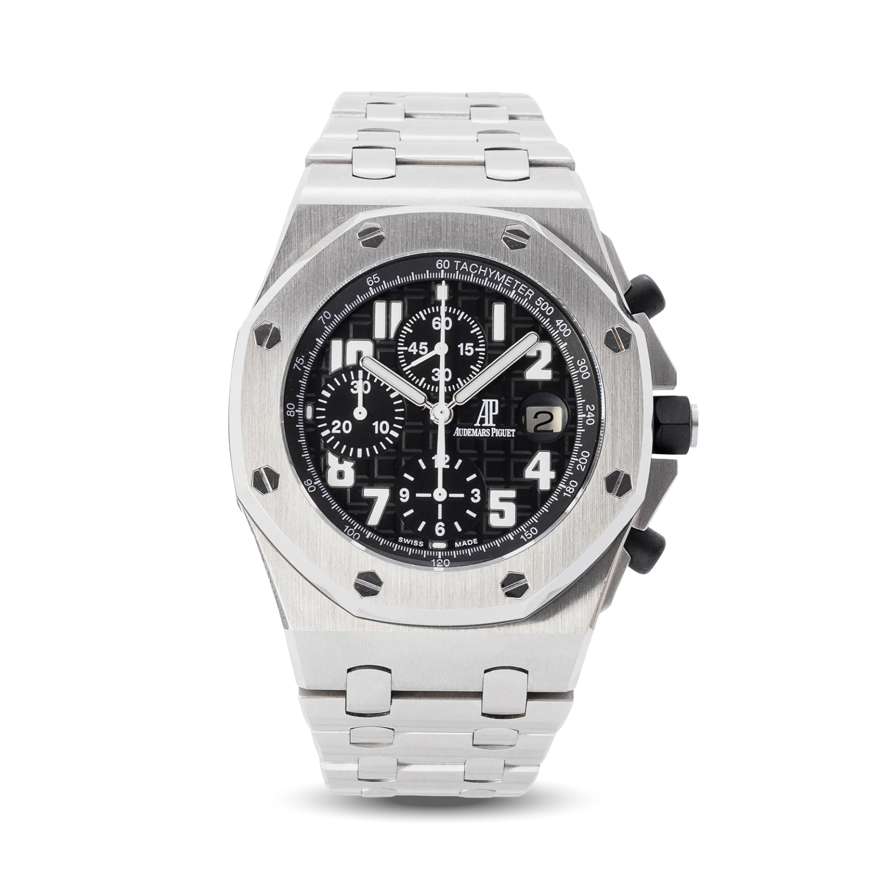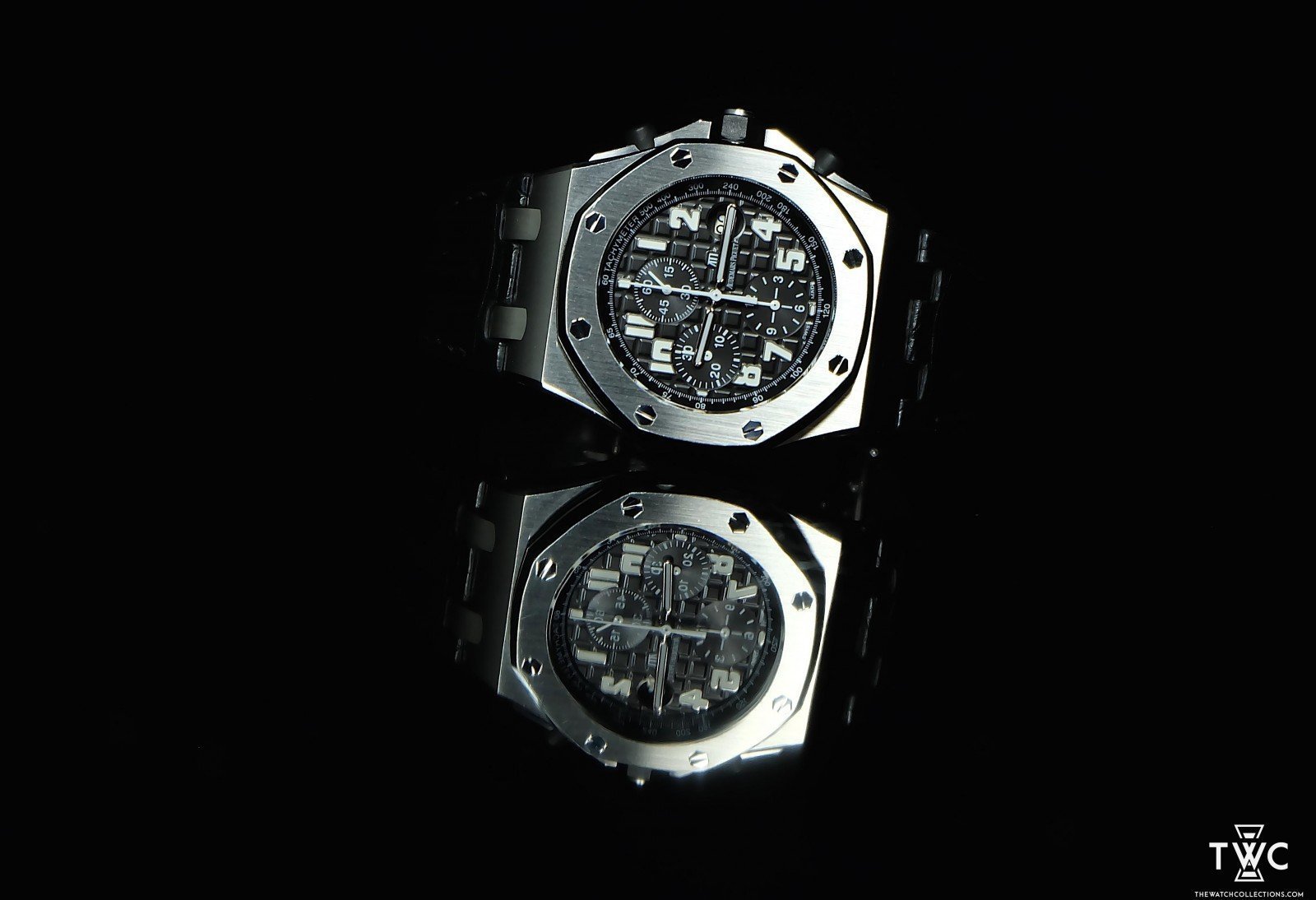 The Royal Oak Offshore Black Themes features a stainless steel case with black dial and rubber strap. Modern, masculine, and sporty.