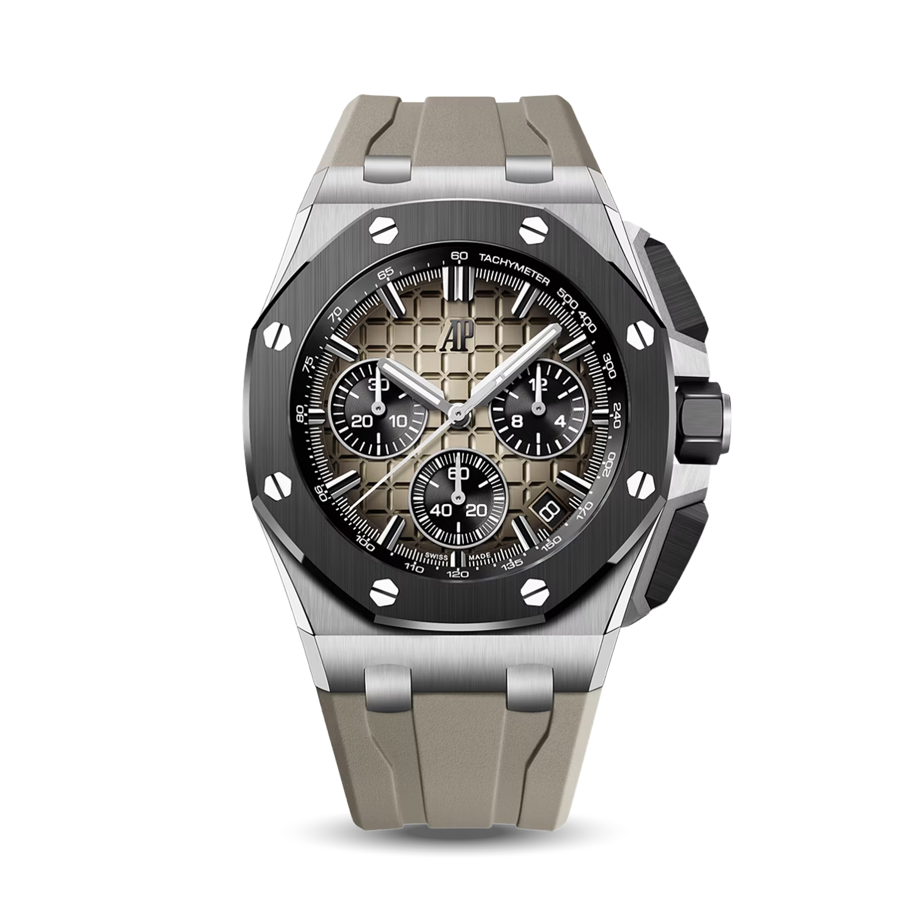 The Audemars Piguet Royal Oak Offshore Chronograph 43mm “Smoked Grey” features a sophisticated grey dial paired with a robust stainless steel case. Its 43mm size offers a strong masculine presence. The sporty design with chronograph functions makes it suitable for daily wear or formal events. Modern aesthetics and fine detailing make this a striking luxury timepiece.