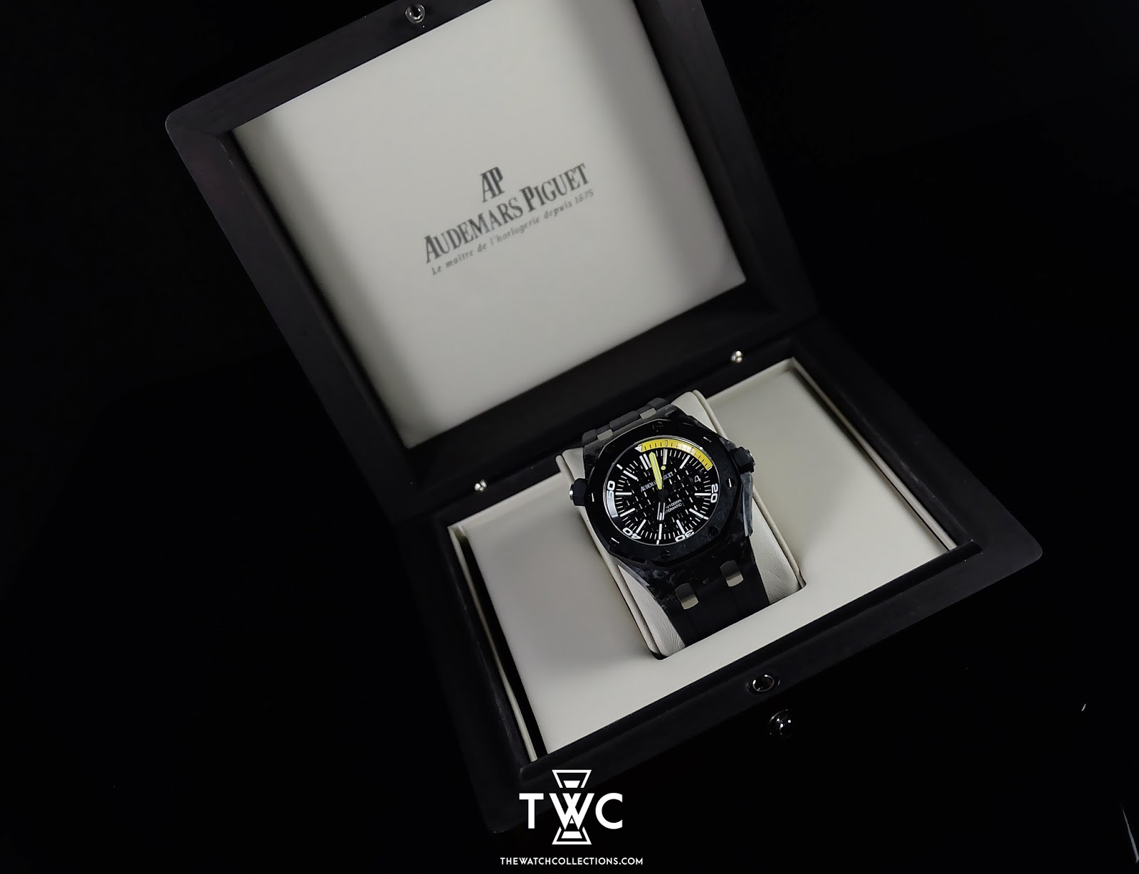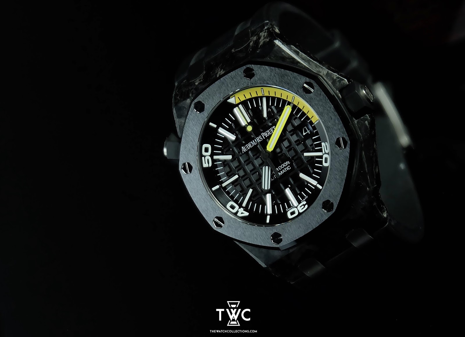 The Royal Oak Offshore Diver Forged Carbon features a forged carbon case with black dial and rubber strap. Lightweight, sporty, and water-resistant for diving activities.