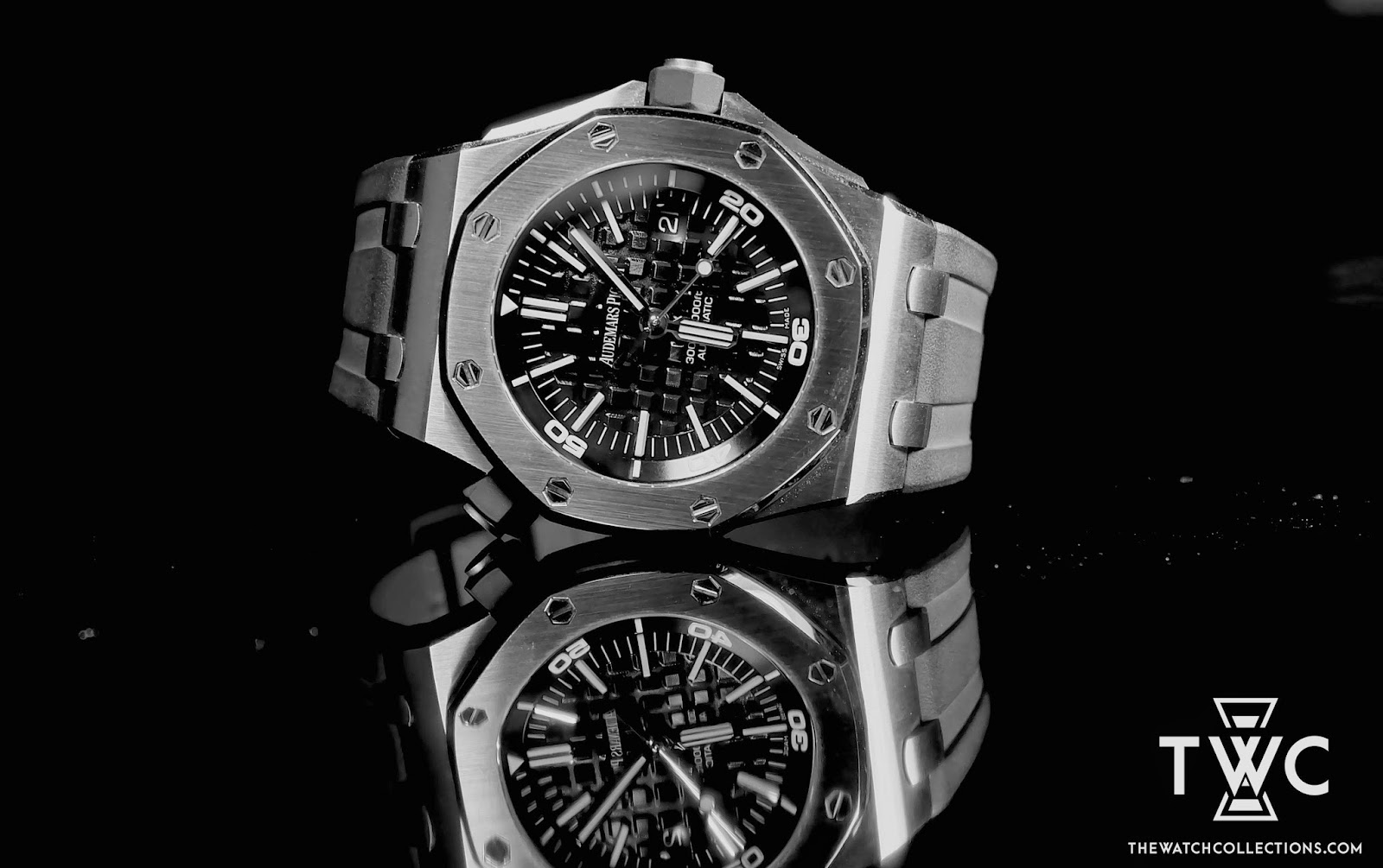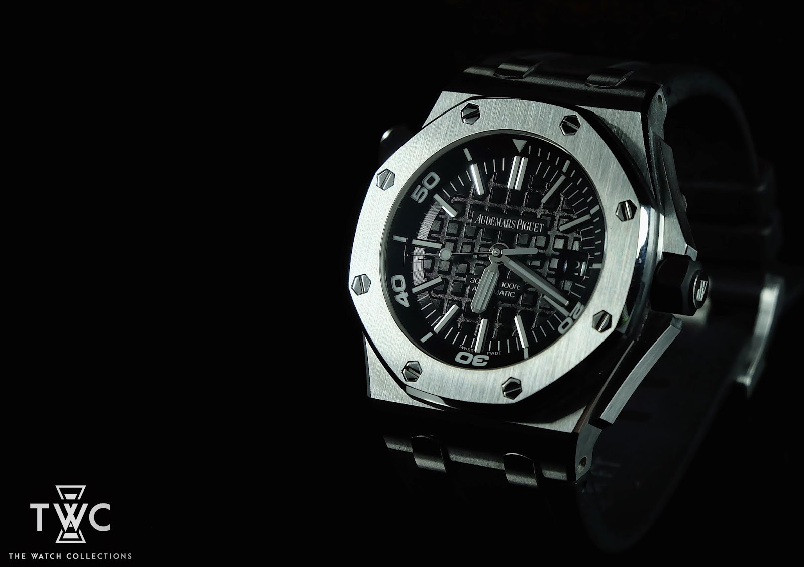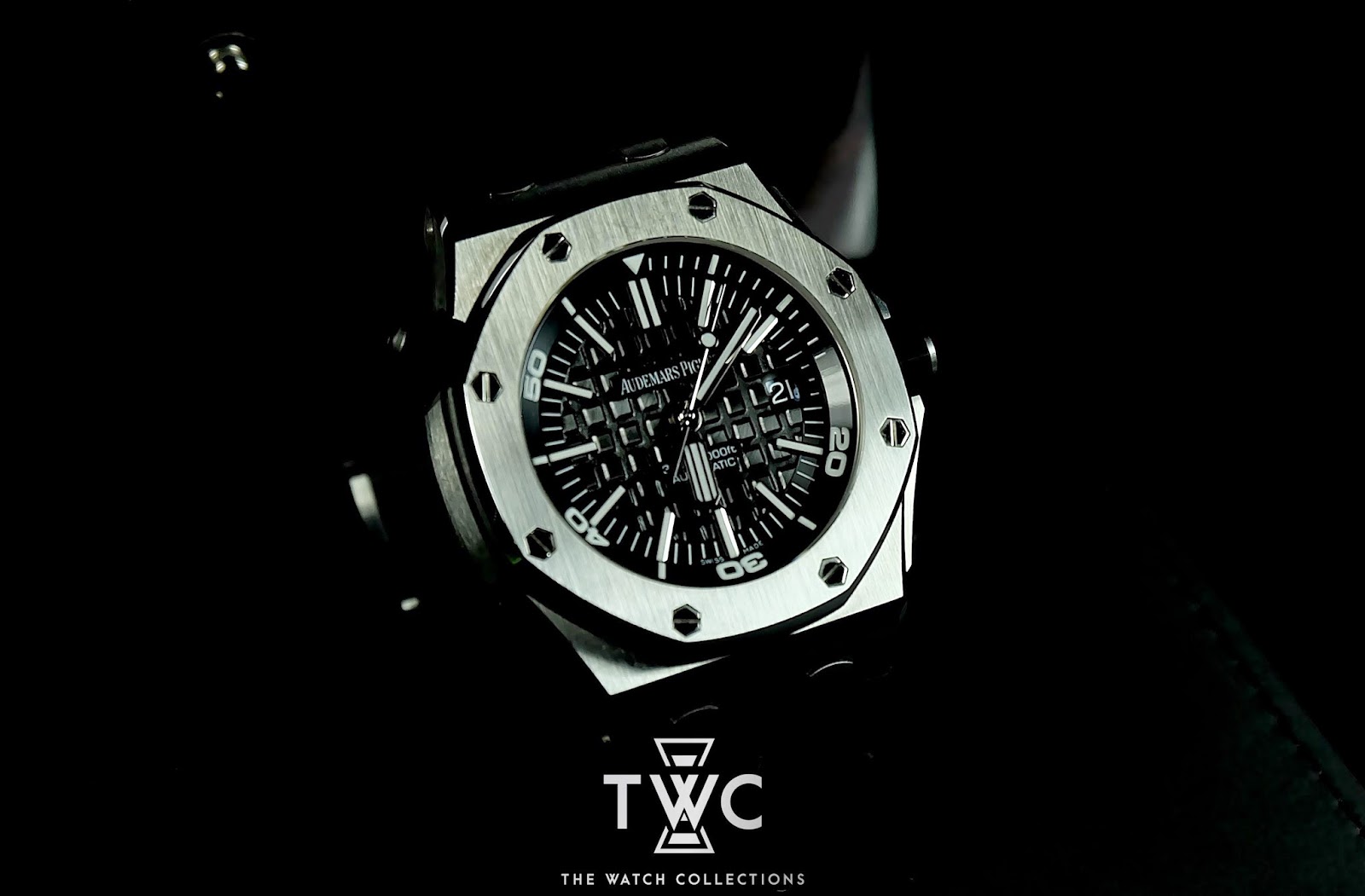 The Royal Oak Offshore Diver “H” features a stainless steel case and black dial with rotating bezel. Water-resistant and ideal for diving activities.