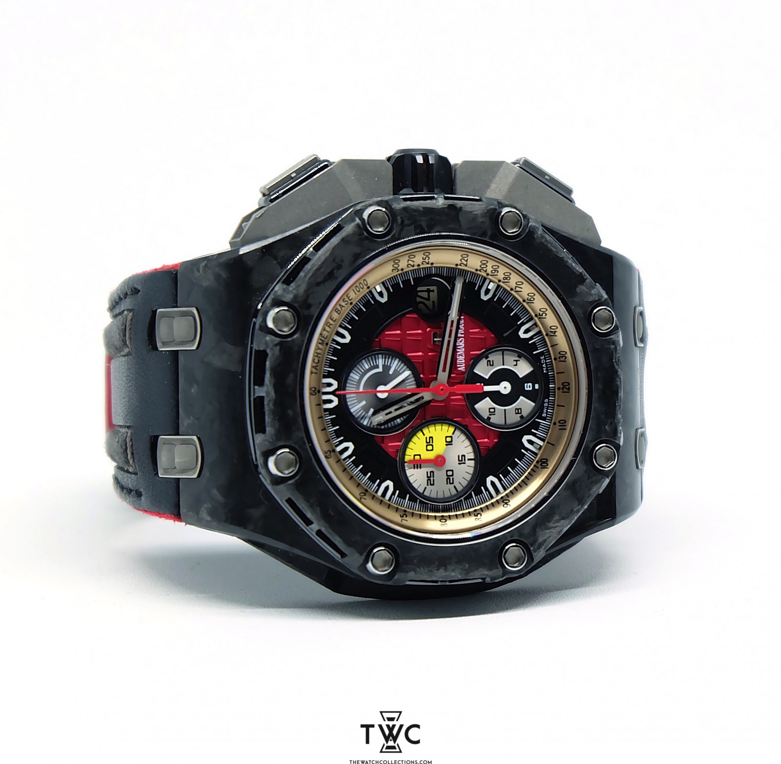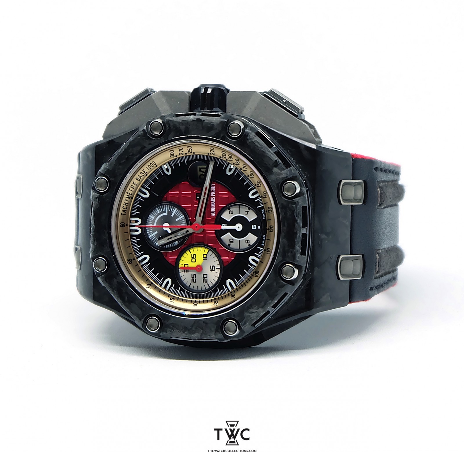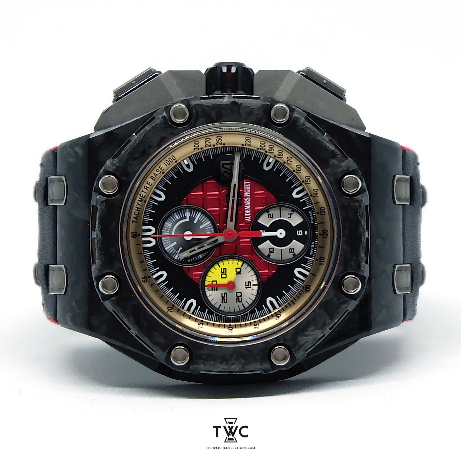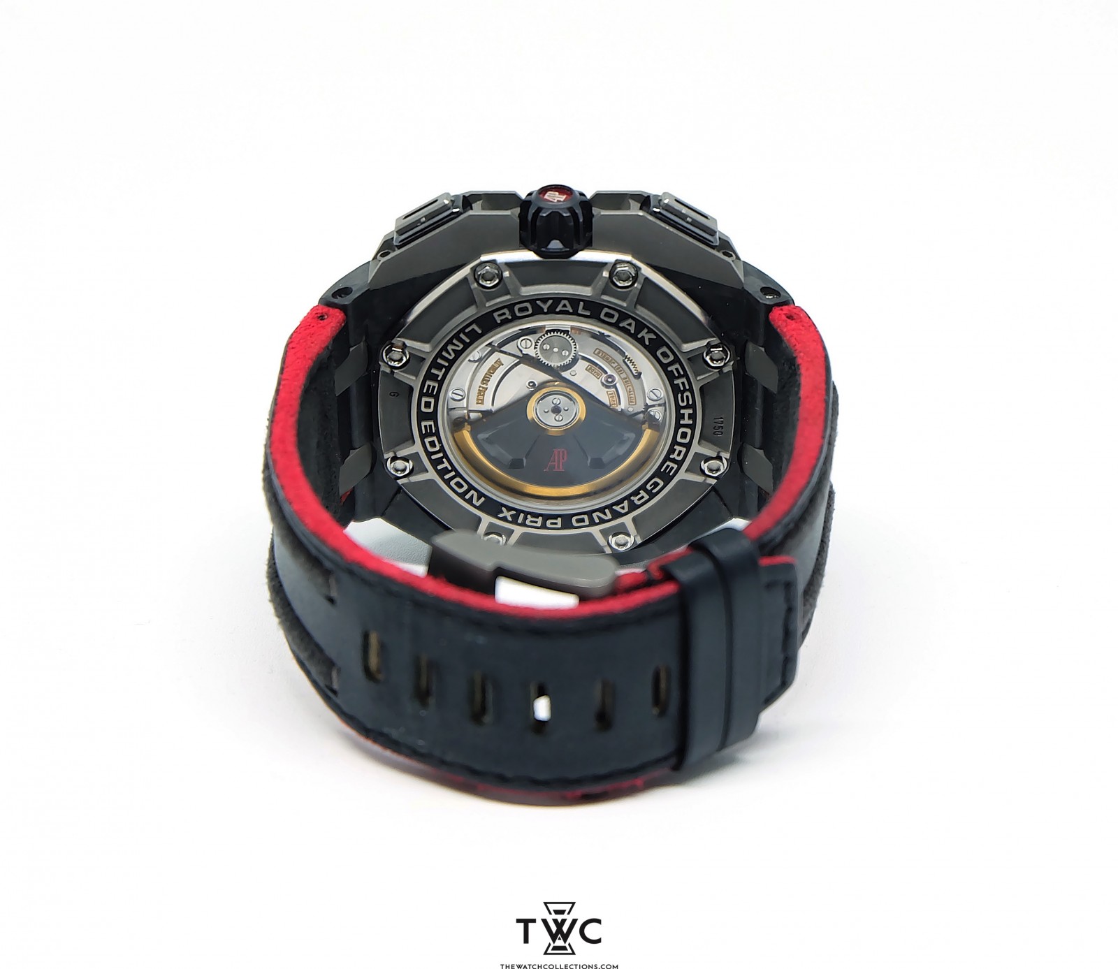 The Royal Oak Offshore Grandprix Forged Carbon features a forged carbon case with sporty dial and rubber strap. Racing-inspired, modern and masculine.