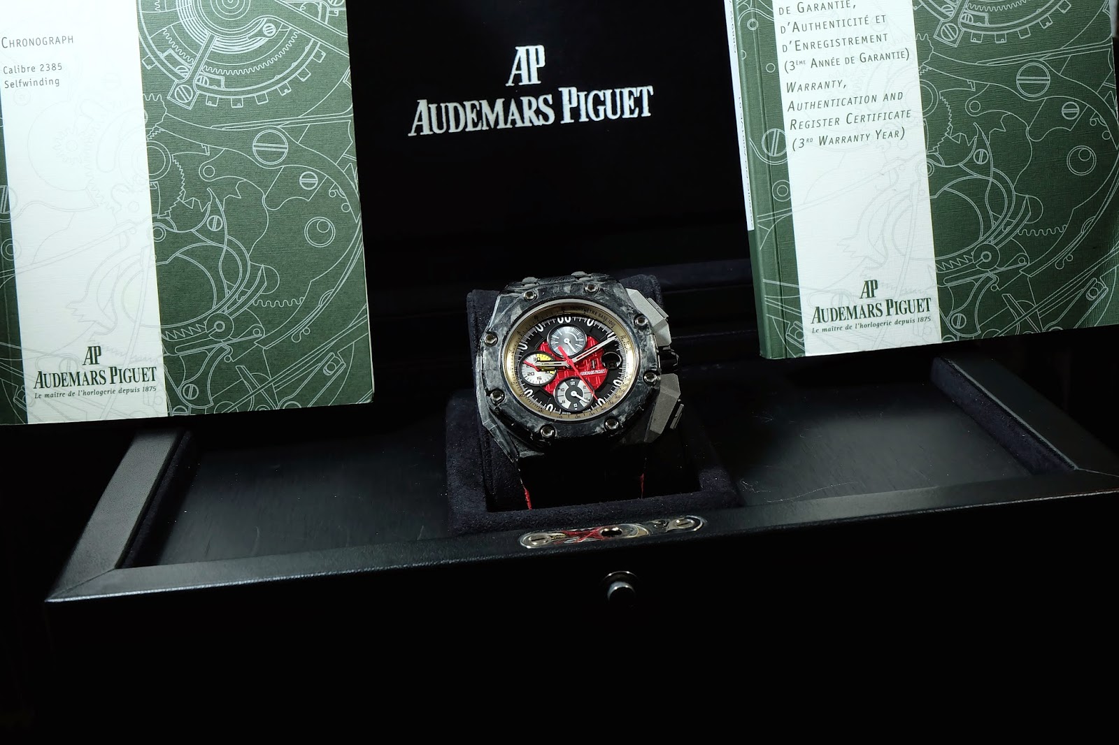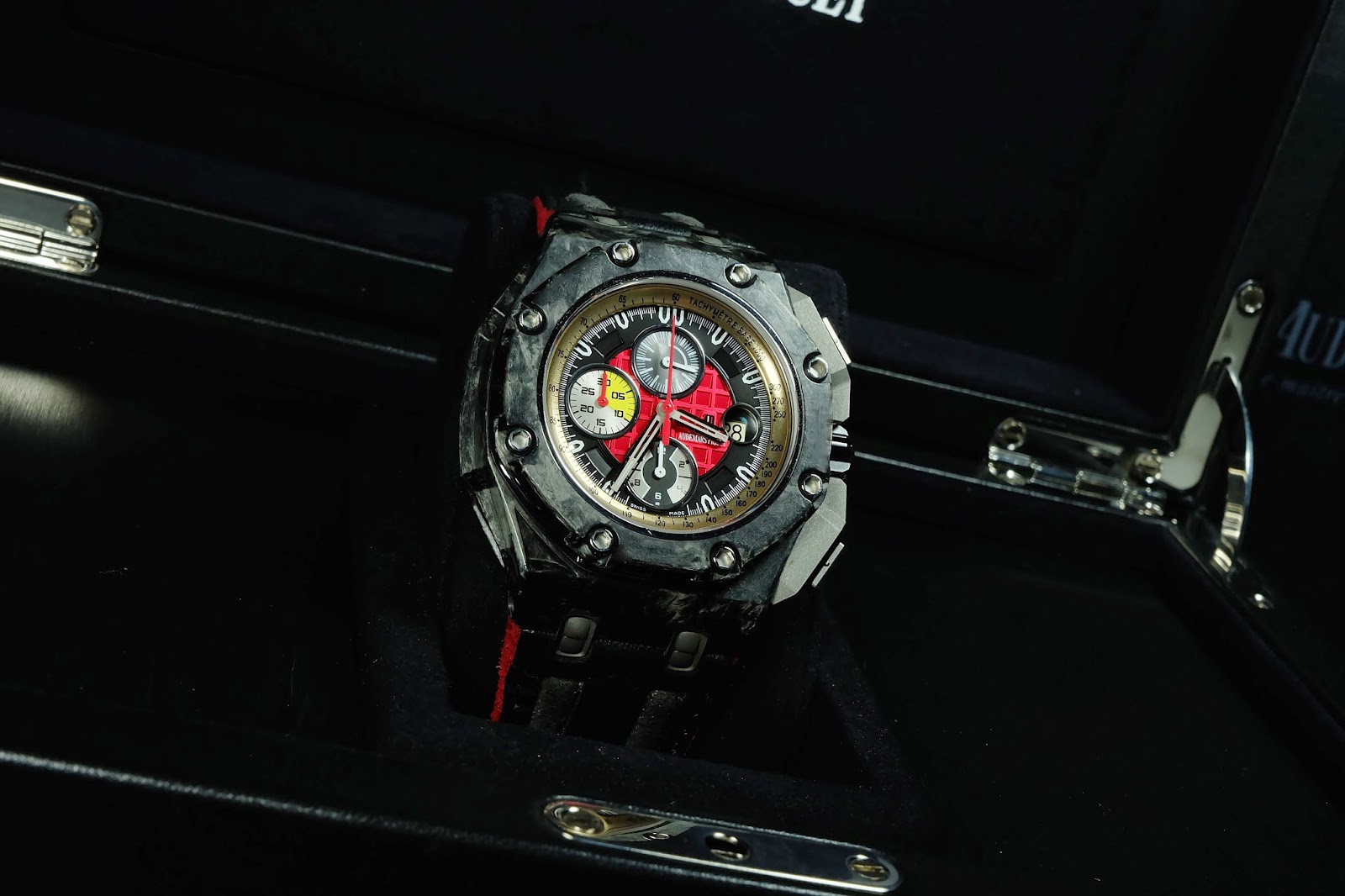 The Audemars Piguet Royal Oak Offshore GrandPrix Forged Carbon āGā features a combination of forged carbon material and aggressive sporty design. Its forged carbon bezel and titanium case create a modern, lightweight, and durable appearance. The black dial with orange accents emphasizes a racing character and excellent legibility. This limited edition model is highly sought after by collectors for its exclusivity and bold design.