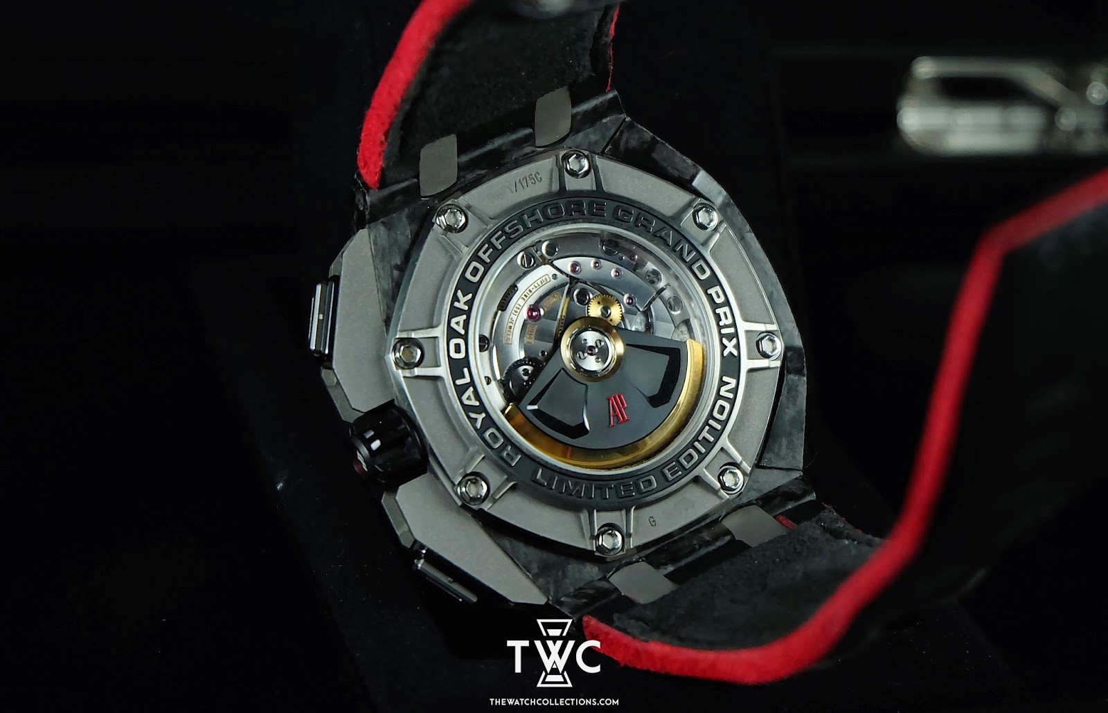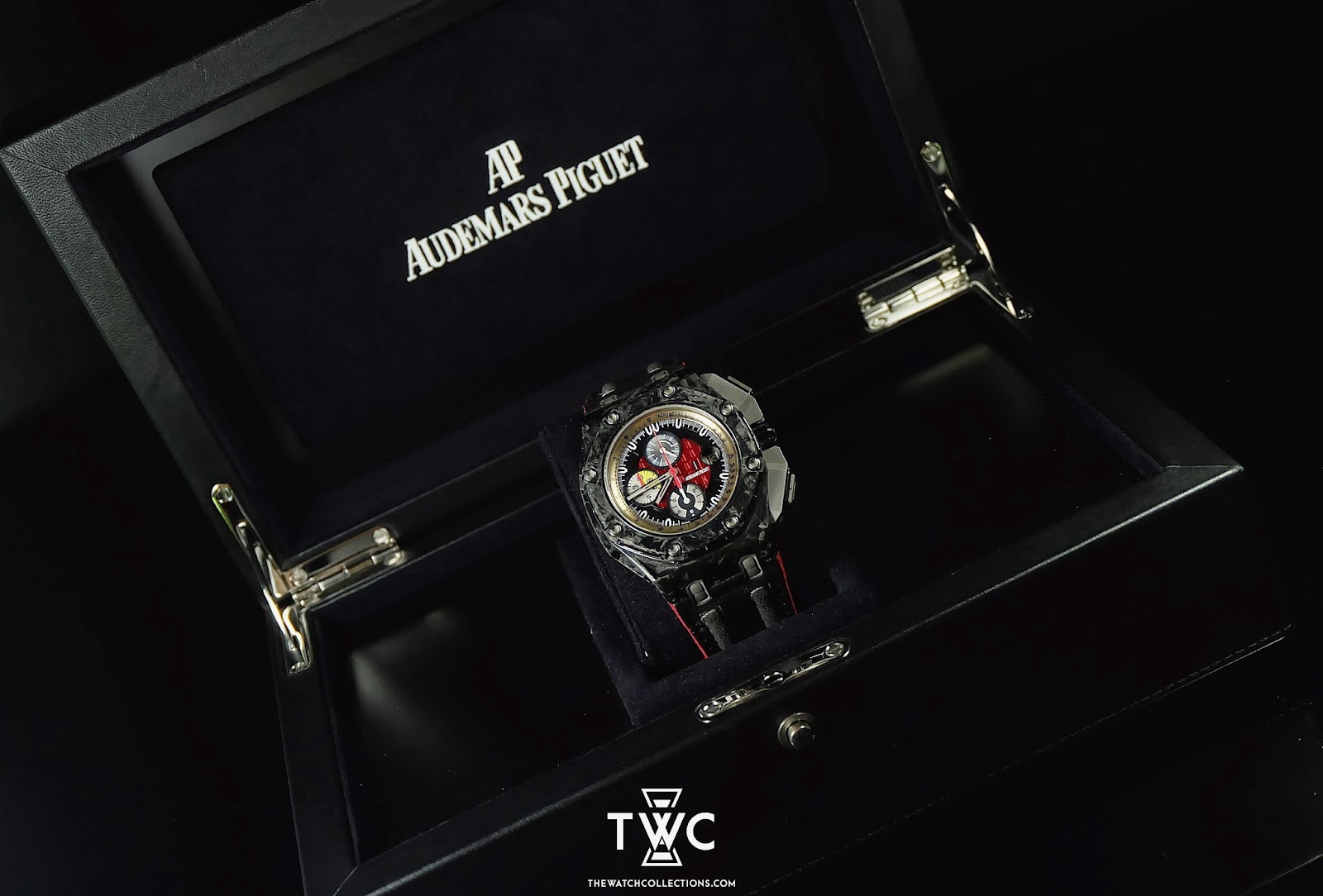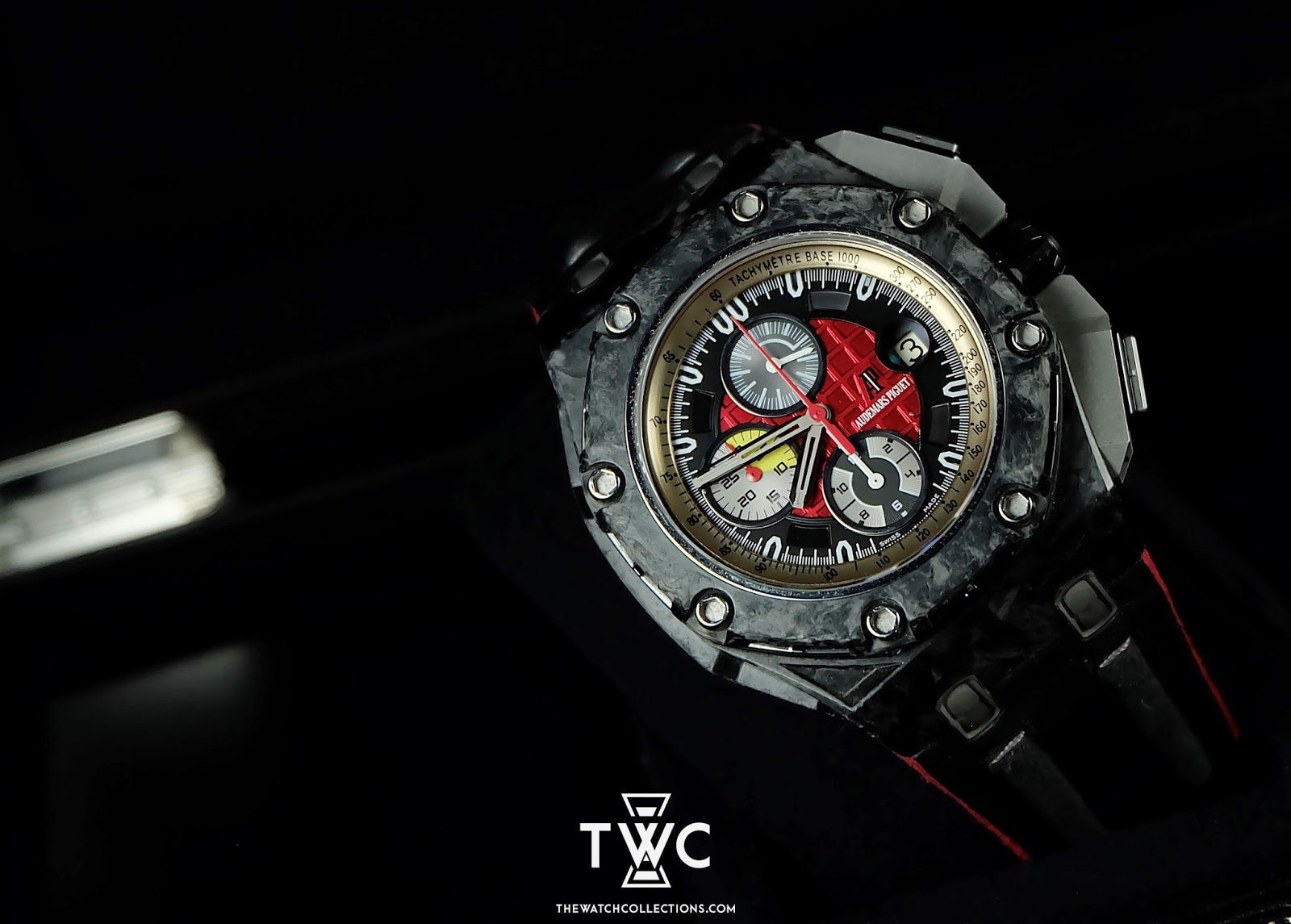 The Royal Oak Offshore Grandprix “G” features a forged carbon case with sporty dial and orange accents. Masculine and limited edition.