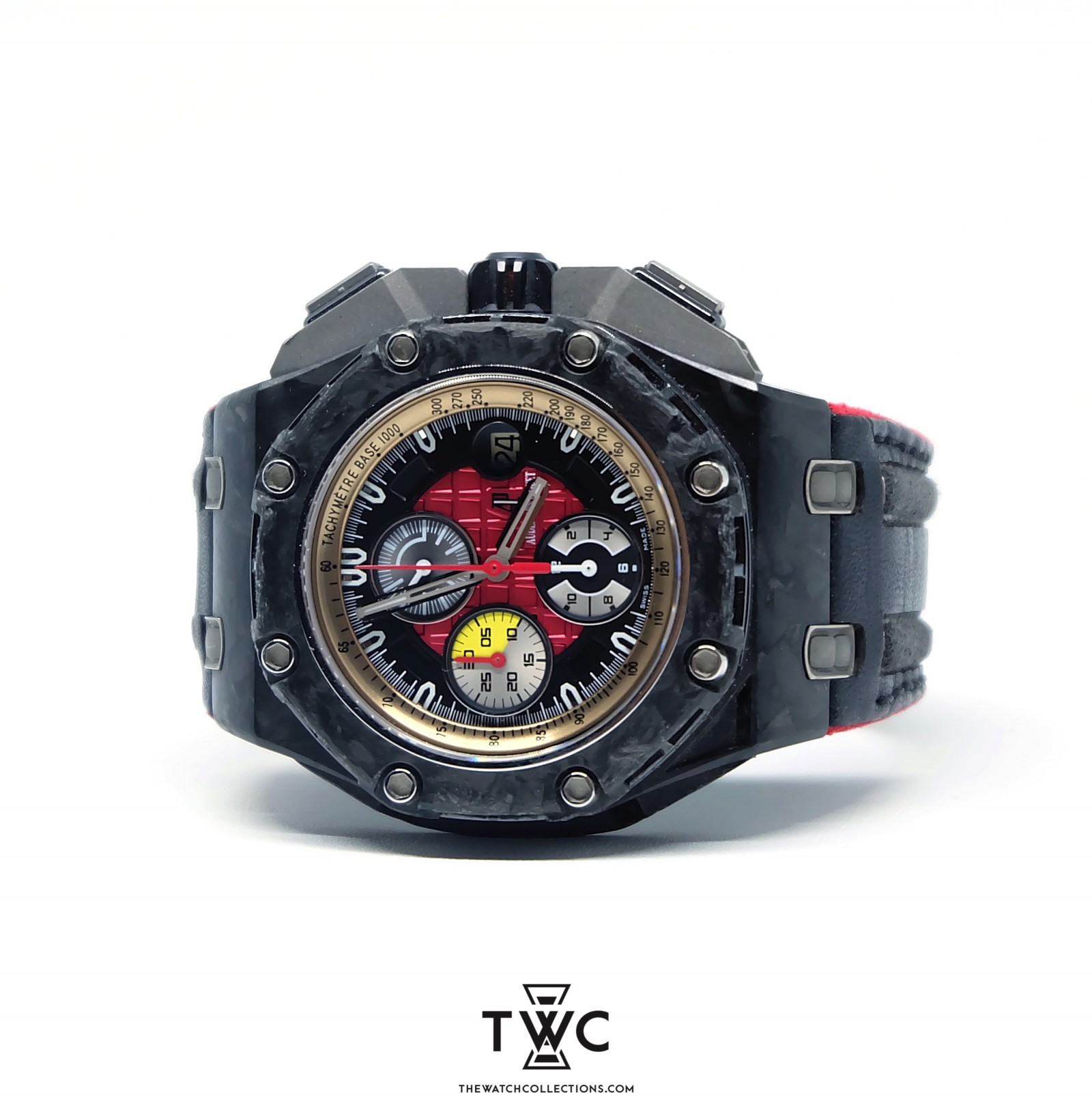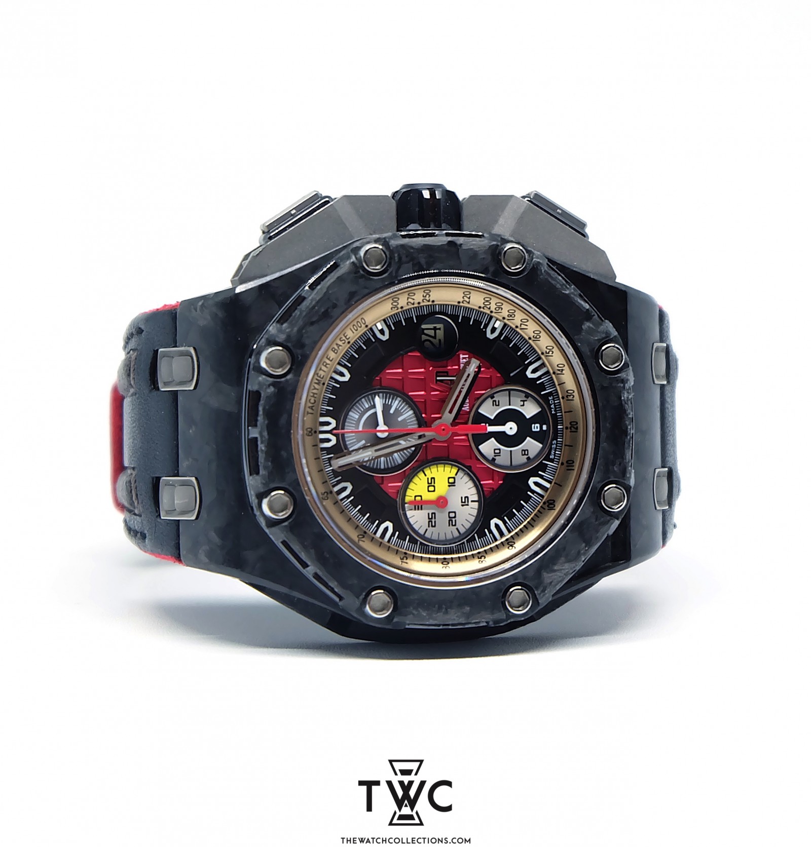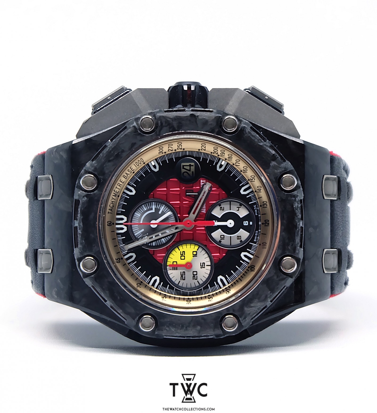 The Audemars Piguet Royal Oak Offshore Grand Prix Forged Carbon ref. 26290IO is a special edition inspired by high-performance motorsport. Its lightweight forged carbon case combined with a ceramic bezel delivers a bold and technical presence. The black dial with sporty accents reinforces the distinctive Grand Prix identity. This model is widely regarded as one of the most iconic and collectible Royal Oak Offshore references.