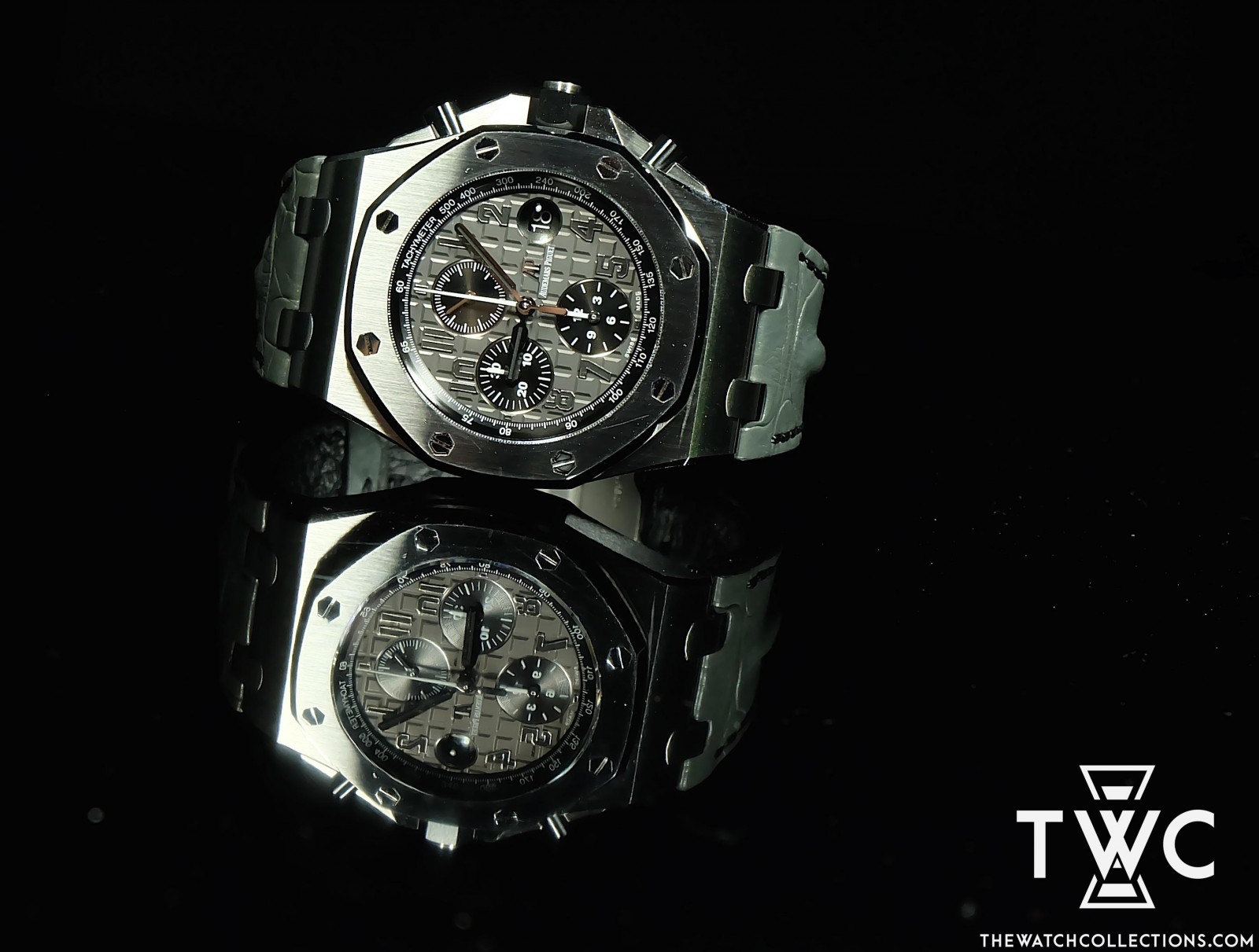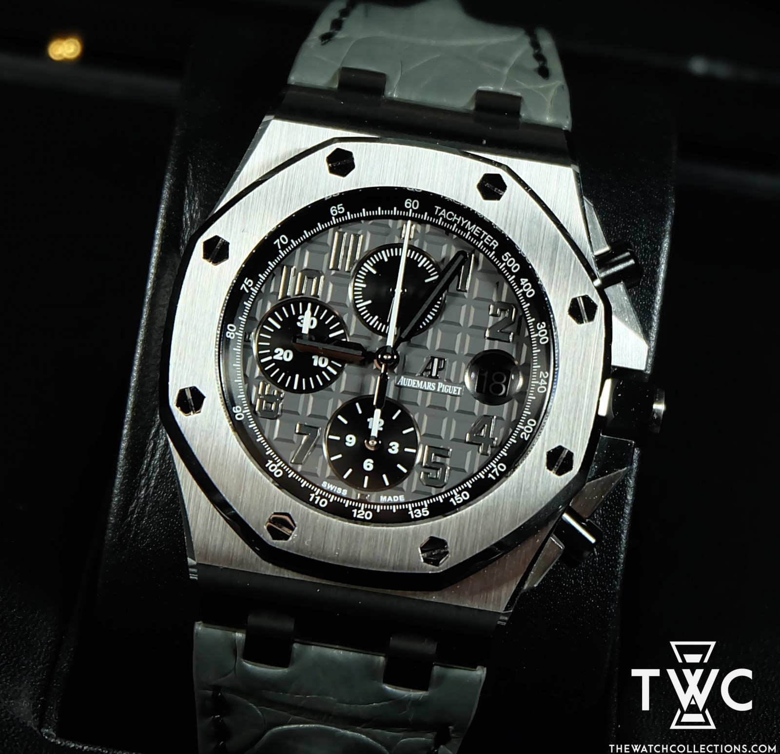 The Royal Oak Offshore Grey Themes features a grey dial and stainless steel case. Masculine, sporty, and highlights contemporary design.