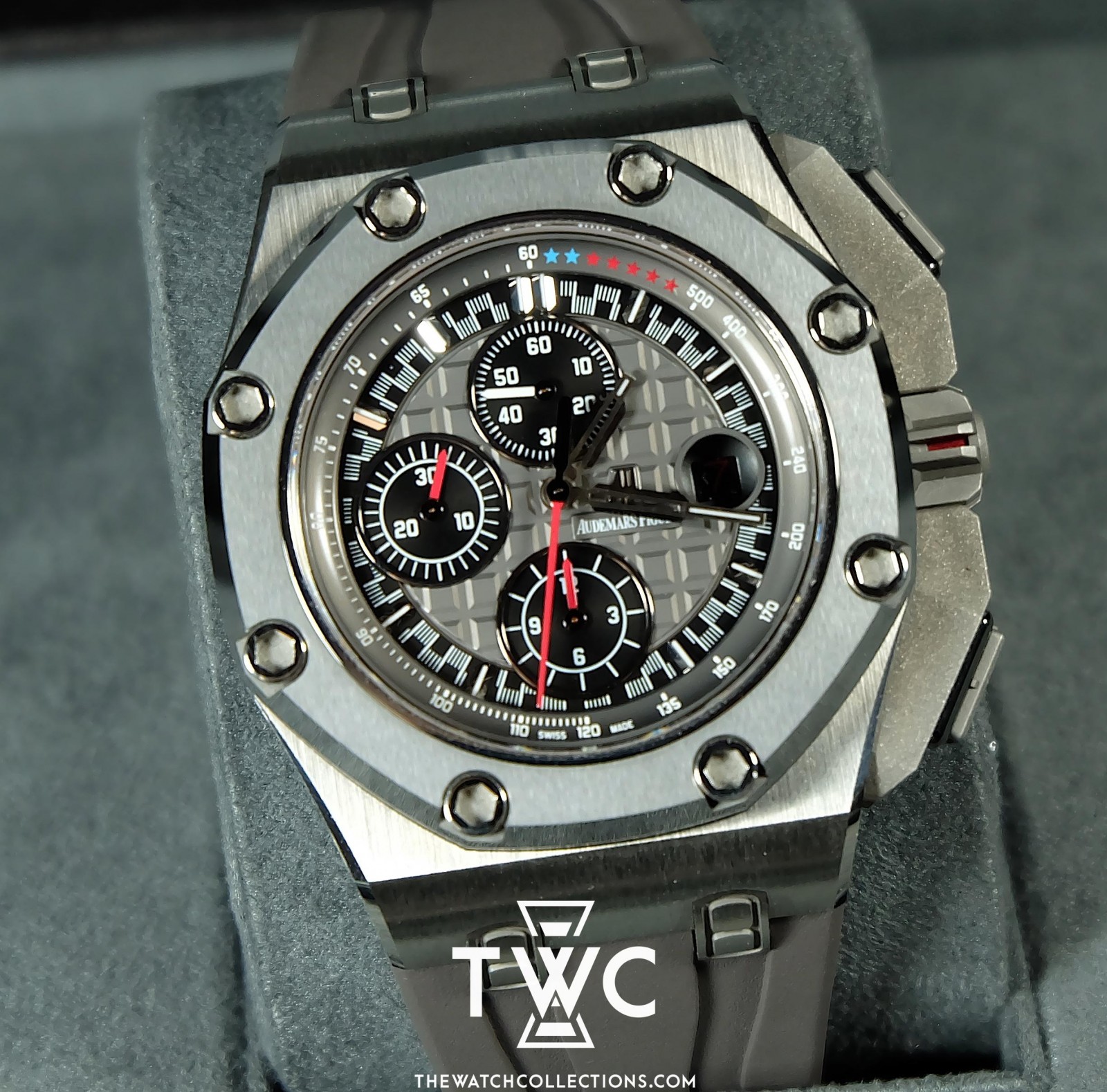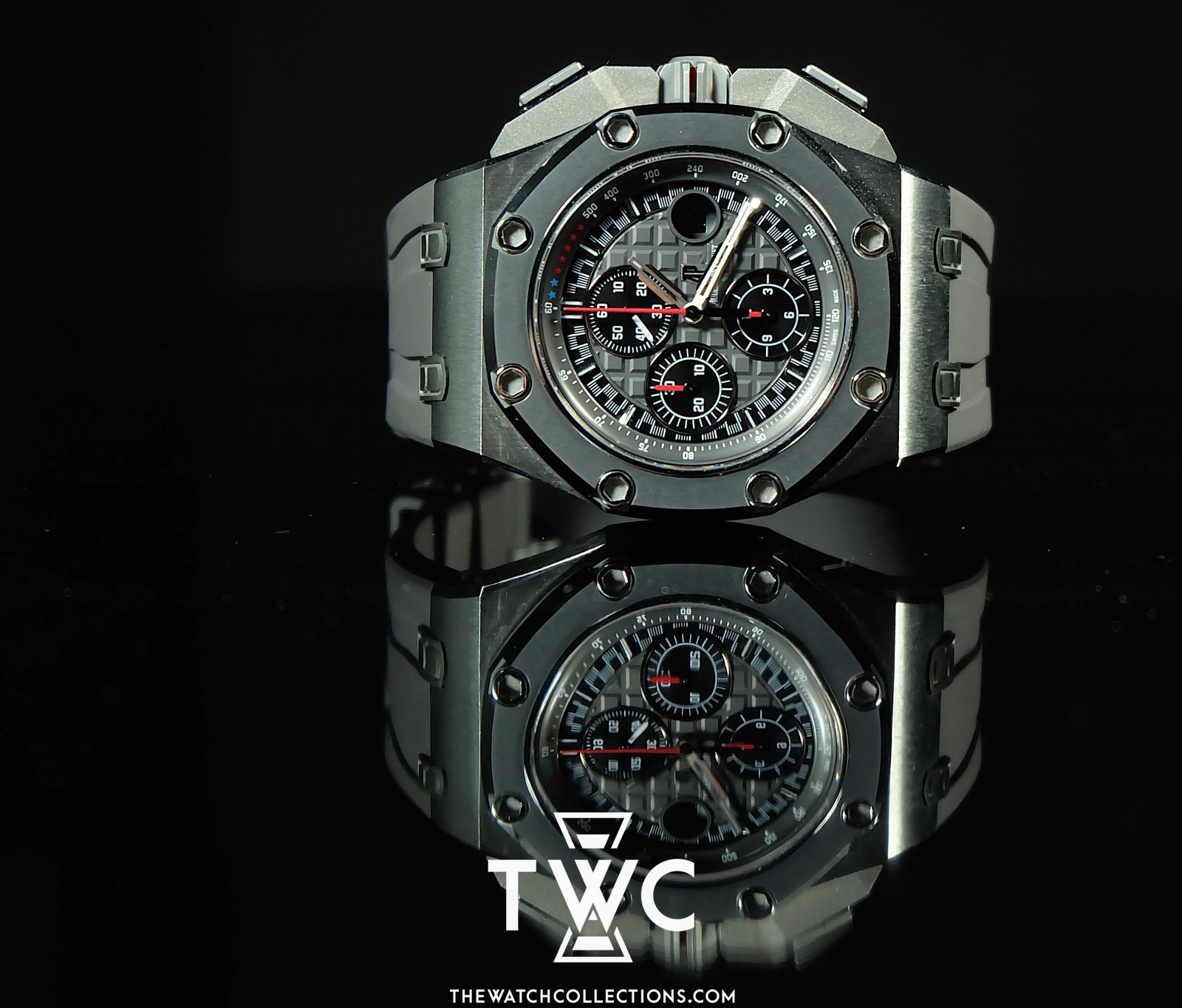 The Royal Oak Offshore Michael Schumacher Titanium features a 44mm titanium case with sporty black and red dial. Limited edition with masculine design and luxurious details. Perfect for special Audemars Piguet collectors.