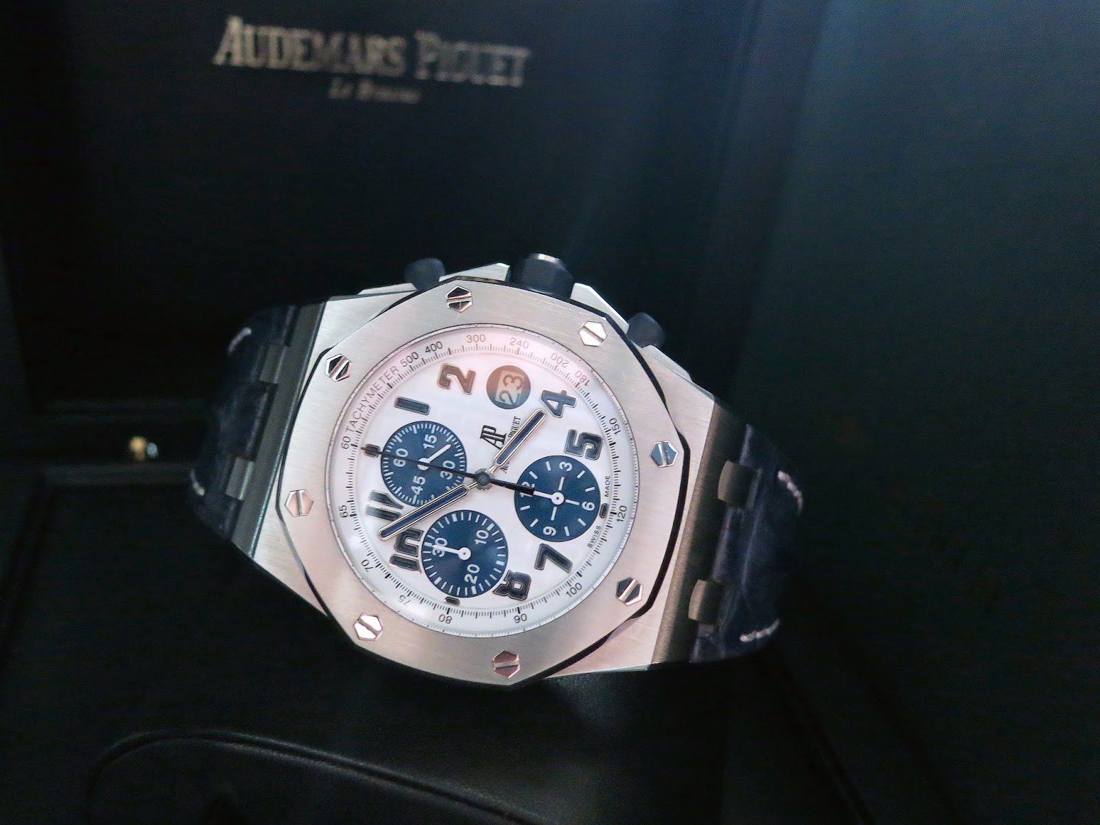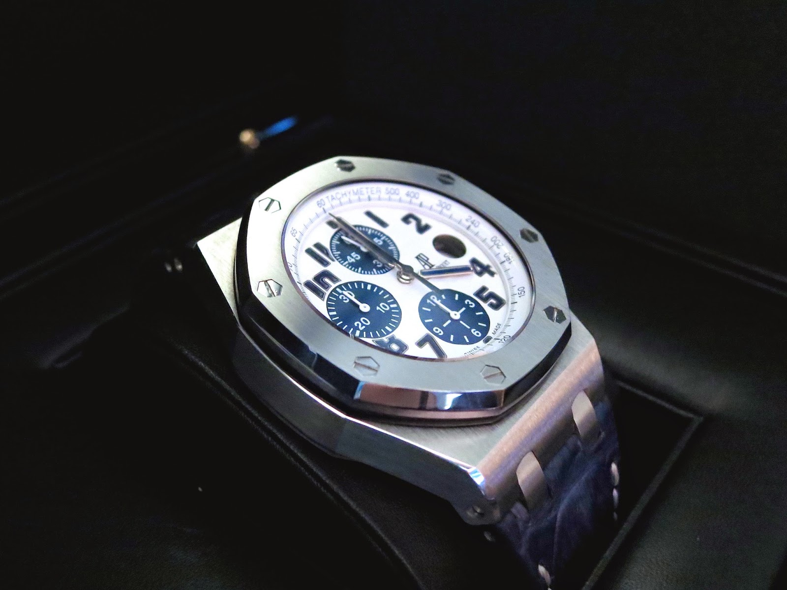 The Royal Oak Offshore Navy features a stainless steel case with deep blue dial and rubber strap. Sporty, elegant, and iconic for Royal Oak Offshore collections.