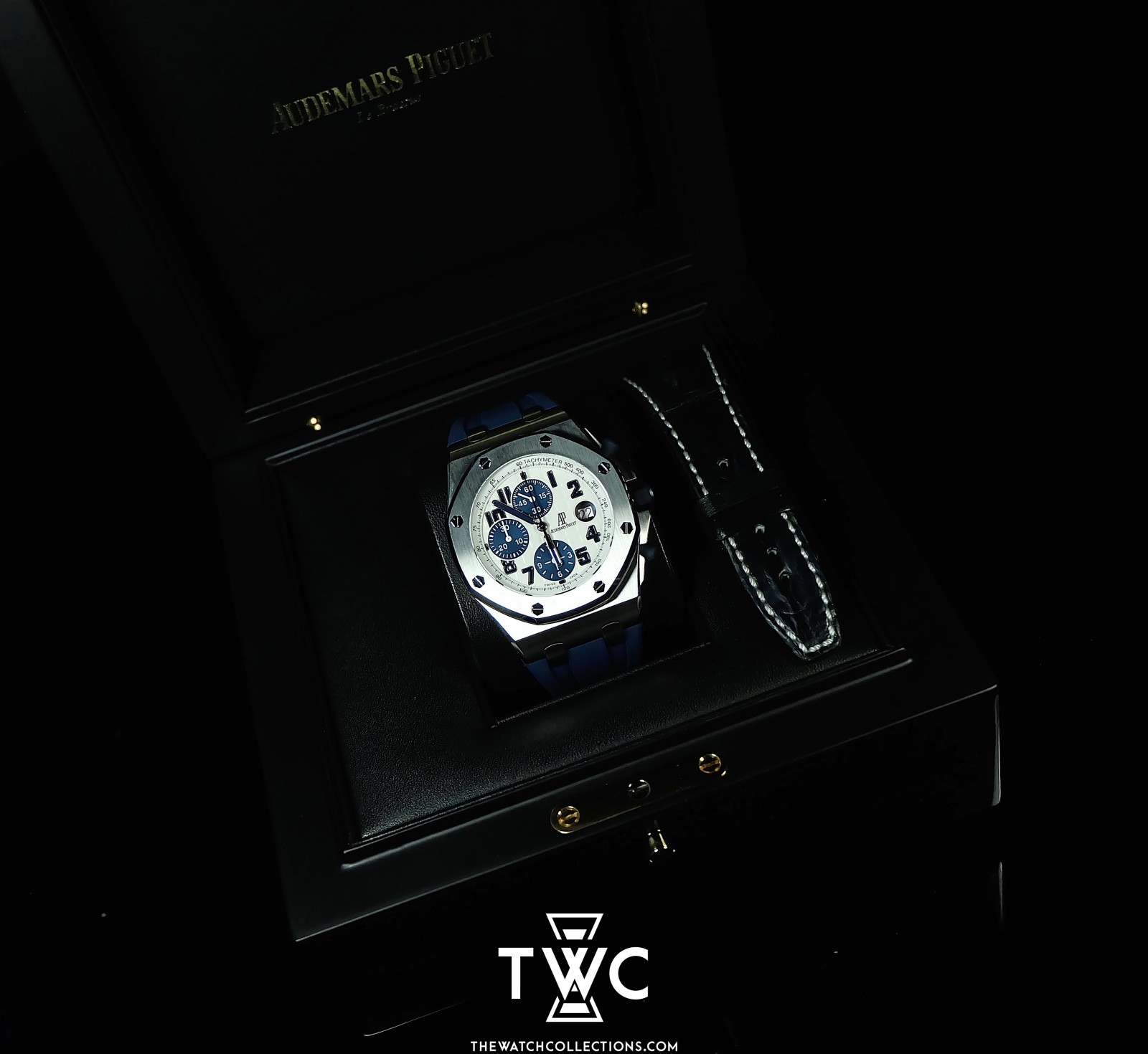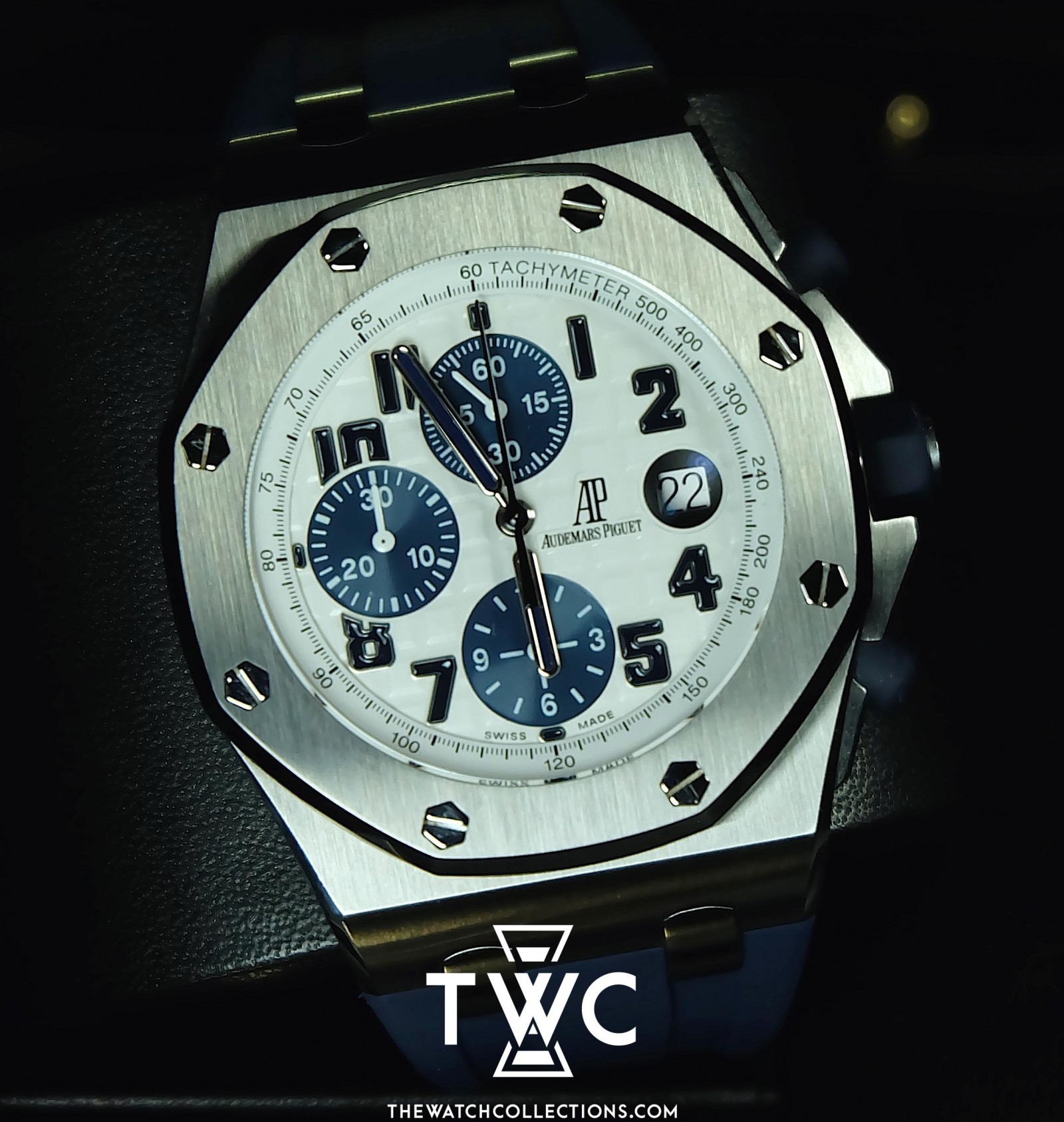 The Royal Oak Offshore Navy ‘I-Series’ features a stainless steel case with navy blue dial and rubber strap. Sporty, elegant, and perfect for a modern collection.