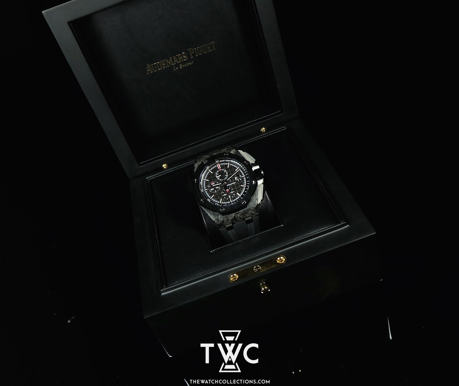 The Royal Oak Offshore Novelty Forged Carbon showcases Audemars Piguet’s bold and technical spirit. Its 44mm forged carbon case offers a lightweight yet robust presence, paired with a black Méga Tapisserie chronograph dial. Powered by the automatic Audemars Piguet 3126/3840 movement with a 50-hour power reserve, it is completed with a black rubber strap, reinforcing its modern and dynamic character.