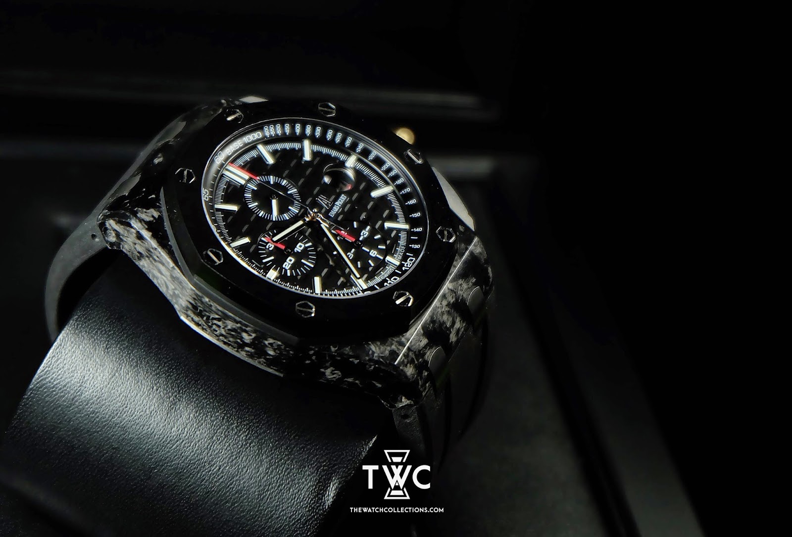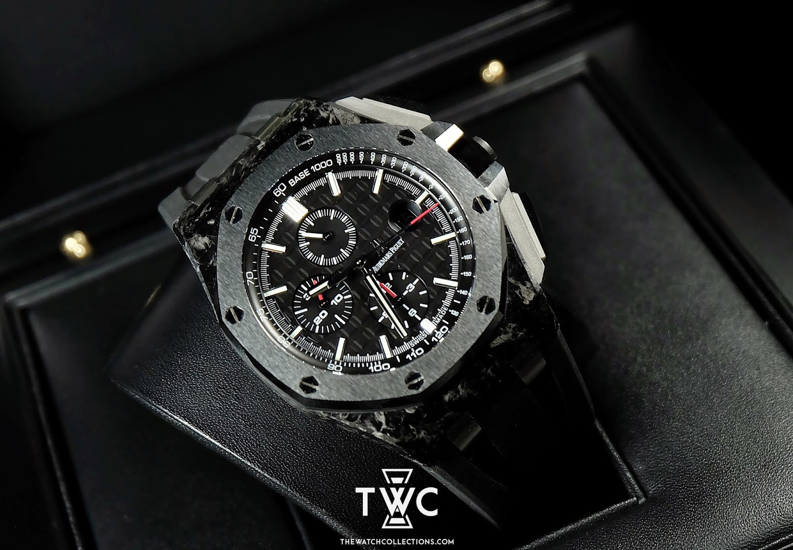 The Audemars Piguet Royal Oak Offshore Novelty Forged Carbon ref. 26400AU represents a modern and technical evolution within the Royal Oak Offshore collection. Featuring a forged carbon case, this model offers a lightweight construction combined with a bold, futuristic appearance, setting it apart from traditional metal Offshore variants. Its black dial with contrasting details is framed by the iconic octagonal bezel, delivering a powerful sporty presence. Powered by an automatic chronograph movement with date function, this timepiece perfectly embodies the Royal Oak Offshore DNA—luxury, performance, and exclusivity in one distinctive package.
