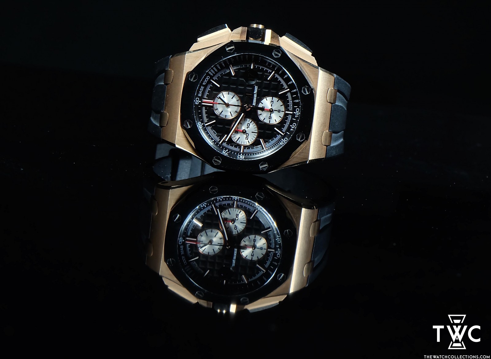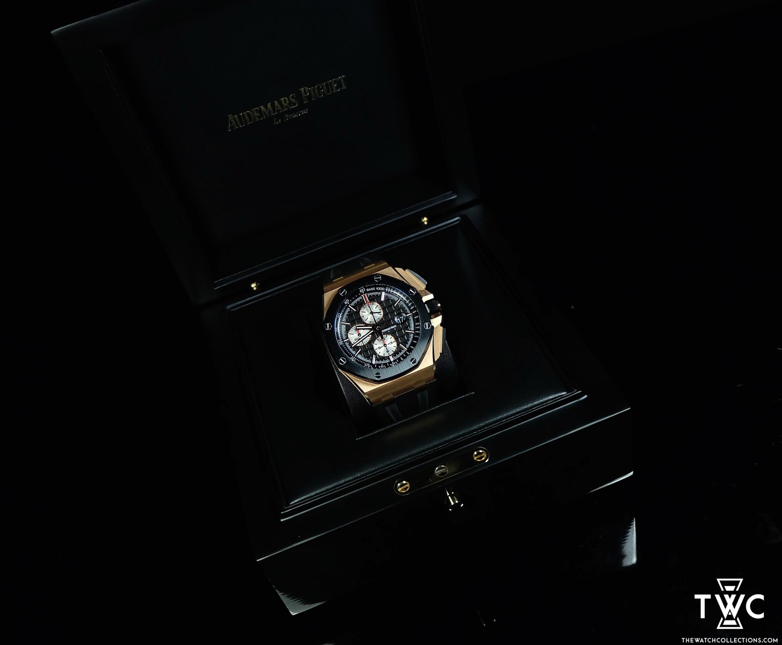 The Audemars Piguet Royal Oak Offshore Novelty Rose Gold delivers a bold sporty character enhanced by the signature luxury of the Offshore line. Its rose gold case is paired with a black “Mega Tapisserie” dial and strong contrasting details, creating a powerful and masculine presence. Powered by an in-house automatic chronograph movement, this timepiece offers high technical performance with strong collectibility within the Royal Oak Offshore collection.