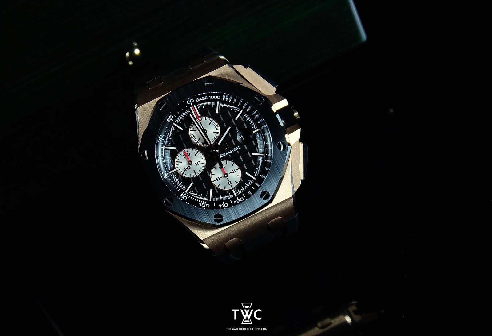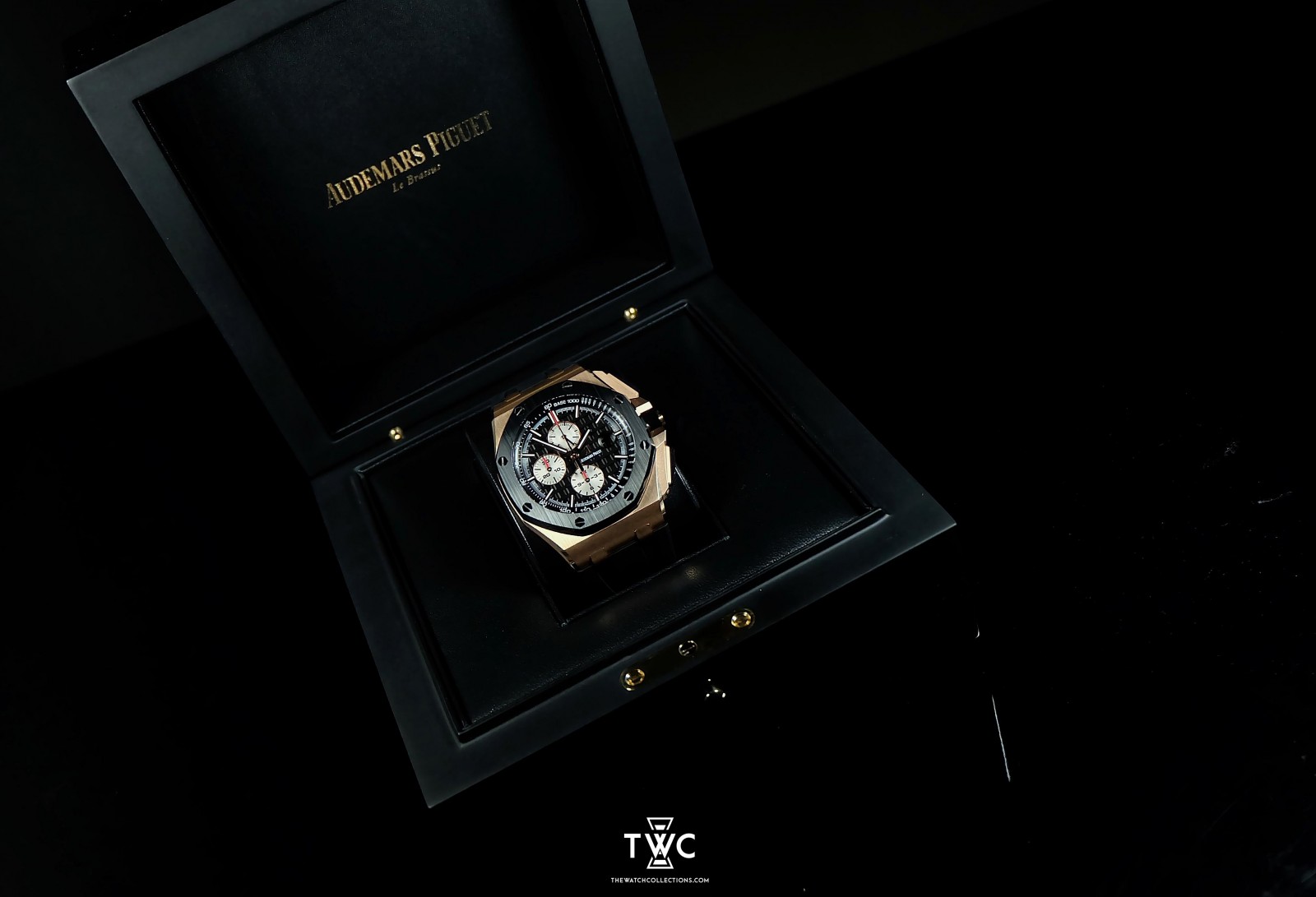 The Audemars Piguet Royal Oak Offshore Novelty Rose Gold features a bold 44mm Offshore design with a luxurious rose gold case paired with a modern ceramic bezel. Its black chronograph dial with strong contrast highlights the sporty yet refined character of the Offshore line. Powered by the Audemars Piguet 3126/3840 automatic movement, this model combines precious materials, high performance, and Audemars Piguet’s iconic design language.