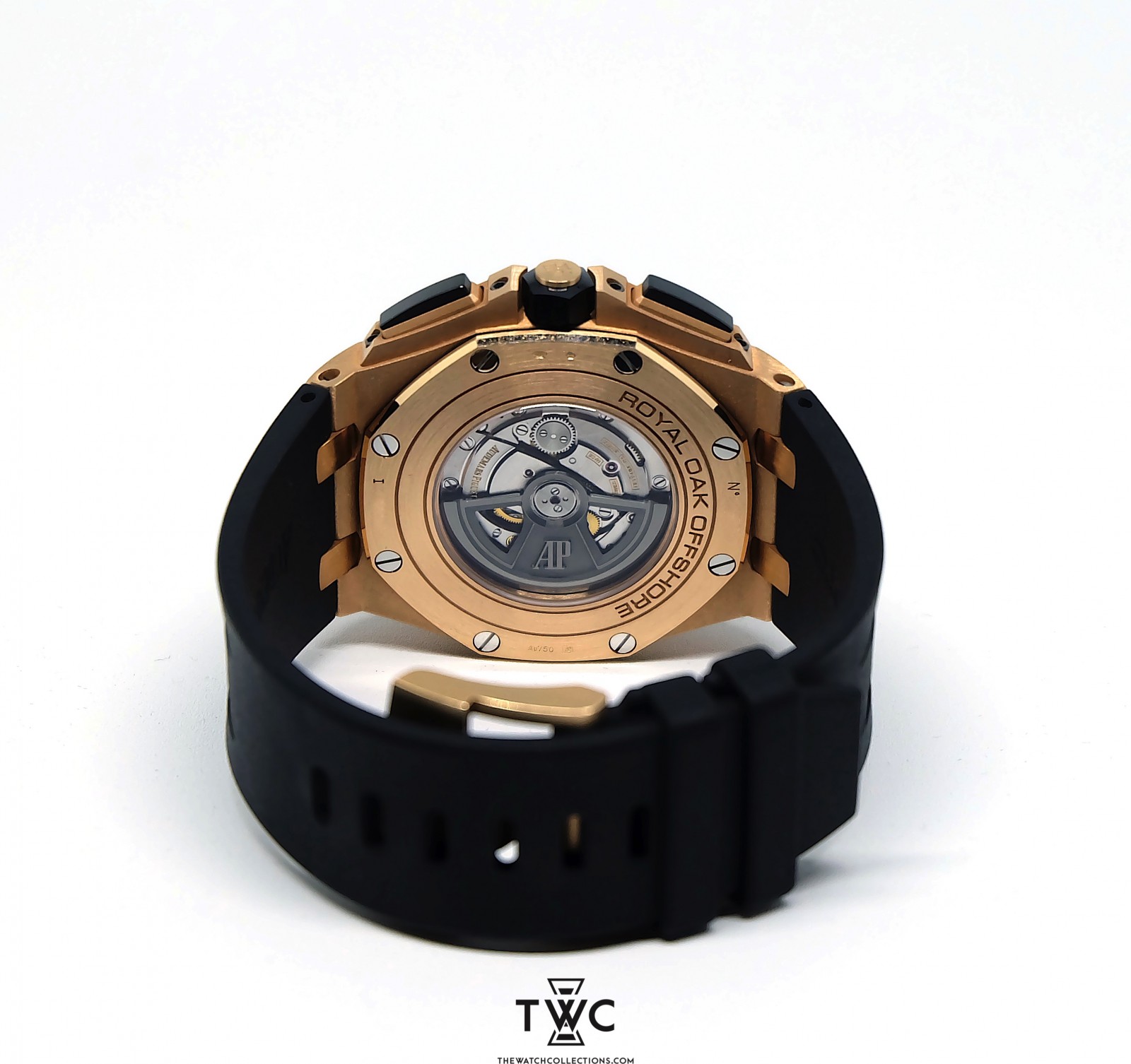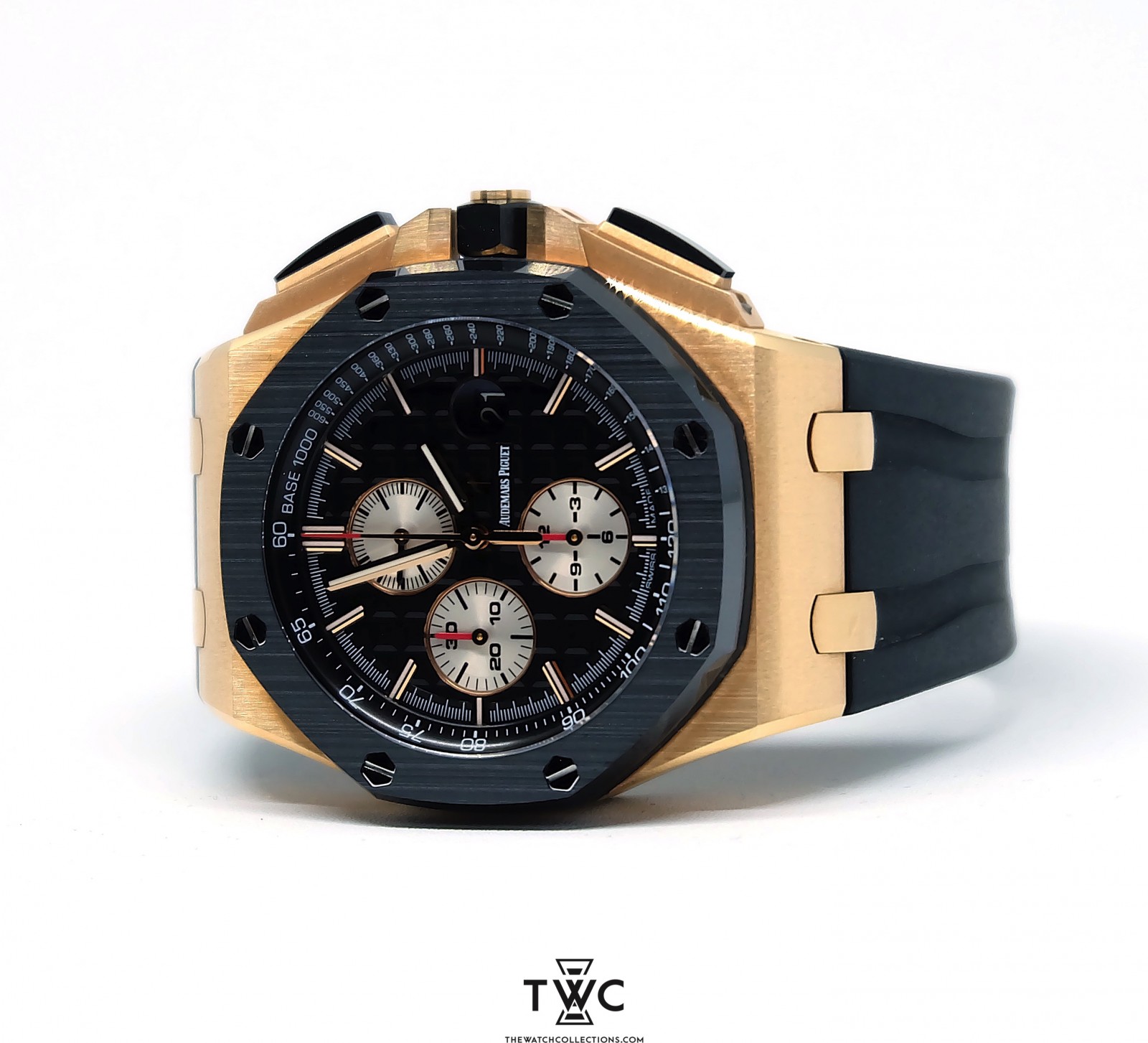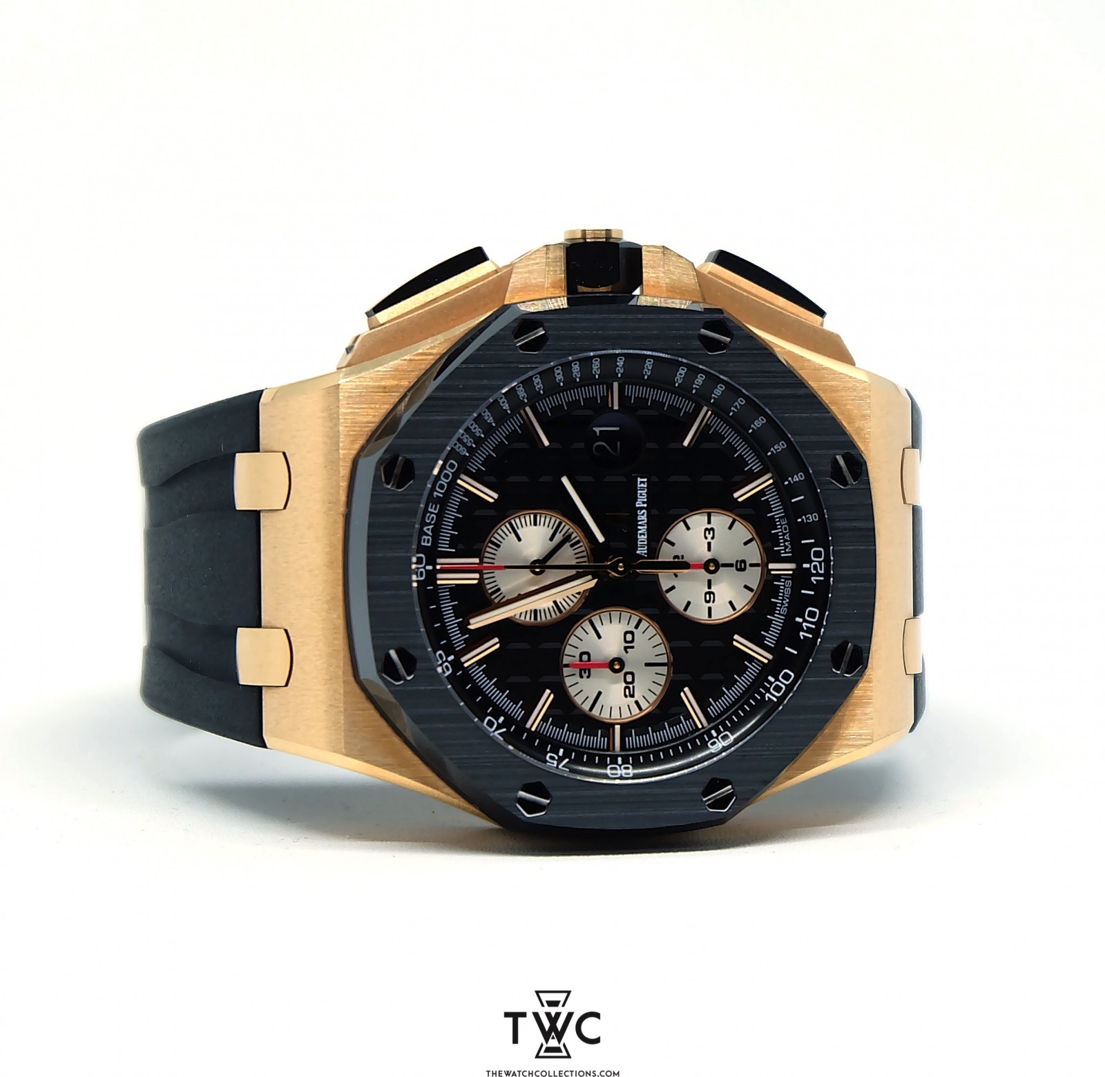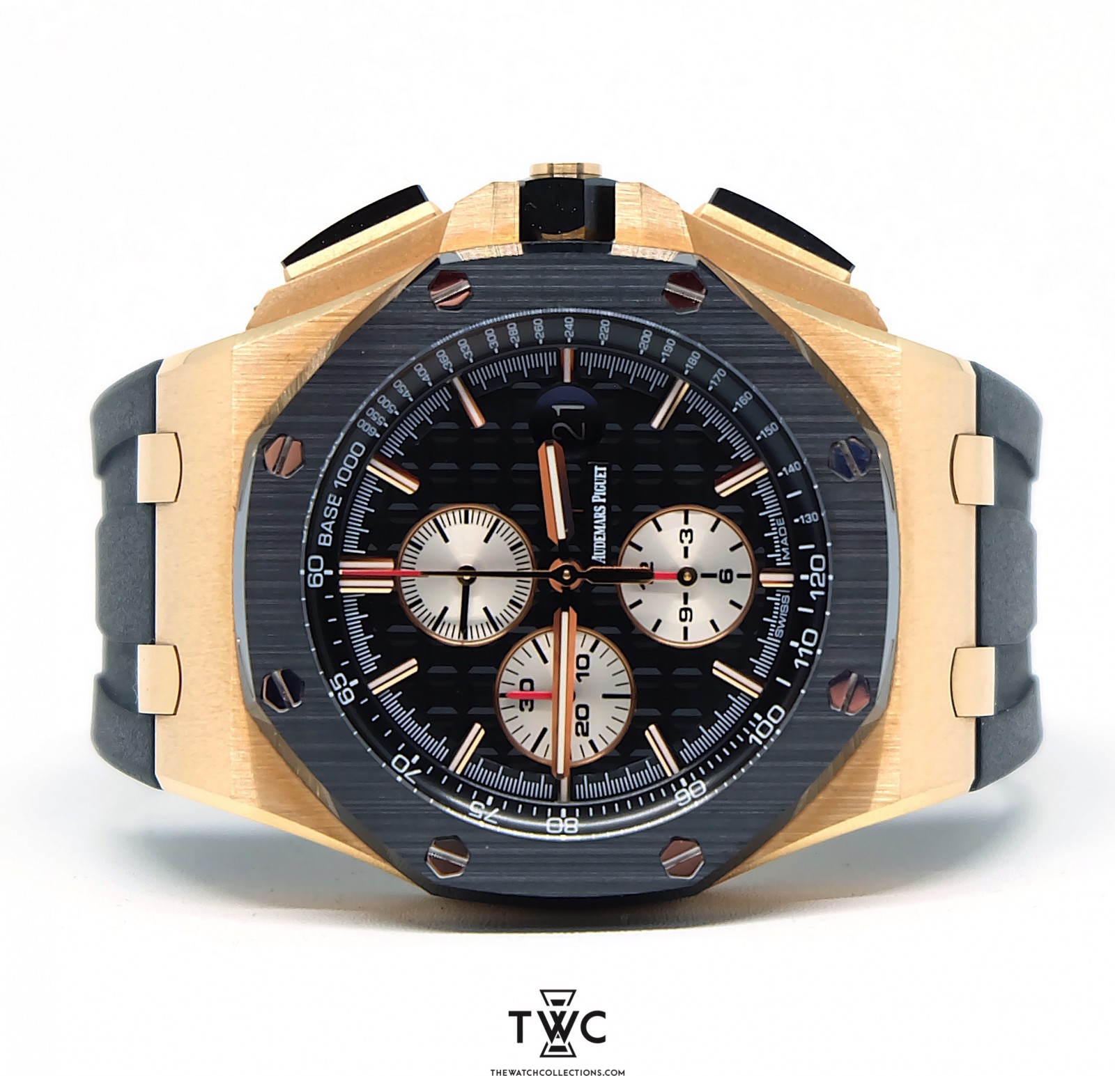 The Royal Oak Offshore Novelty Rose Gold “I” features a rose gold case with grey dial. Exclusive, sporty, and highlights modern Audemars Piguet design.