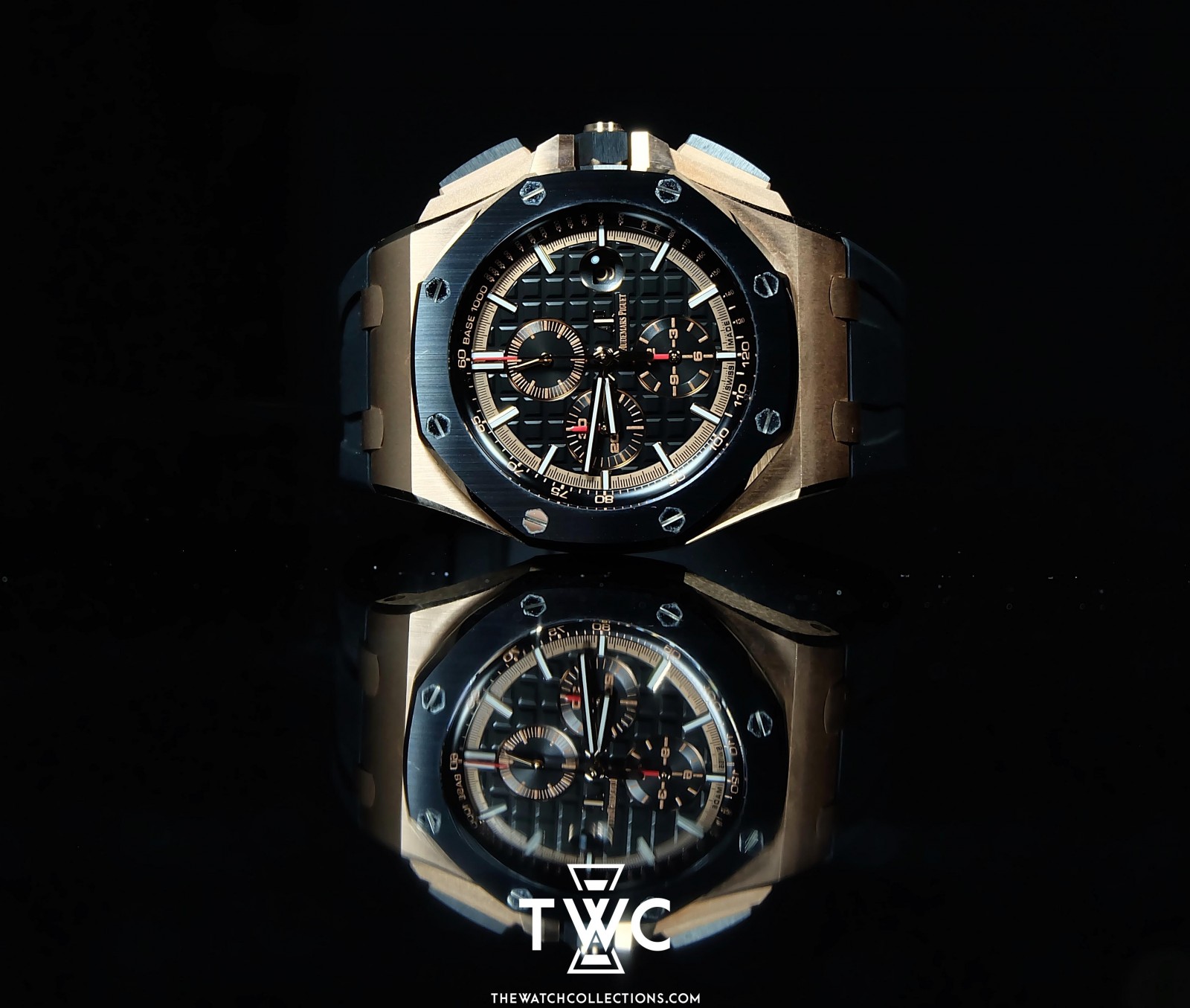 The Royal Oak Offshore Novelty Rose Gold *New Model SIHH 2017 showcases classic luxury with a rose gold case and elegant black dial. The sporty design is highlighted by clear hands and indices. Its rubber bracelet provides optimal comfort for daily wear. This model is ideal for collectors seeking a modern luxury watch with an exclusive touch.