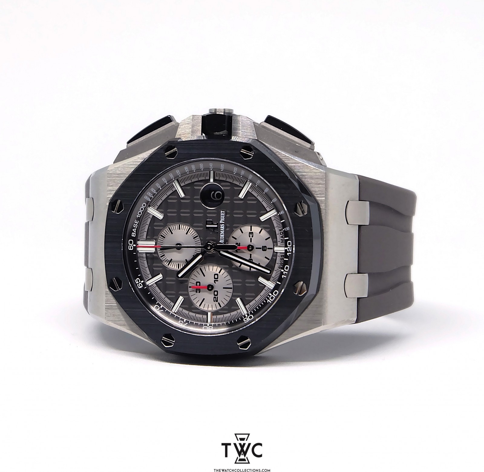 The Royal Oak Offshore Novelty Titanium features a titanium case with modern dial and rubber strap. Sporty, exclusive, and highlights iconic design.