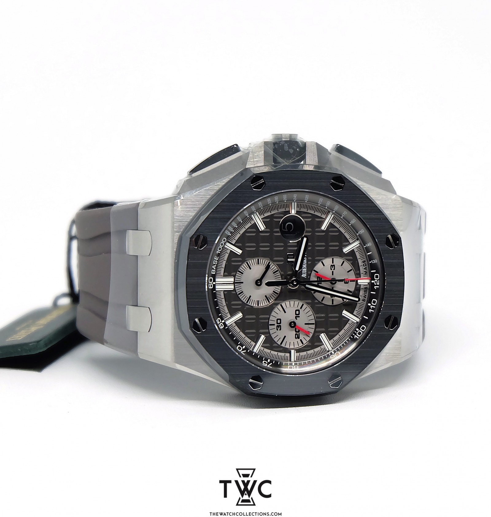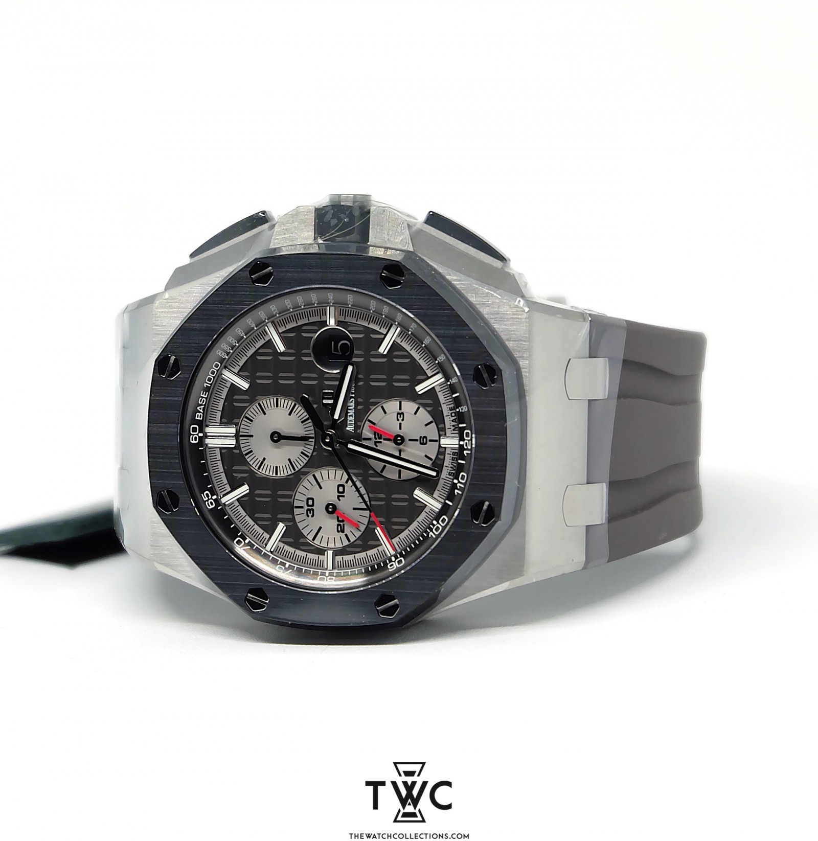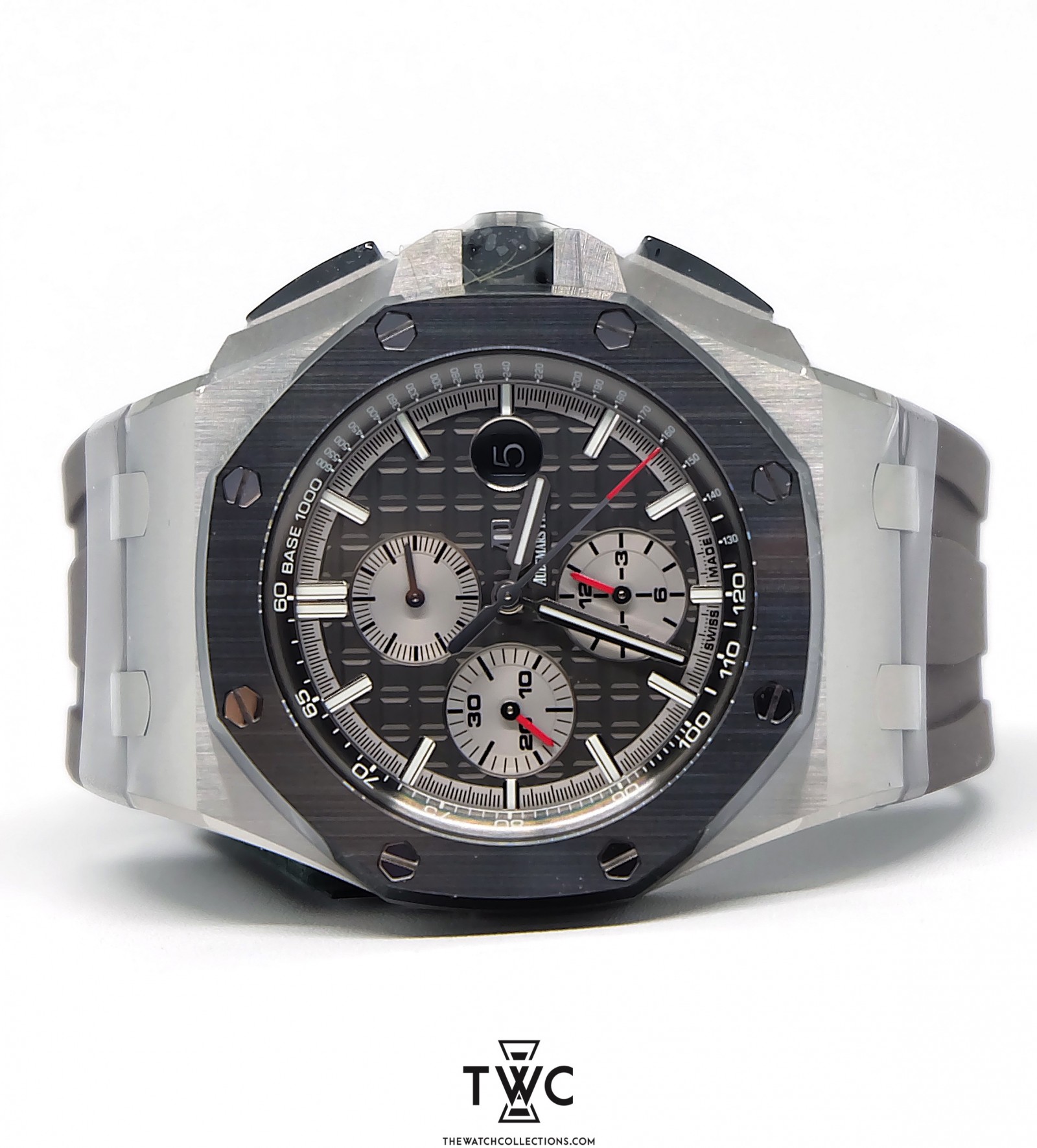 The Royal Oak Offshore Novelty Titanium features a titanium case with modern design and rubber strap. Sporty, exclusive, and ideal for prestigious collections.