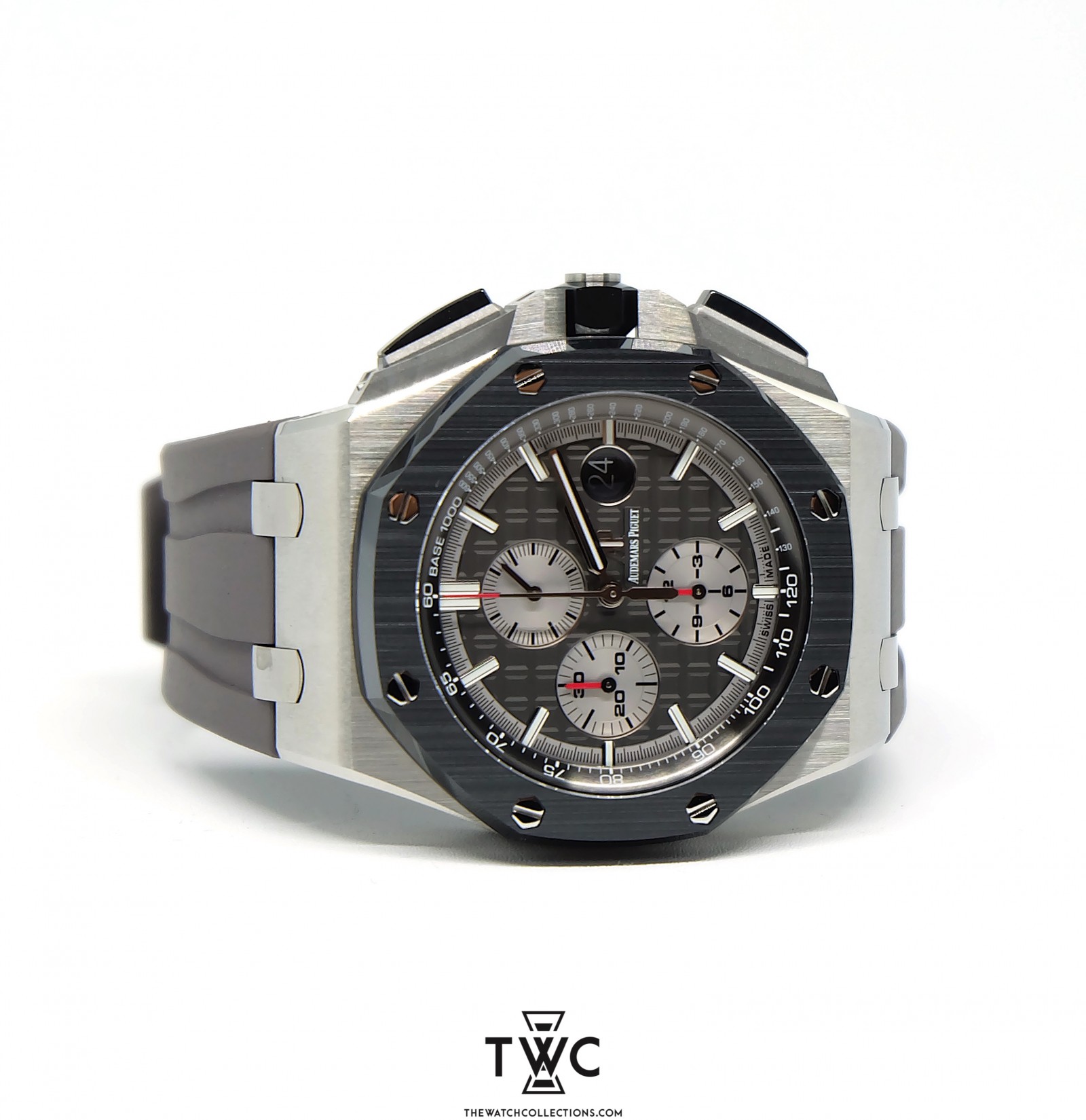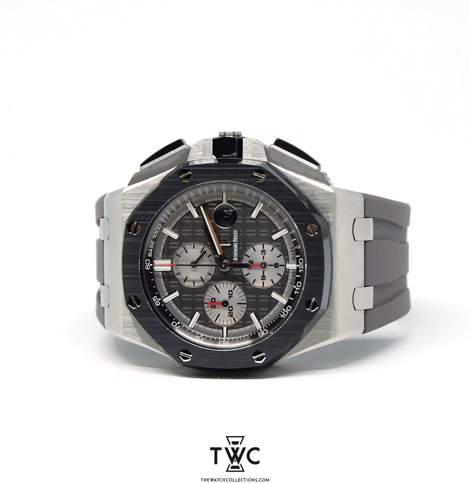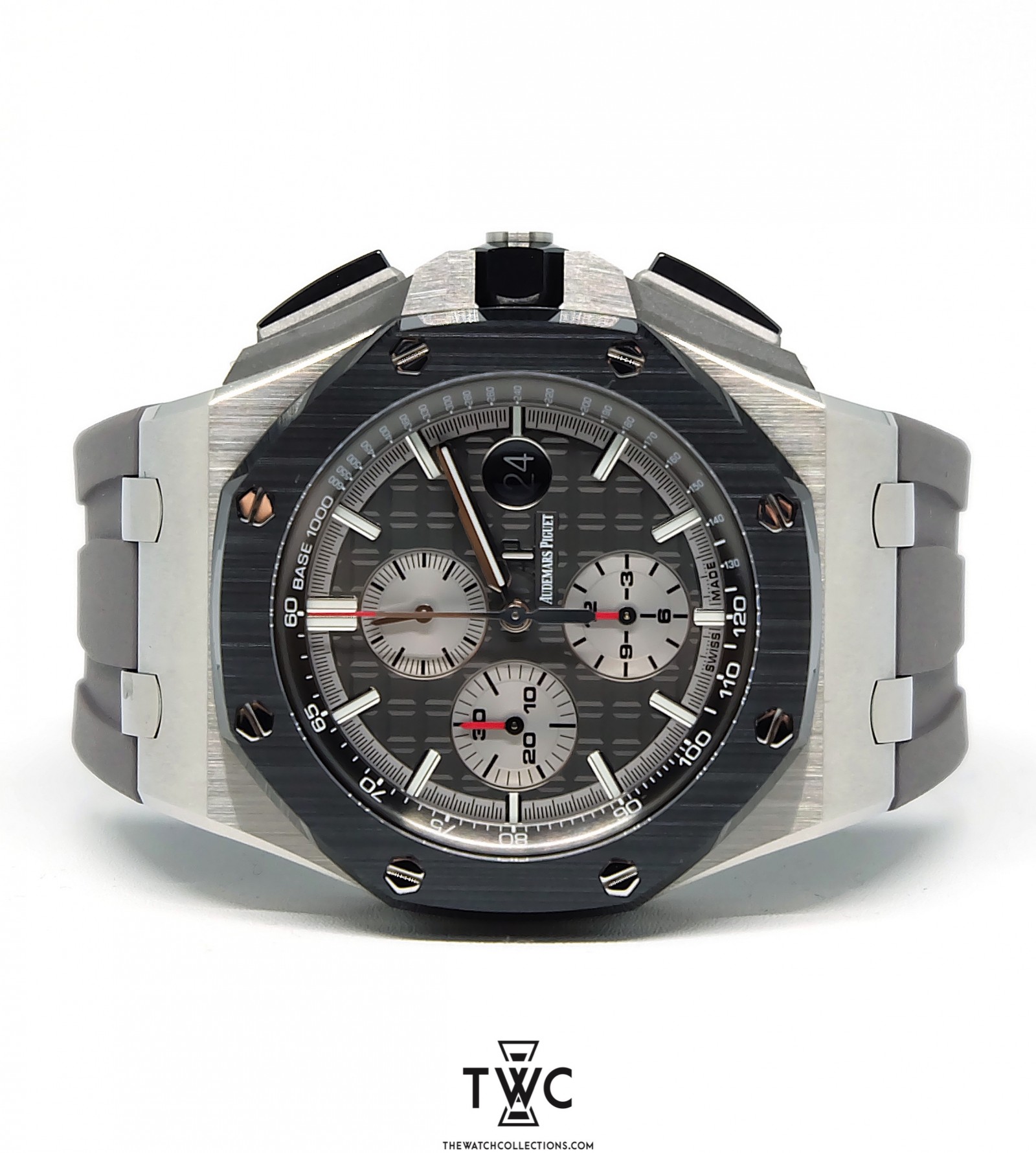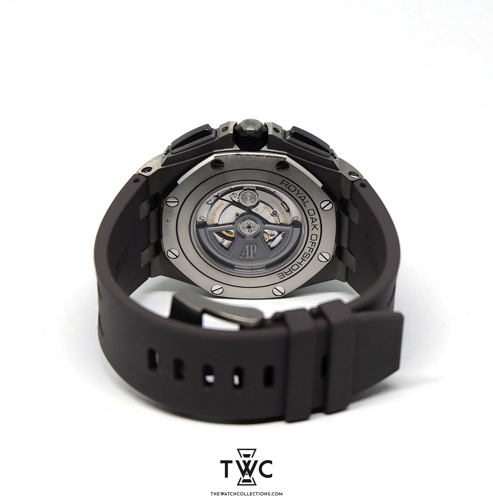 The Royal Oak Offshore Novelty Titanium features a lightweight titanium case with sporty dial and rubber strap. It emphasizes innovation and signature Royal Oak Offshore design.