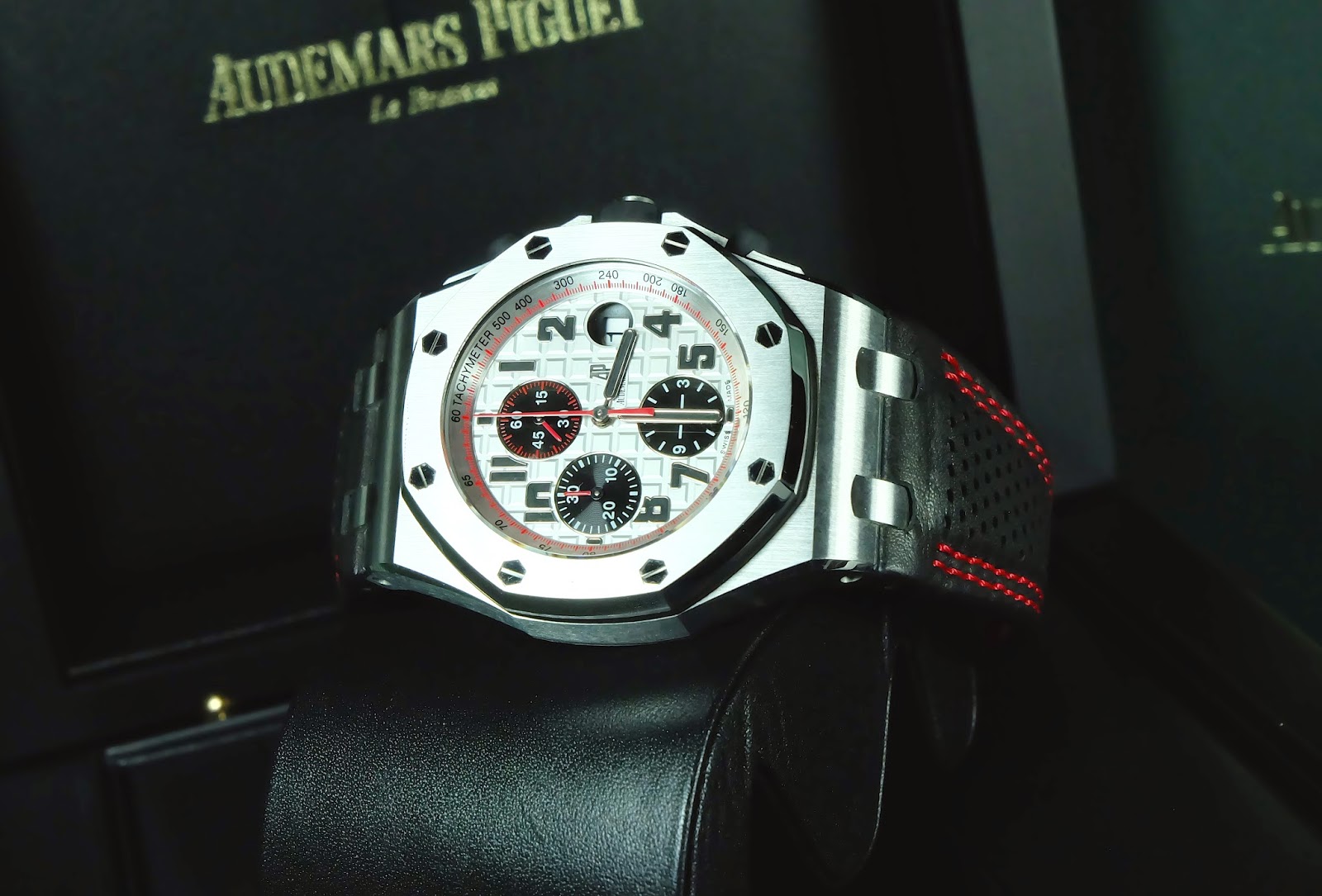 The Audemars Piguet Royal Oak Offshore “Panda” ref. 26170ST.OO.D101CR.02 delivers the classic sporty aesthetic of the Offshore line with a striking panda dial — black subdials on a clean white background. Its 42mm stainless steel case and bezel create a robust and bold presence, while the included hornback leather strap adds refined versatility. Powered by an automatic chronograph movement, this timepiece offers high technical performance and precision. Highly sought-after, the Panda model is prized for its timeless design and collectability.