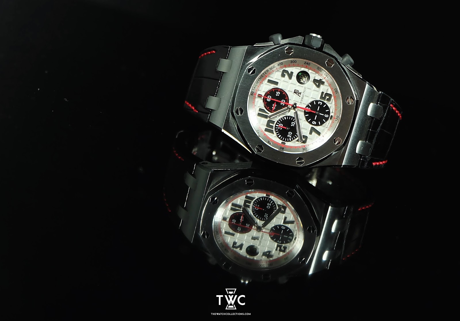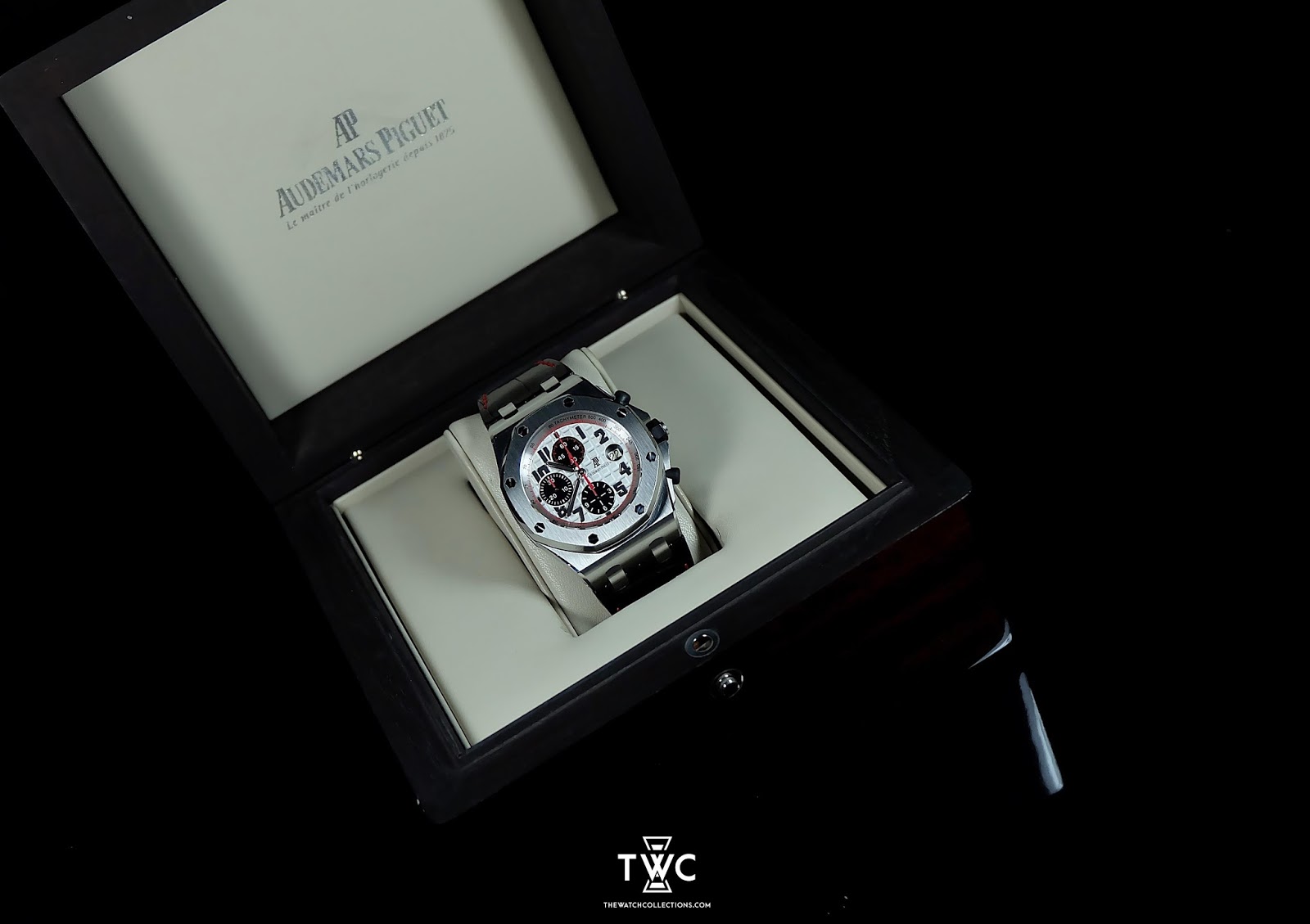 The Royal Oak Offshore Panda features a stainless steel case with iconic black-and-white dial and rubber strap. Sporty and elegant design, typical of Royal Oak Offshore.