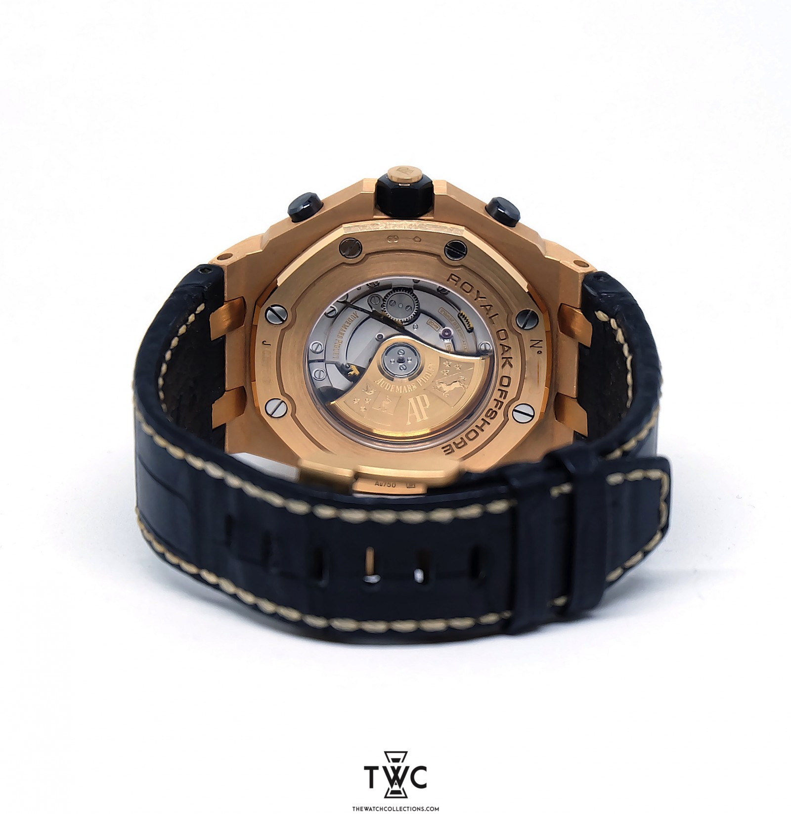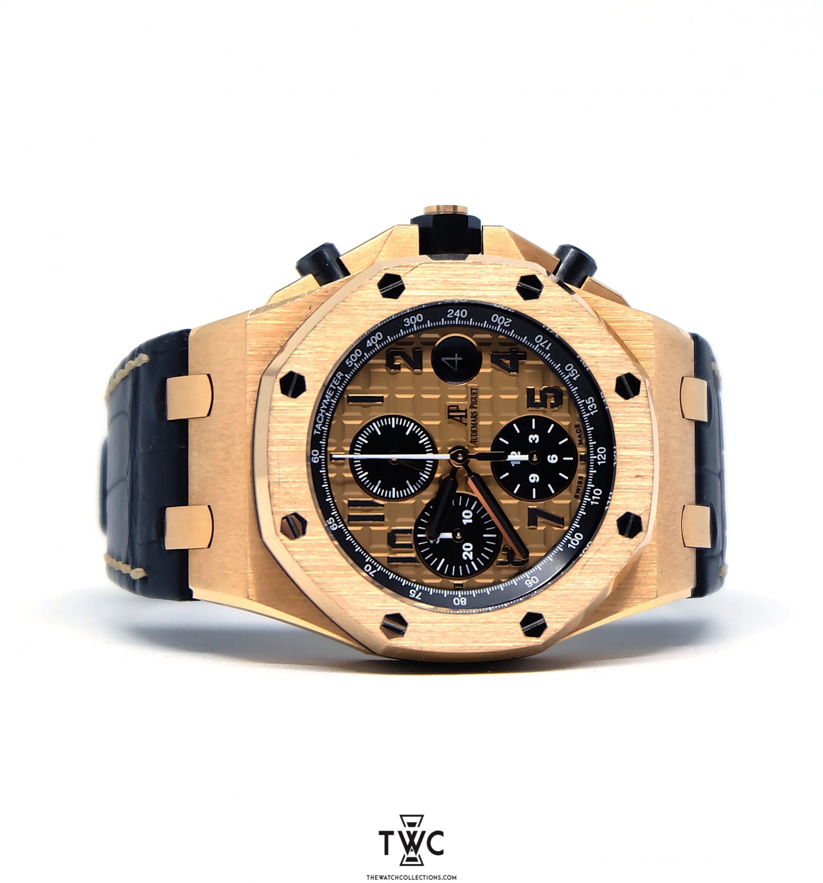 This Audemars Piguet Royal Oak Offshore in pink gold showcases the bold sporty-luxury character that defines the Offshore collection. The black “Méga Tapisserie” dial creates a striking contrast while enhancing legibility, complemented by the iconic chronograph function. With its daring design and robust in-house automatic movement, this timepiece stands as a true expression of the Royal Oak Offshore as a powerful luxury sports watch.