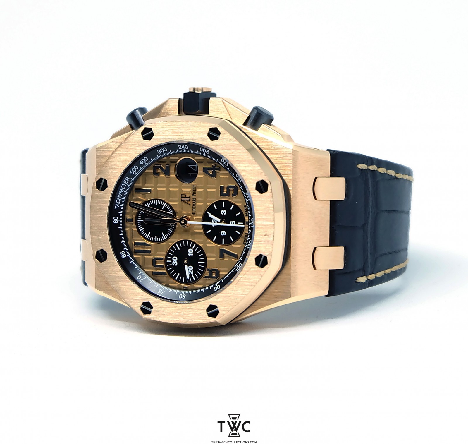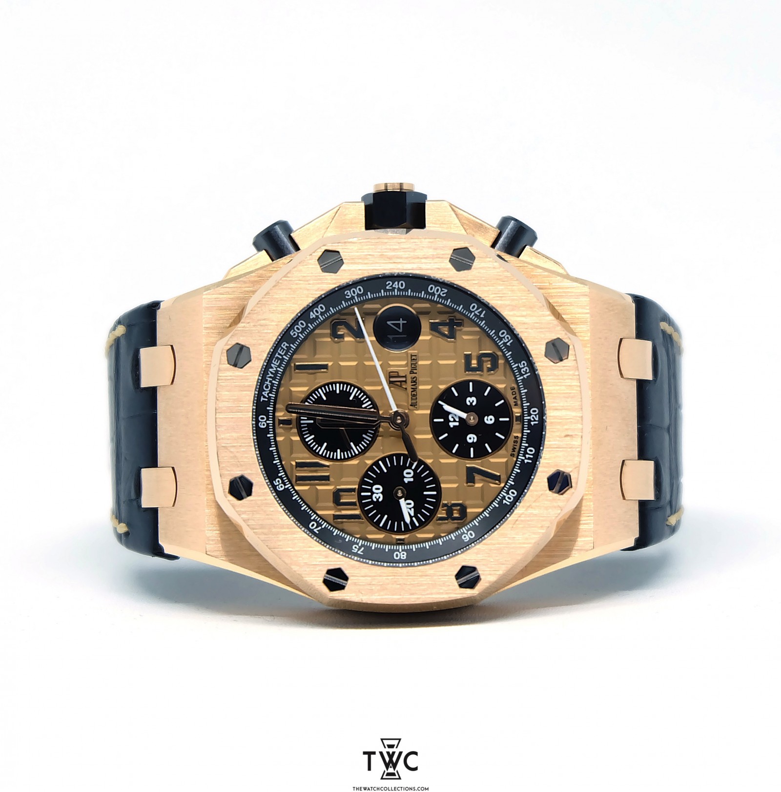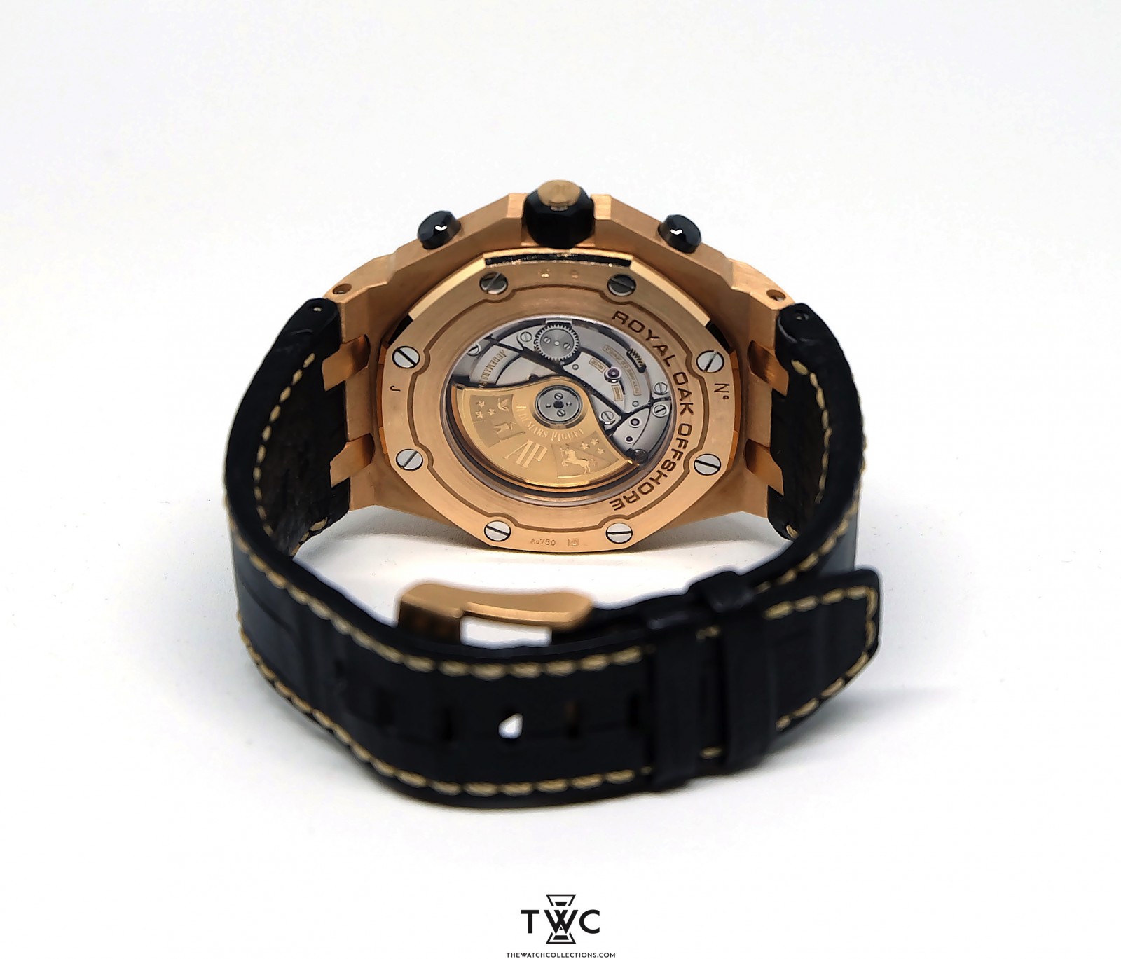 The Audemars Piguet Royal Oak Offshore Pink Gold combines elegance and sportiness with a pink gold case and black rubber strap. Equipped with a chronograph and water resistance, it is practical for daily wear.
