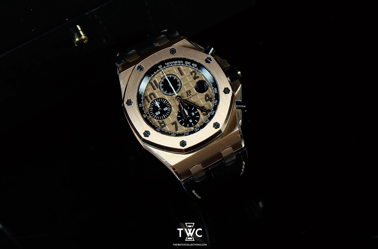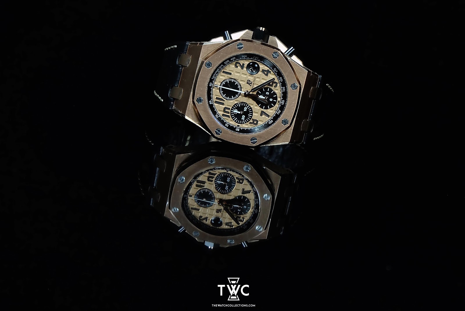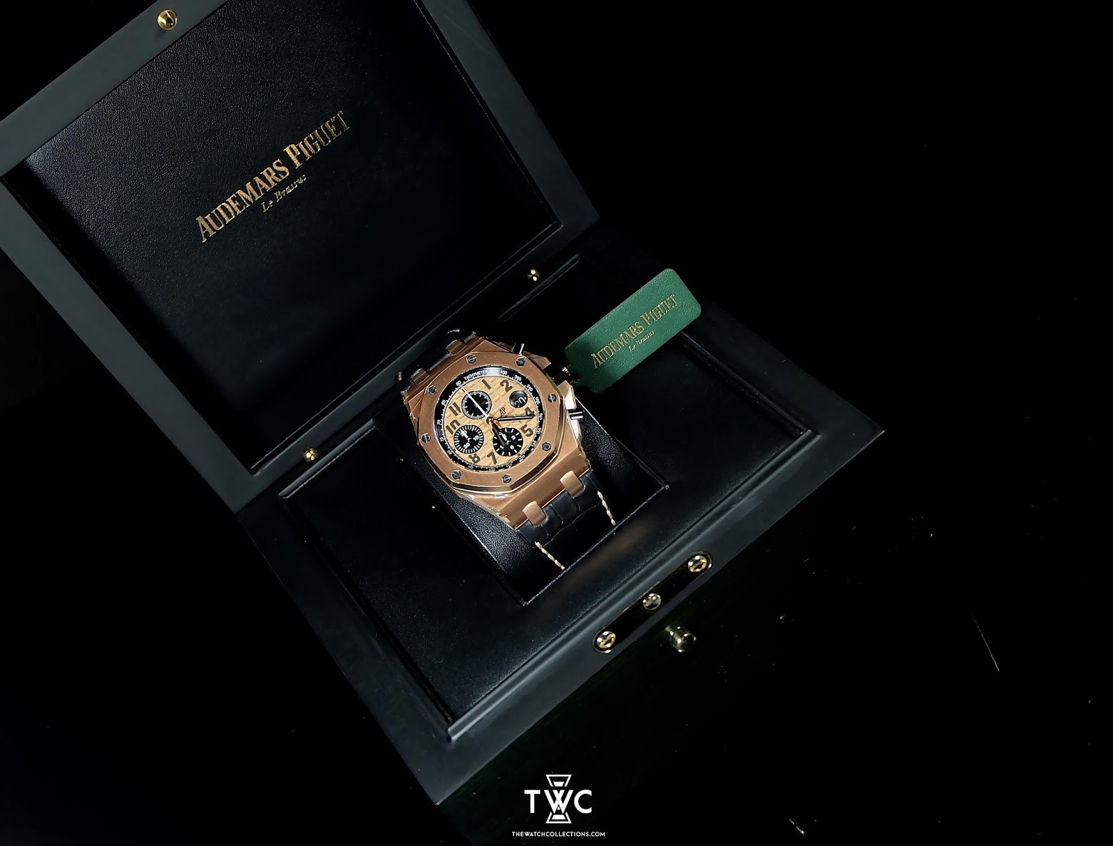 The Royal Oak Offshore Pink Gold offers a luxurious design with a rose gold case and multifunctional dial. It blends the iconic Royal Oak Offshore aesthetics with an elegant touch, perfect for collectors seeking a sporty yet sophisticated watch.
