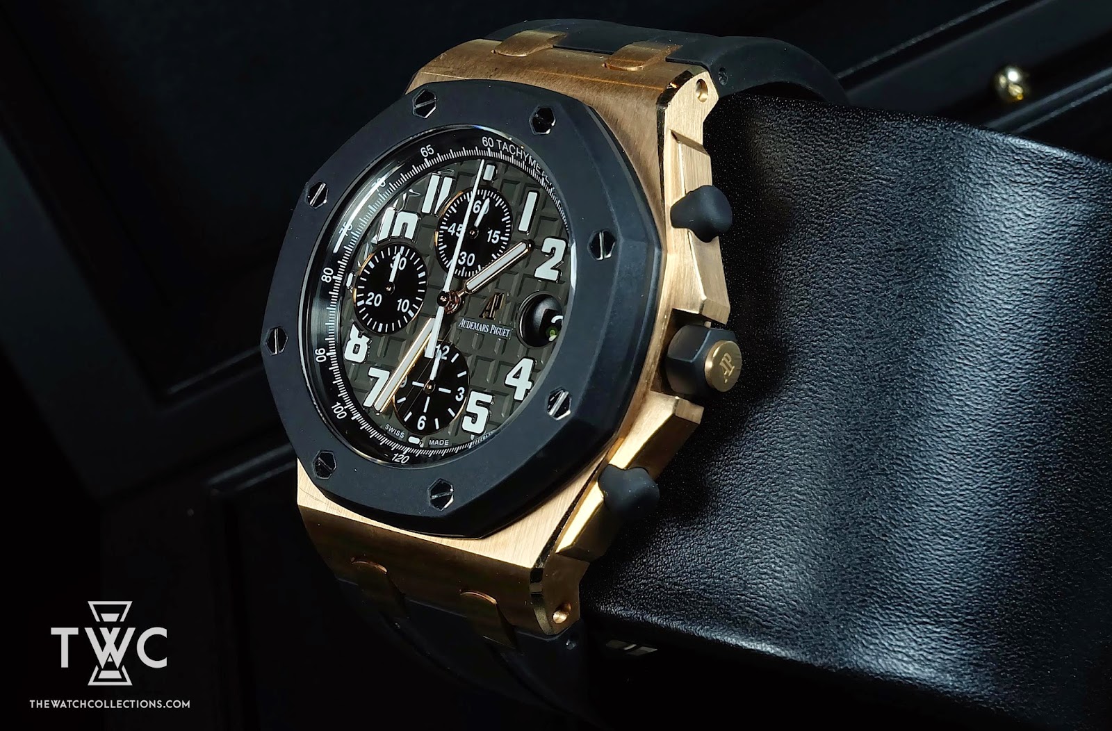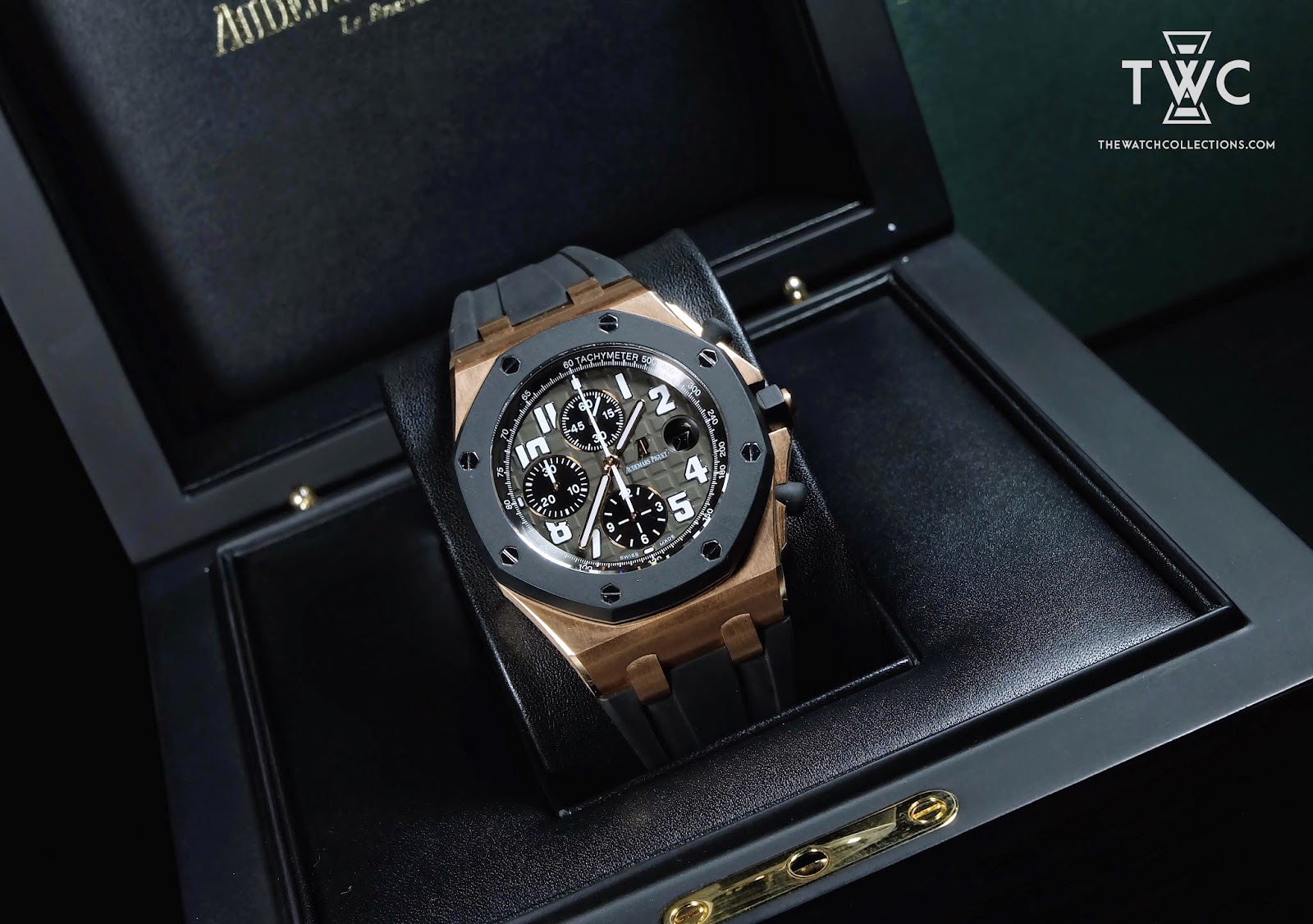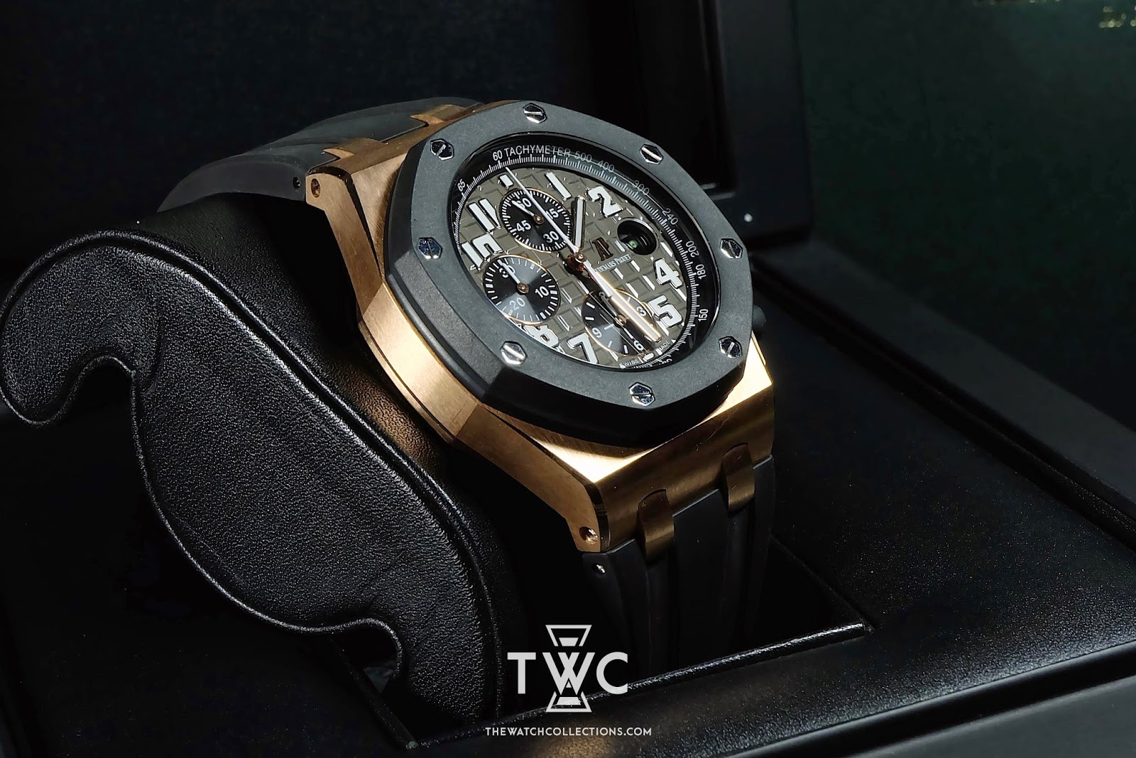 The Audemars Piguet Royal Oak Offshore Rubberclad Rose Gold combines a rose gold case with protective rubber cladding. It presents a luxurious yet sporty combination, characteristic of the Royal Oak Offshore line.