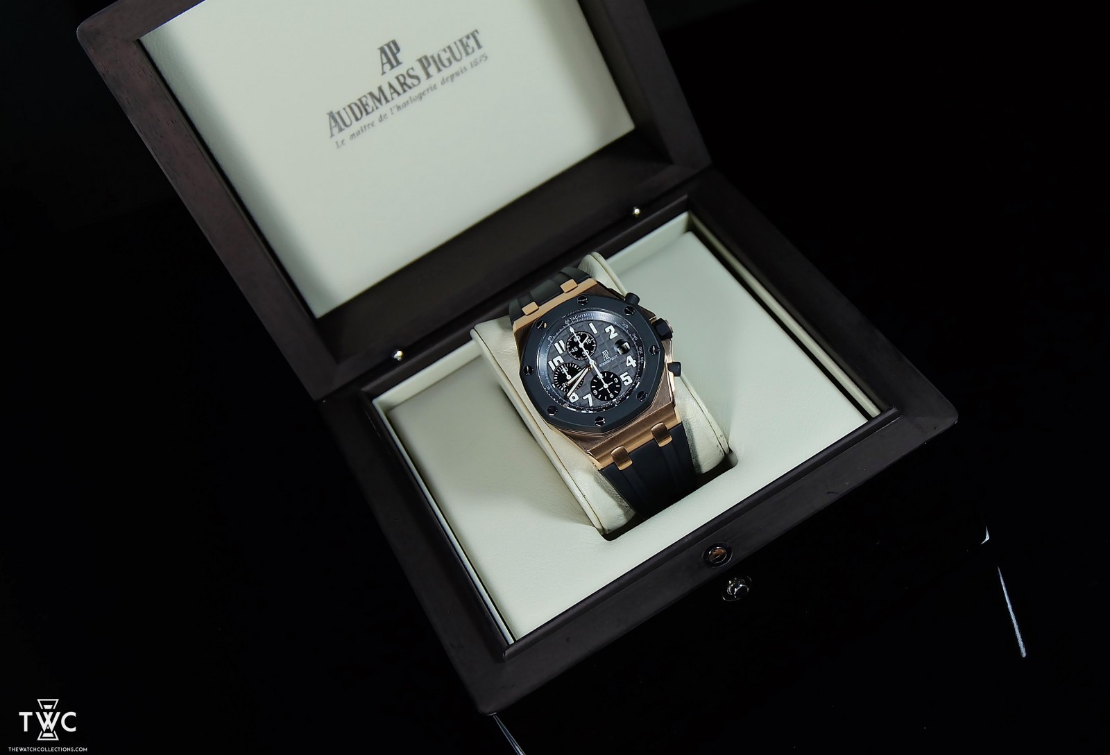 The Audemars Piguet Royal Oak Offshore Rubberclad Rose Gold offers a distinctive blend of luxury and sportiness within the Offshore collection. Its rose gold case combined with a rubberclad bezel creates a bold and instantly recognizable look. The black dial with the signature Royal Oak pattern ensures strong legibility and character. This reference is regarded as one of the most iconic and collectible Offshore models.
