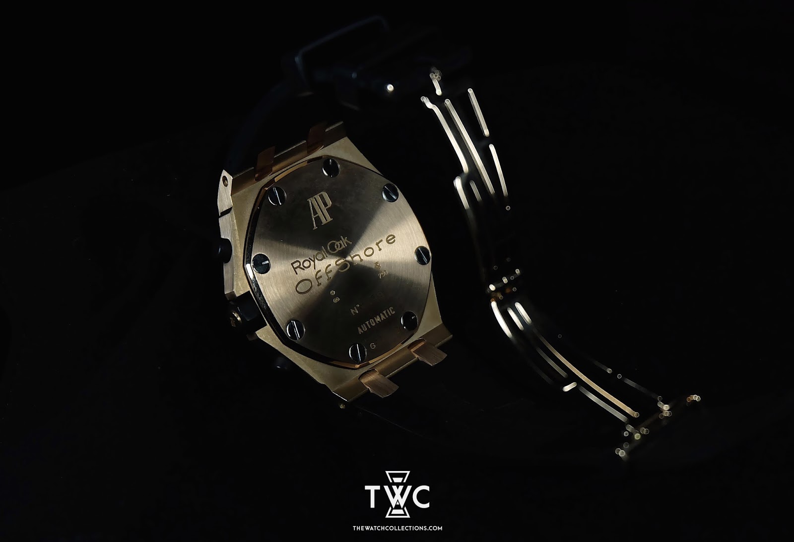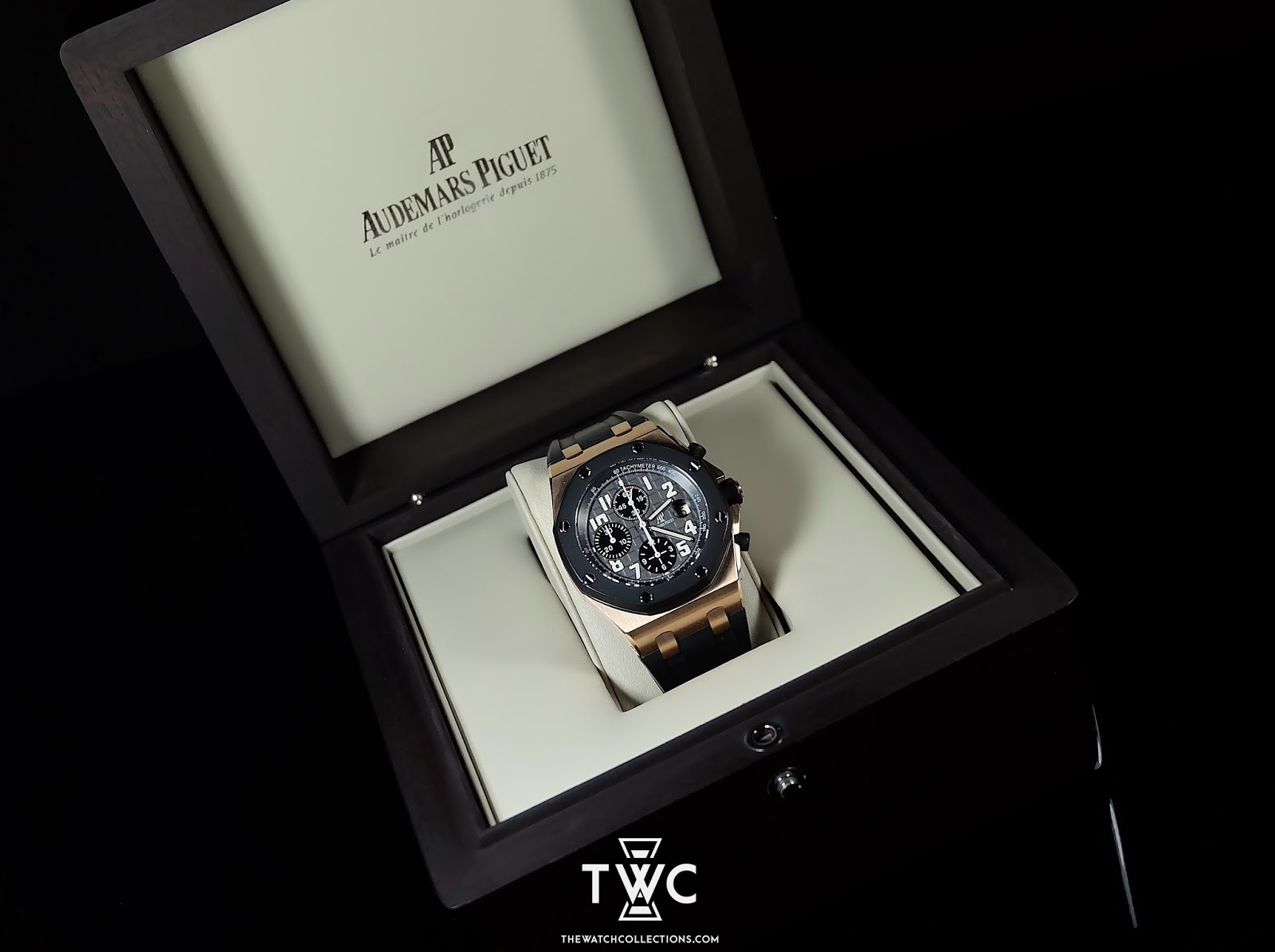 The Audemars Piguet Royal Oak Offshore Rubberclad Rose Gold is a luxury sports watch featuring a rose gold case and black rubber bezel. Its bold design and intricate dial make it highly collectible.