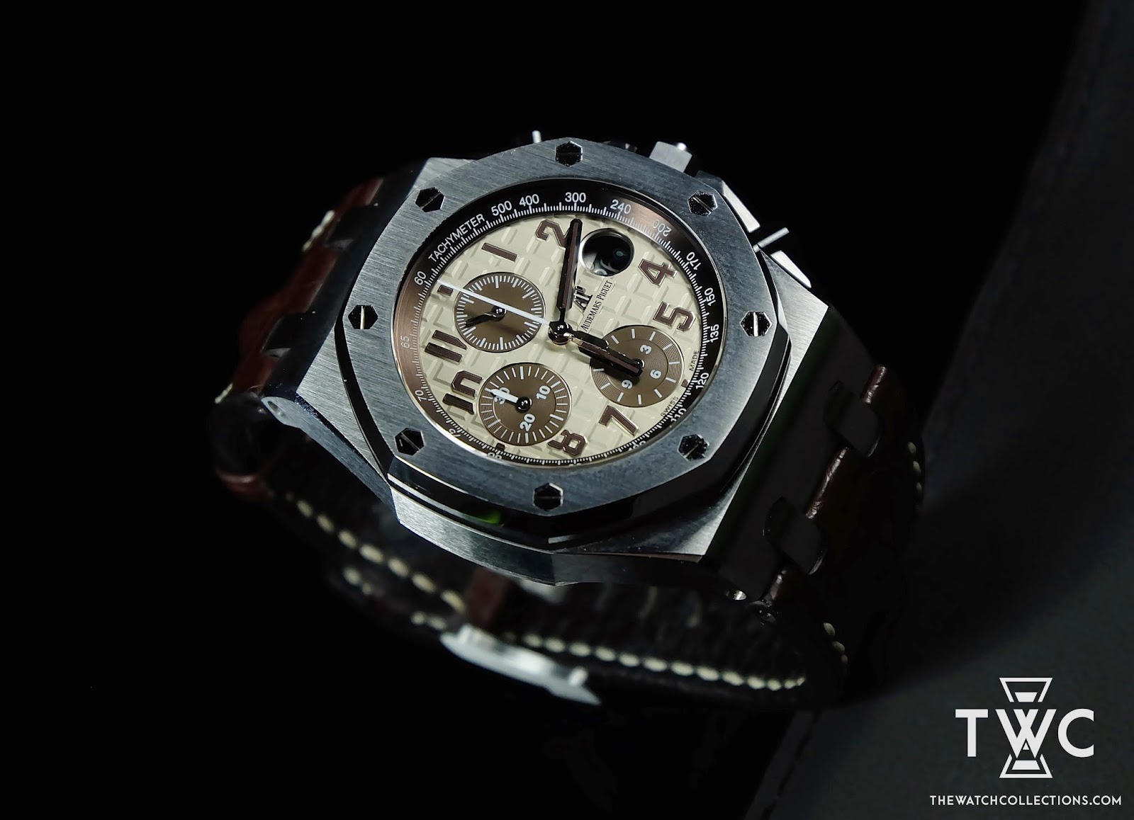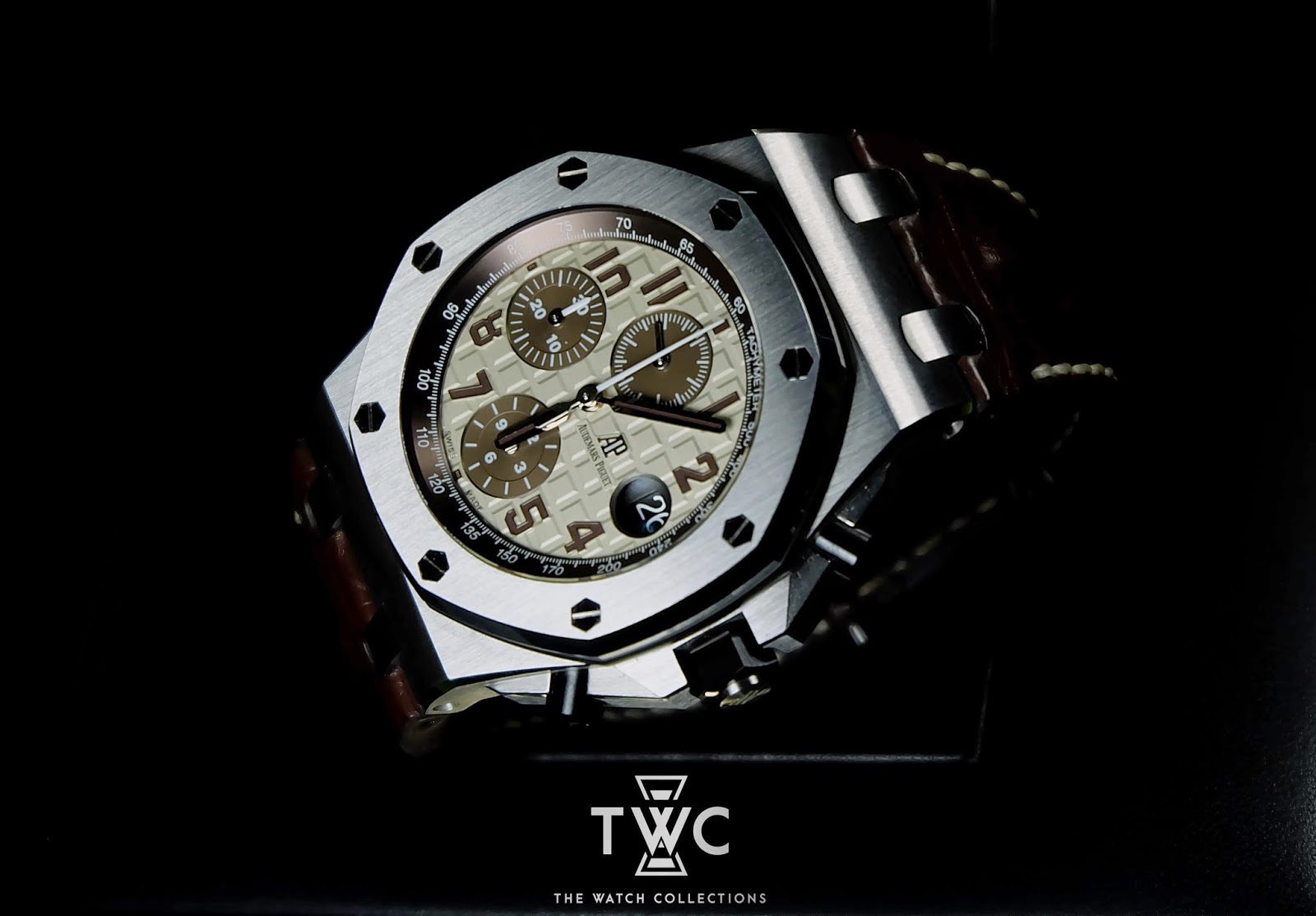 The Audemars Piguet Royal Oak Offshore Safari ā€œIā€ features a masculine and sporty design, combining a stainless steel case with an exotic safari brown dial. The hands and indices offer clear readability. Its rubber bracelet ensures daily comfort. This model is highly appreciated by collectors for its unique design and high collectible value.