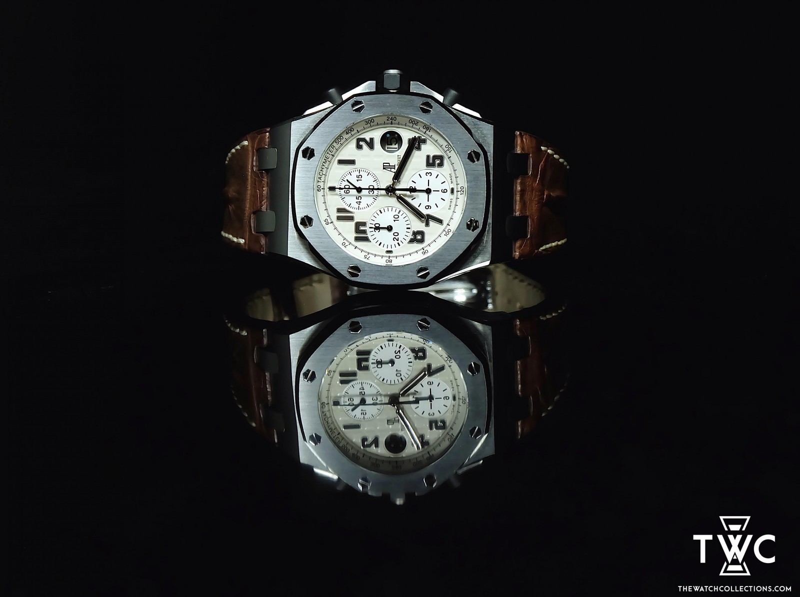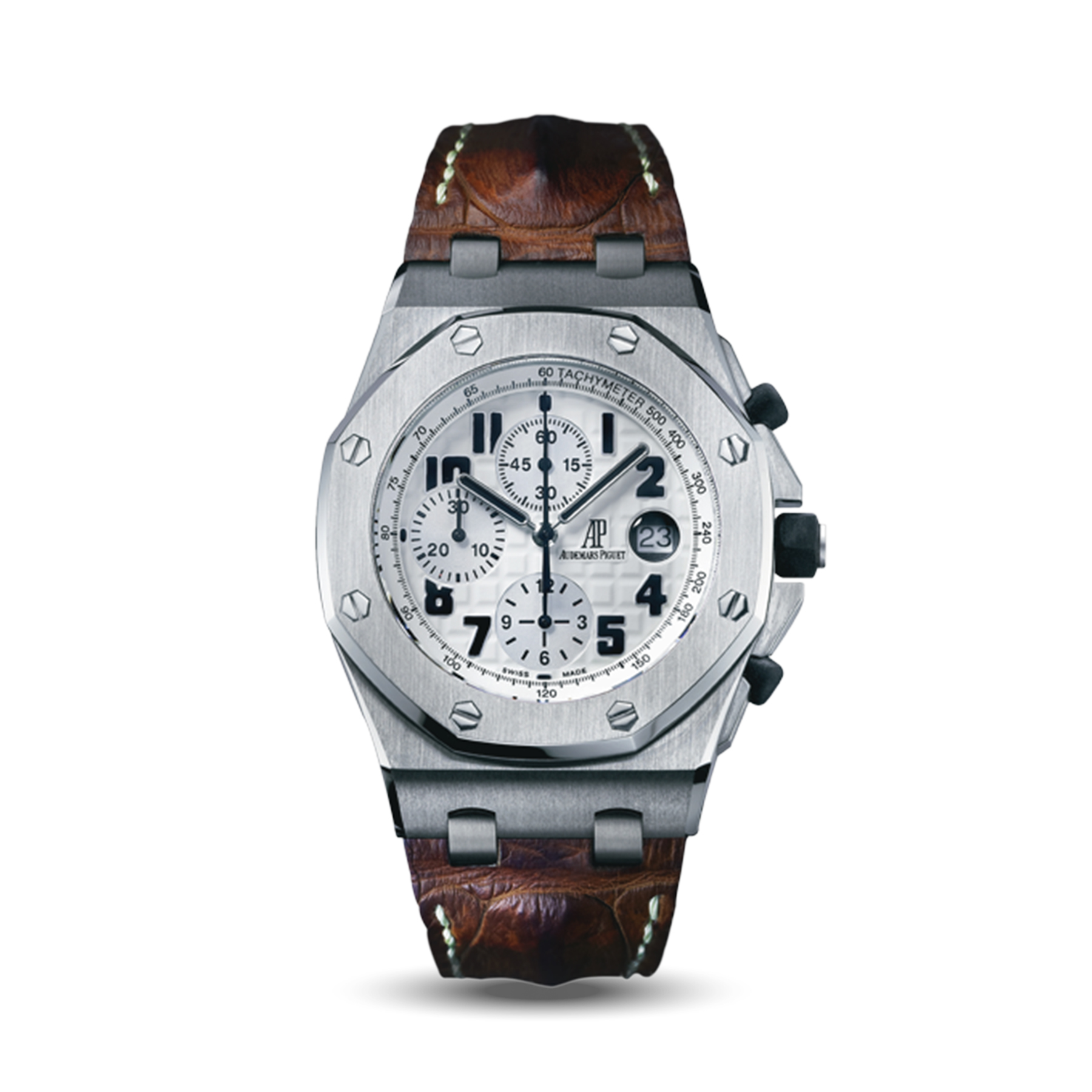 The Audemars Piguet Royal Oak Offshore Safari is one of the most iconic variants within the Royal Oak Offshore collection, known for its bold and masculine character. Its stainless steel case combined with the distinctive safari-toned dial creates a highly recognizable appearance. The strong dial layout paired with chronograph functionality offers both presence and practicality. This model is highly regarded by collectors as a modern classic with a unique identity.