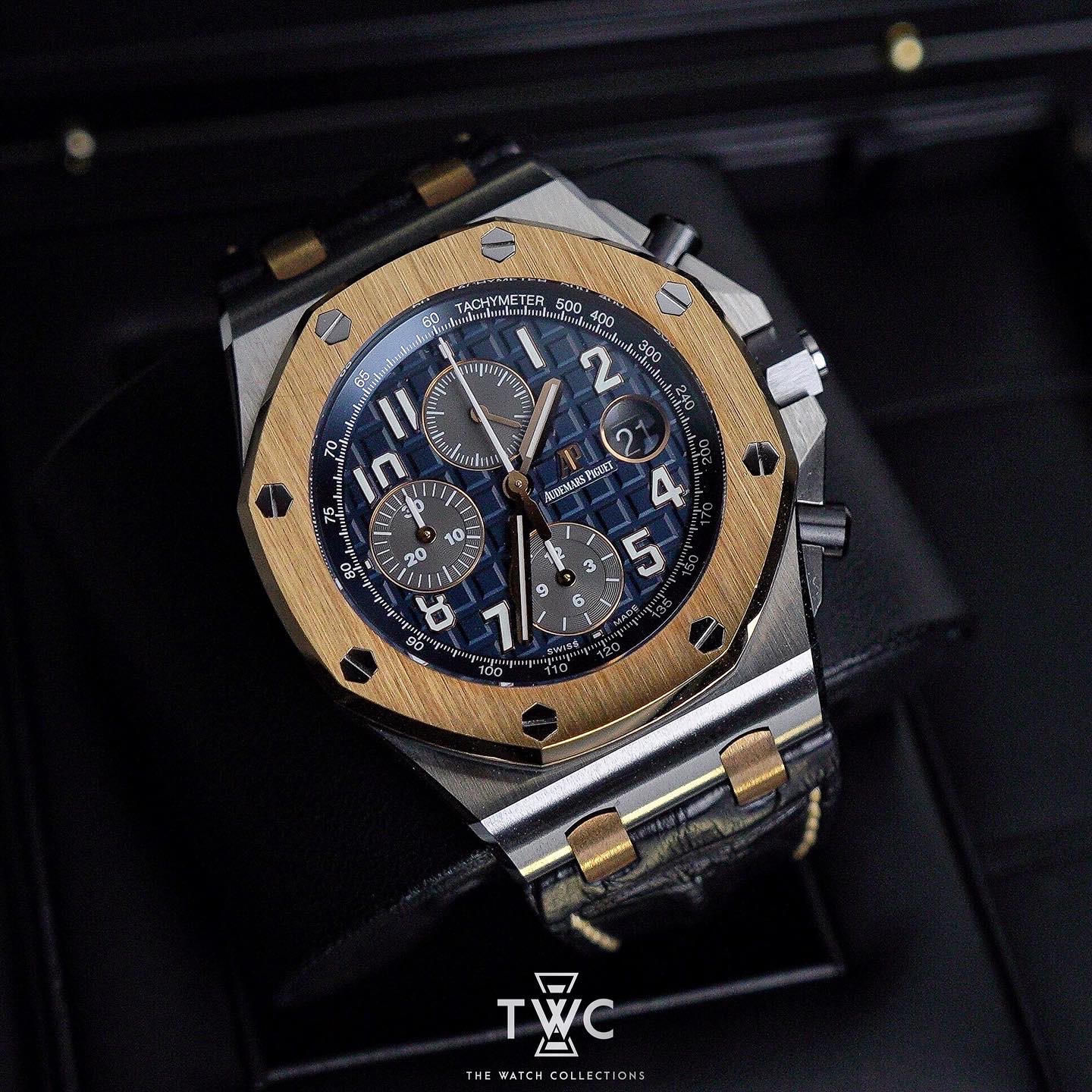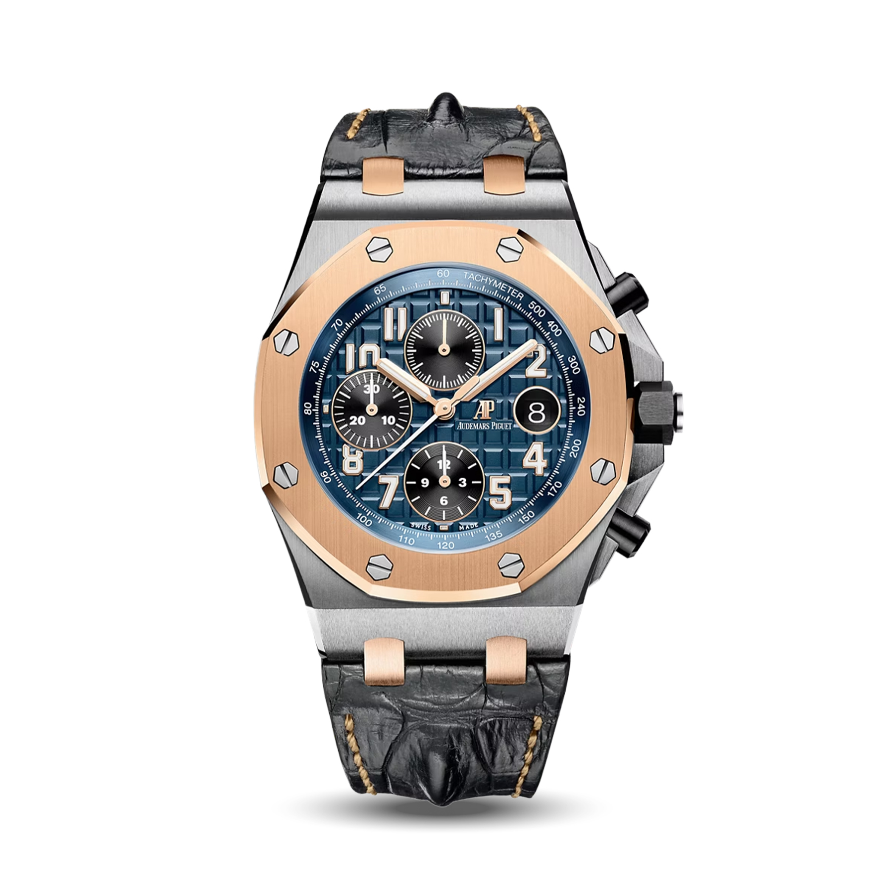 The Royal Oak Offshore Selfwinding Chronograph Bucherer Blue features a blue dial with stainless steel case. Exclusive, sporty, and appealing to collectors.