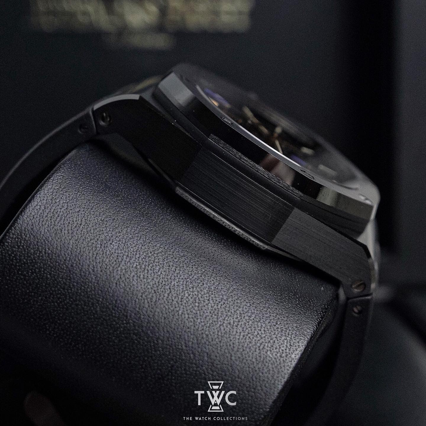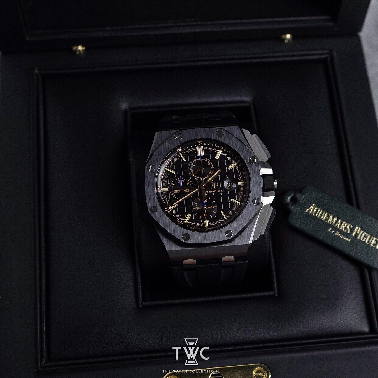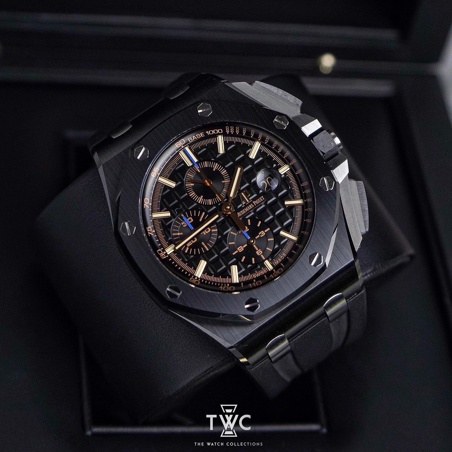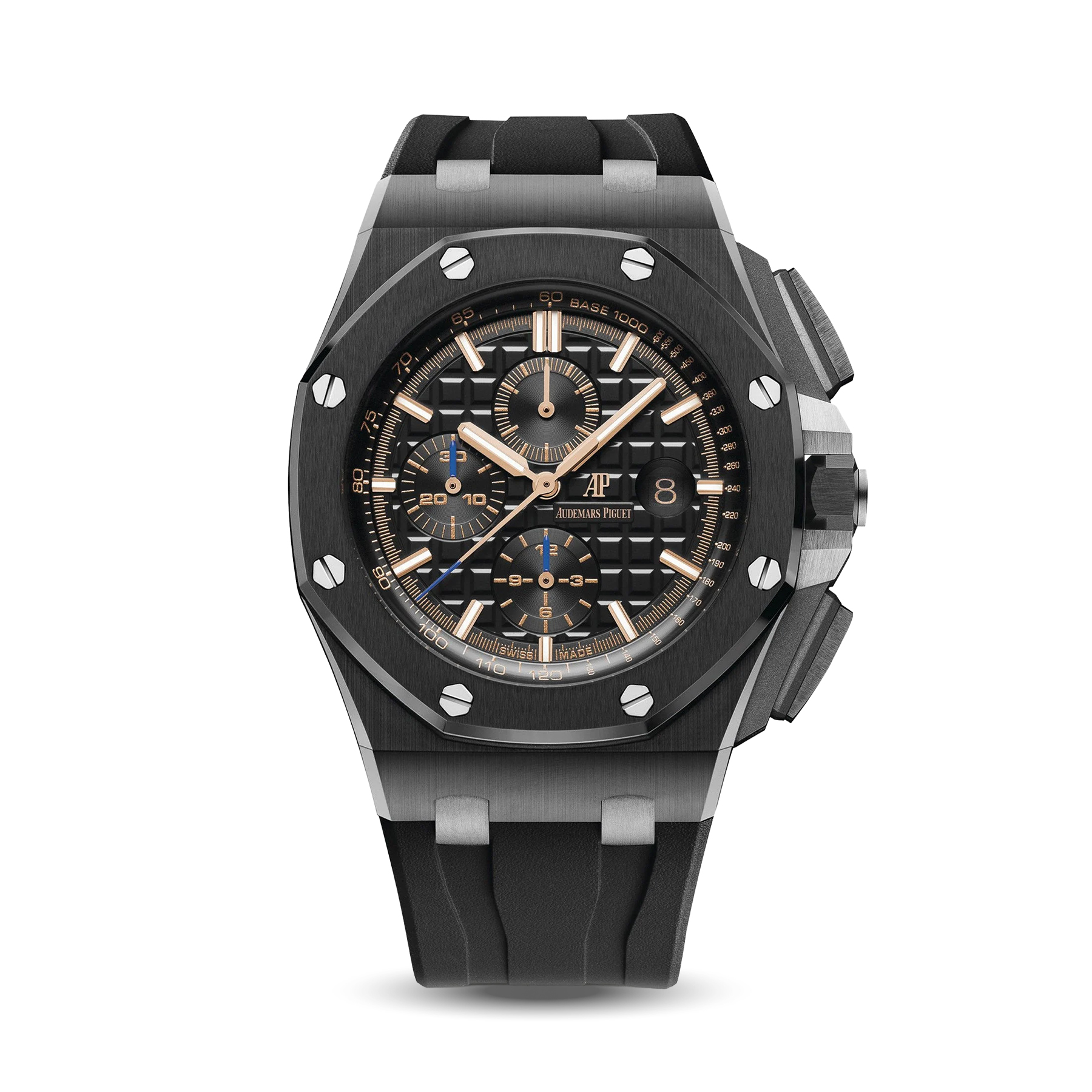 The Royal Oak Offshore Selfwinding Chronograph Ceramic features a black ceramic case with complex dial and rubber strap. Sporty yet exclusive.