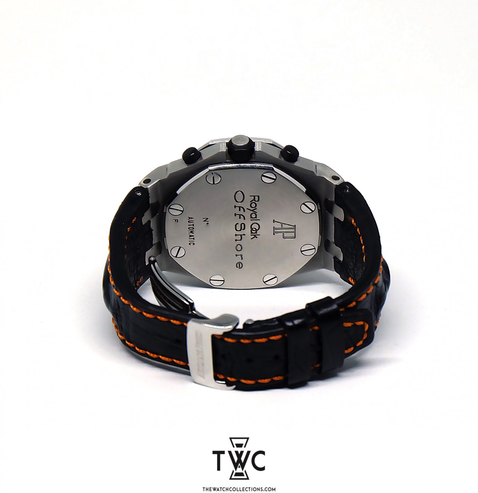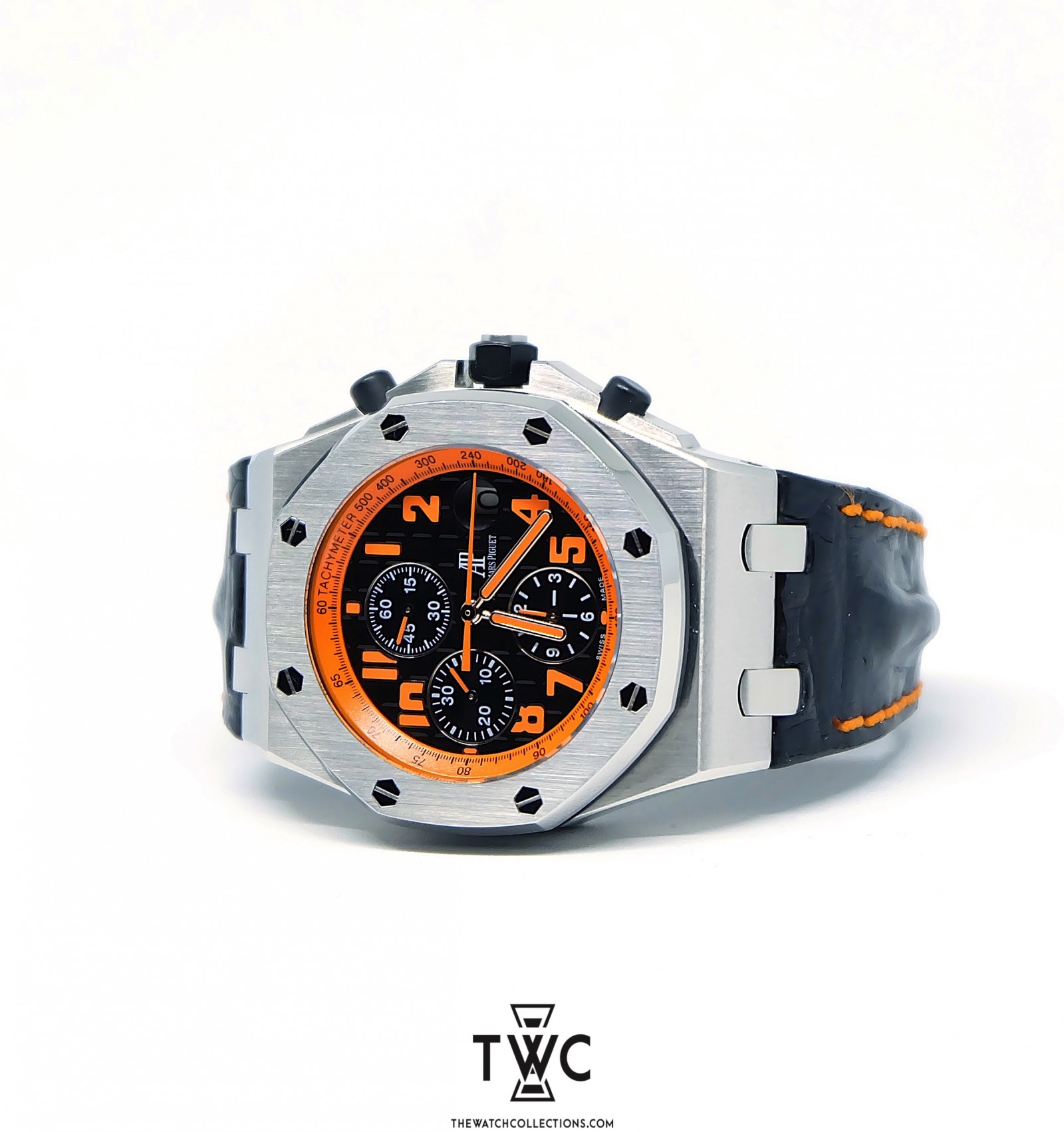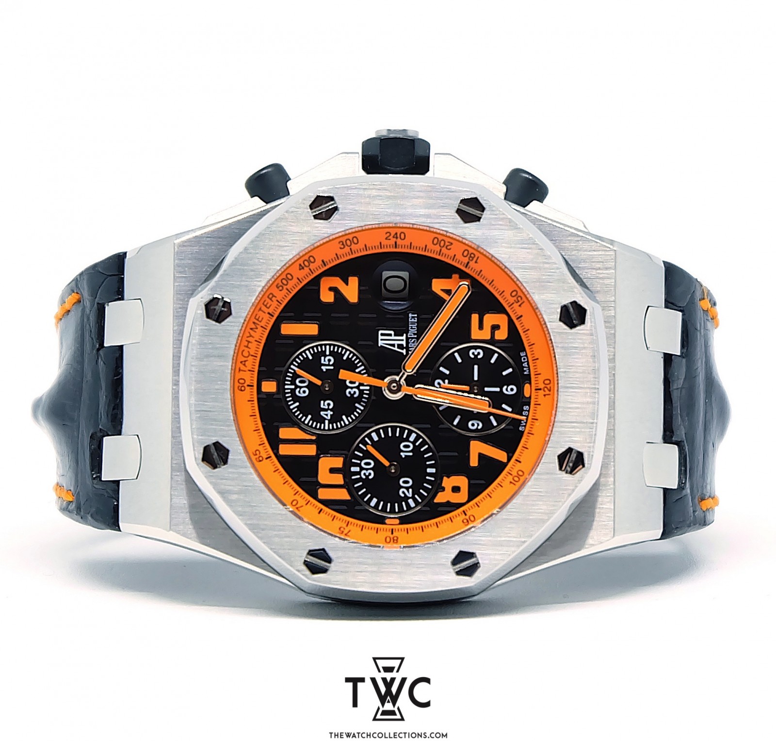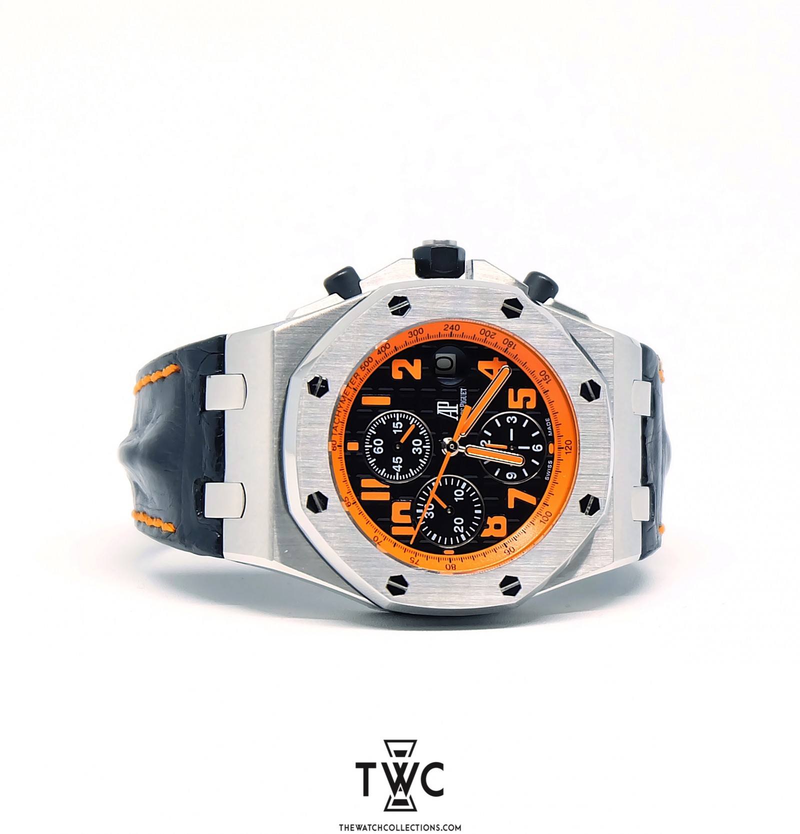 The Royal Oak Offshore Volcano ‘F’ features a stainless steel case with sporty red and black dial and rubber strap. Exclusive and modern.