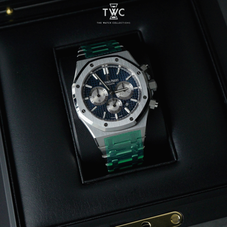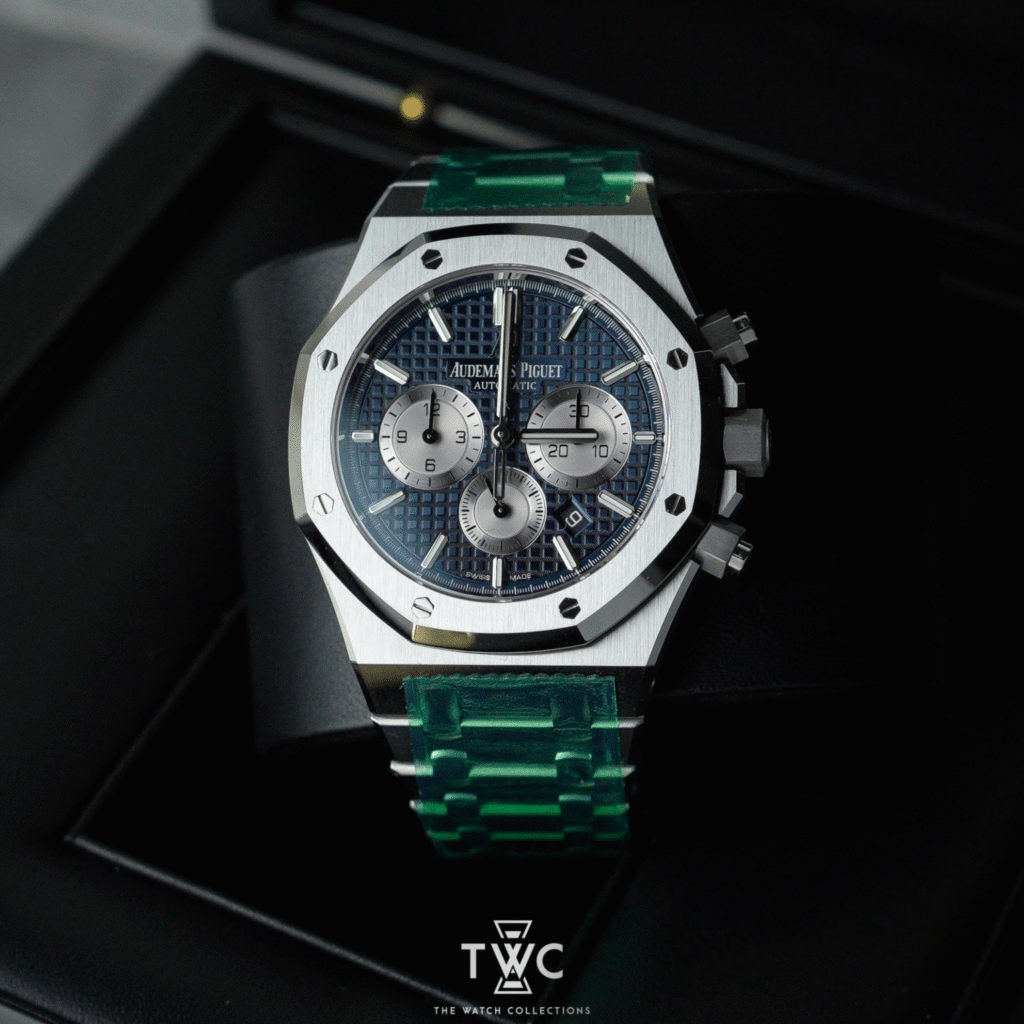 The Royal Oak Selfwinding Chronograph features a blue dial with precise chronograph accents. Its 41mm stainless steel case offers a sporty and elegant look. Perfect for luxury watch enthusiasts appreciating classic design and modern functionality.