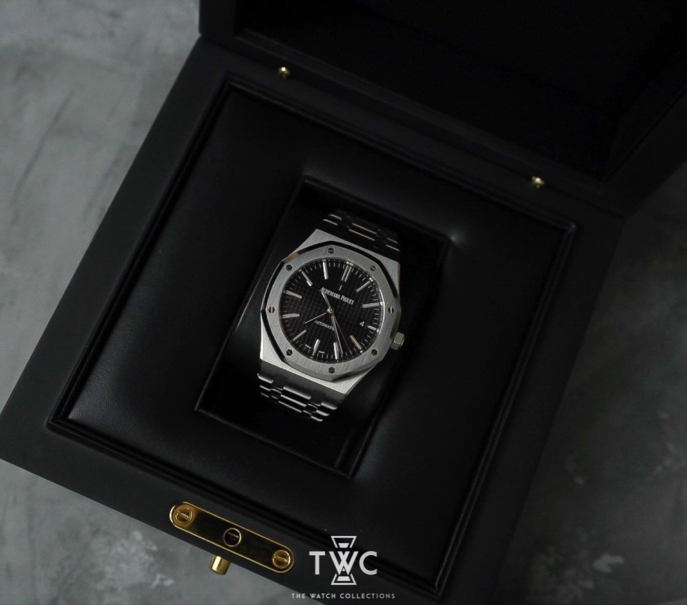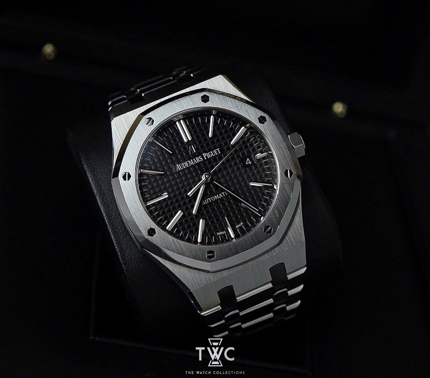 This Audemars Piguet Royal Oak 15400ST showcases the iconic Royal Oak design in stainless steel, featuring a bold black “Grande Tapisserie” dial with a sporty yet refined character. The 41mm case offers a modern proportion, paired with the instantly recognizable integrated Royal Oak bracelet. Powered by an in-house automatic movement, this discontinued model stands as a highly desirable classic with strong collectibility.