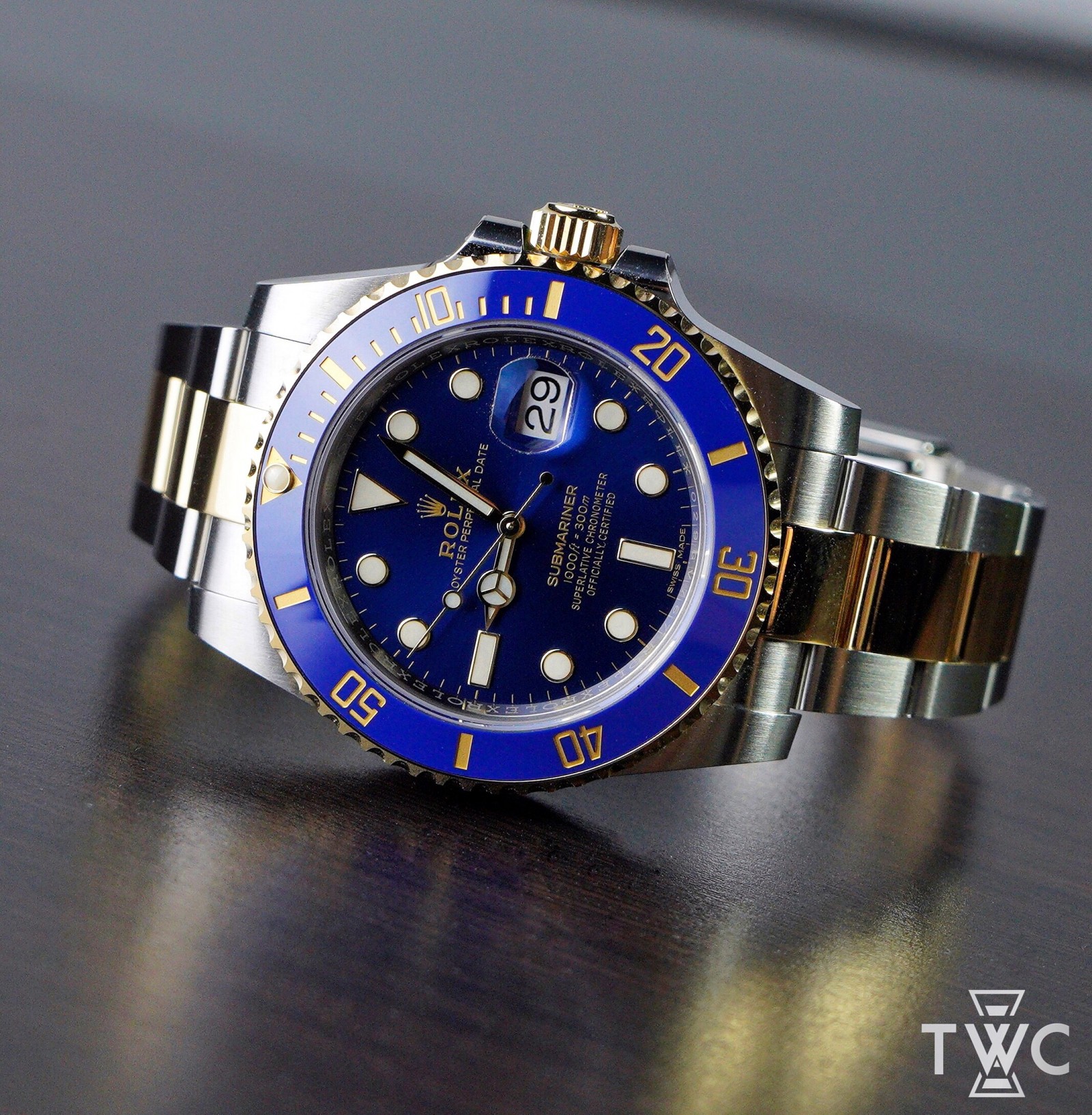 The Rolex Submariner Date two-tone features an elegant blue sunburst dial with a contrasting blue bezel. Its 40mm stainless steel and yellow gold case adds luxury. Perfect for diving watch enthusiasts who value style and functionality.