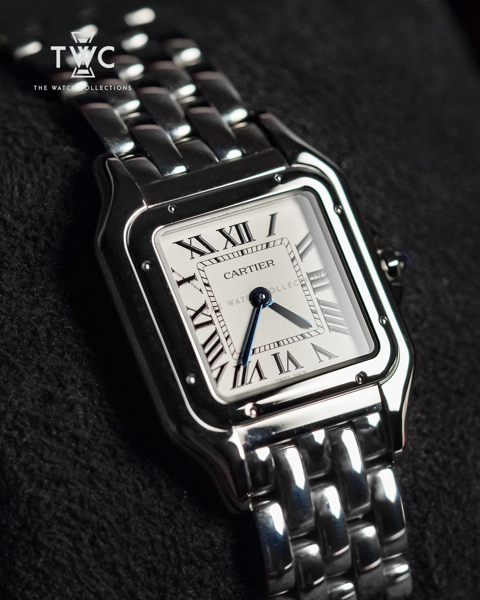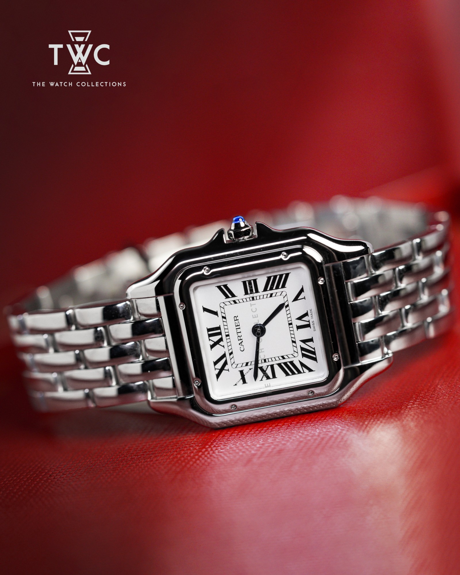 The Cartier Panthère de Cartier Medium embodies timeless elegance with its slim stainless steel case and white dial featuring classic Roman numerals. The medium proportions strike a perfect balance between jewelry and timepiece, making it ideal for everyday wear. Its supple steel bracelet enhances the feminine and luxurious appeal. A true icon that reflects Cartier’s refined Parisian style.